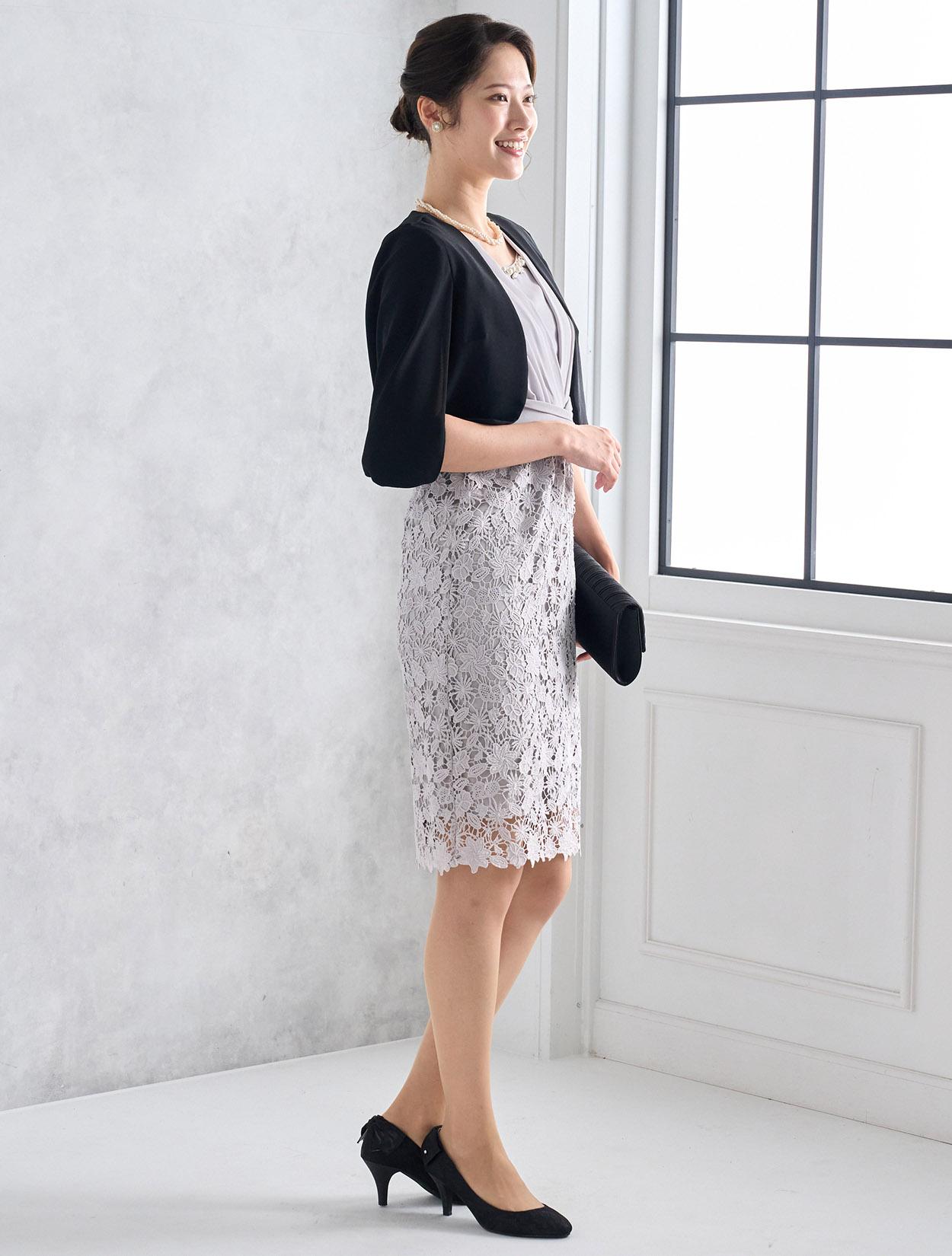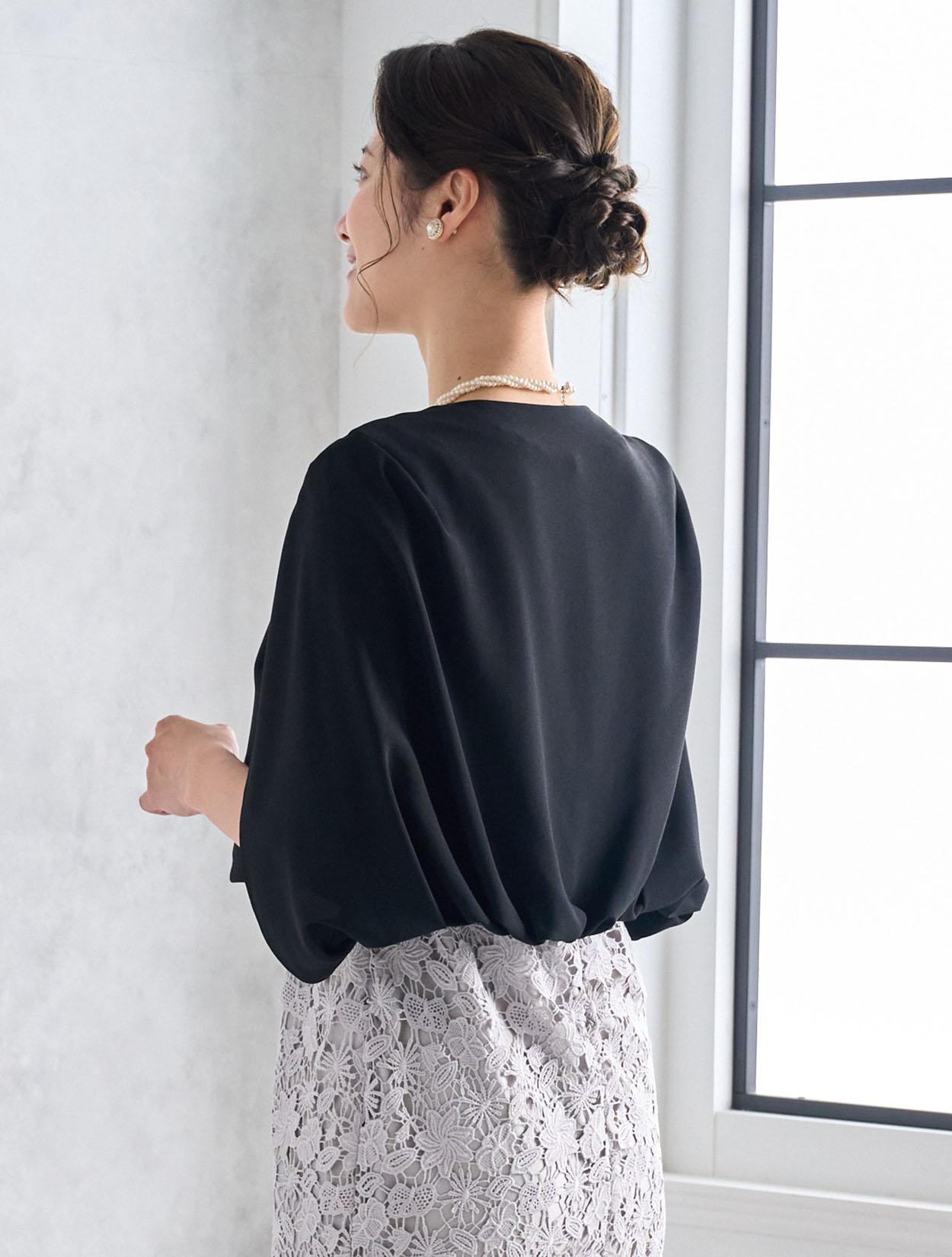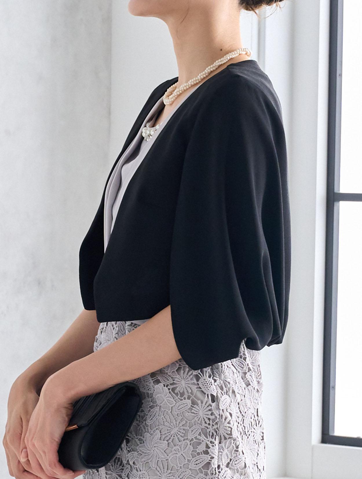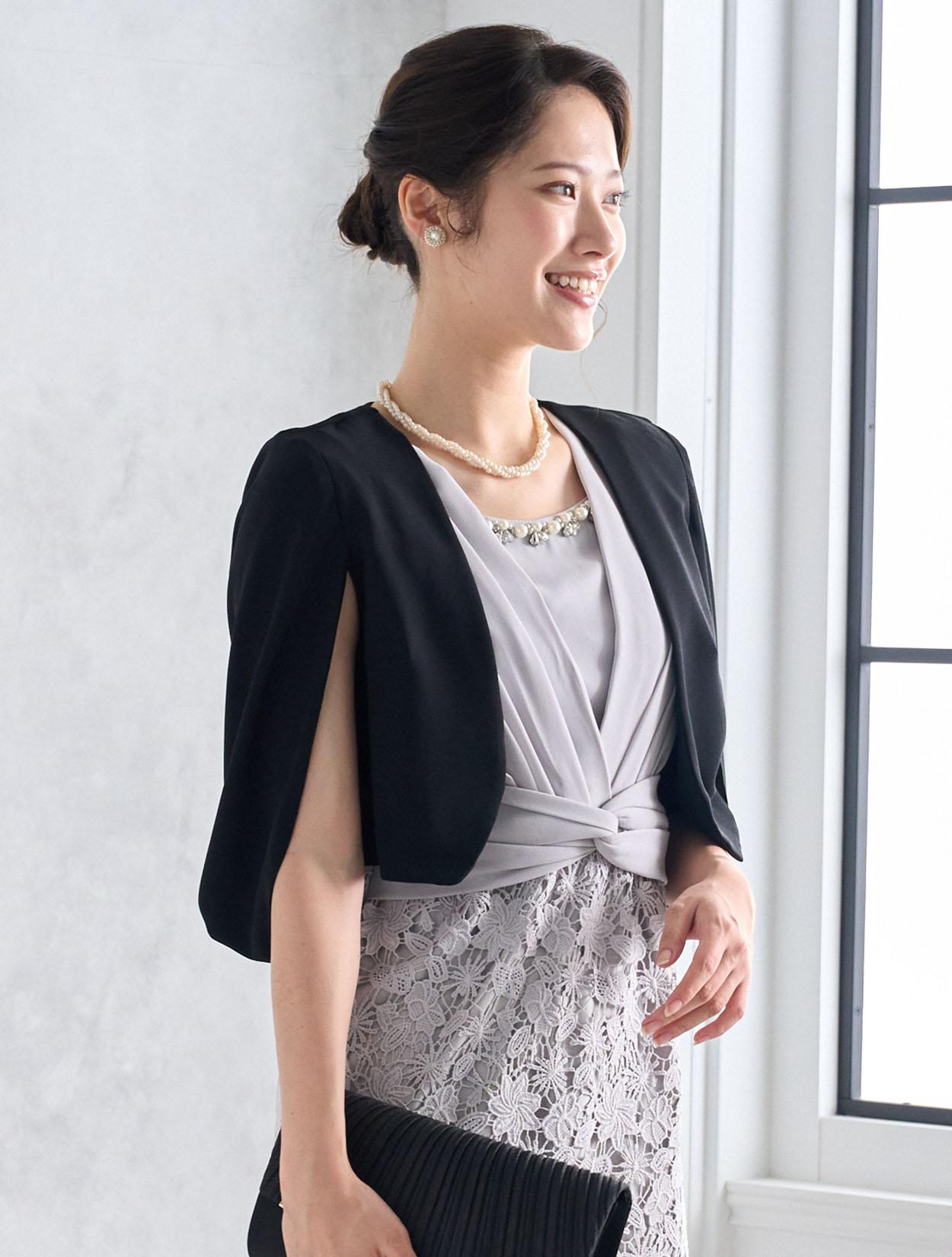 ケープ風の羽織を合わせたきちんと感のあるコーディネート。ブラックの差し色が全体のメリハリアップ。大人っぽい印象で30代のご親族ドレスとしても人気です。