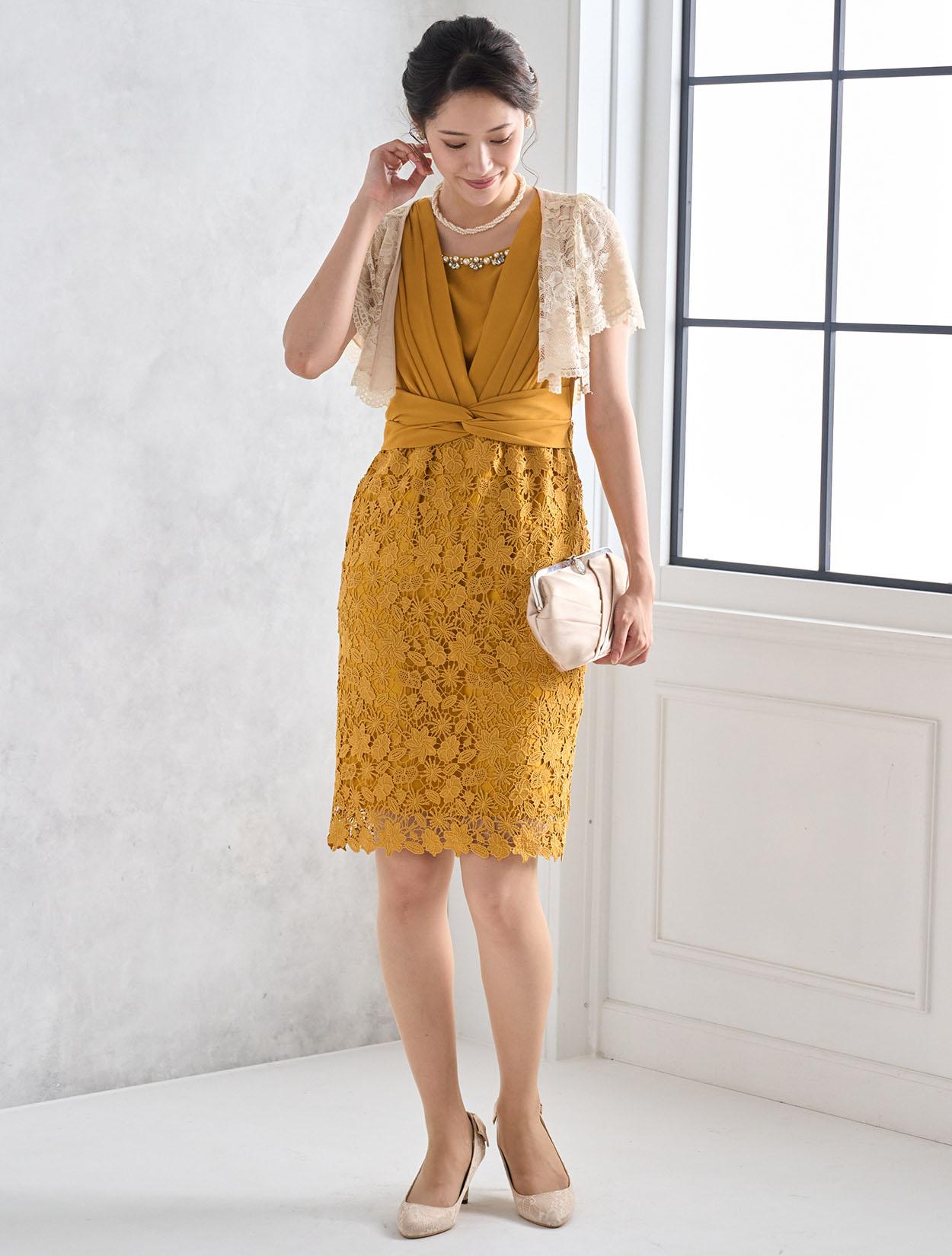 肩に入れたタックでカシュクールのようなVラインを作ったデザインは、上半身をすっきり見せてくれます。ウエストのクロスポイントや、広がらないタイトスカートは、全体をミニマルに着?せして見えるドレスです。大人っぽい印象のデザインですが、スカートに使われたレースがフェミニンさをプラスしてくれます。タイトドレスは周りと被りずらいのも嬉しいポイント。ビジューが付いた程よく開いた首元は、首が短いのが悩みの方でもネックレスなしでキレイに着こなせます。