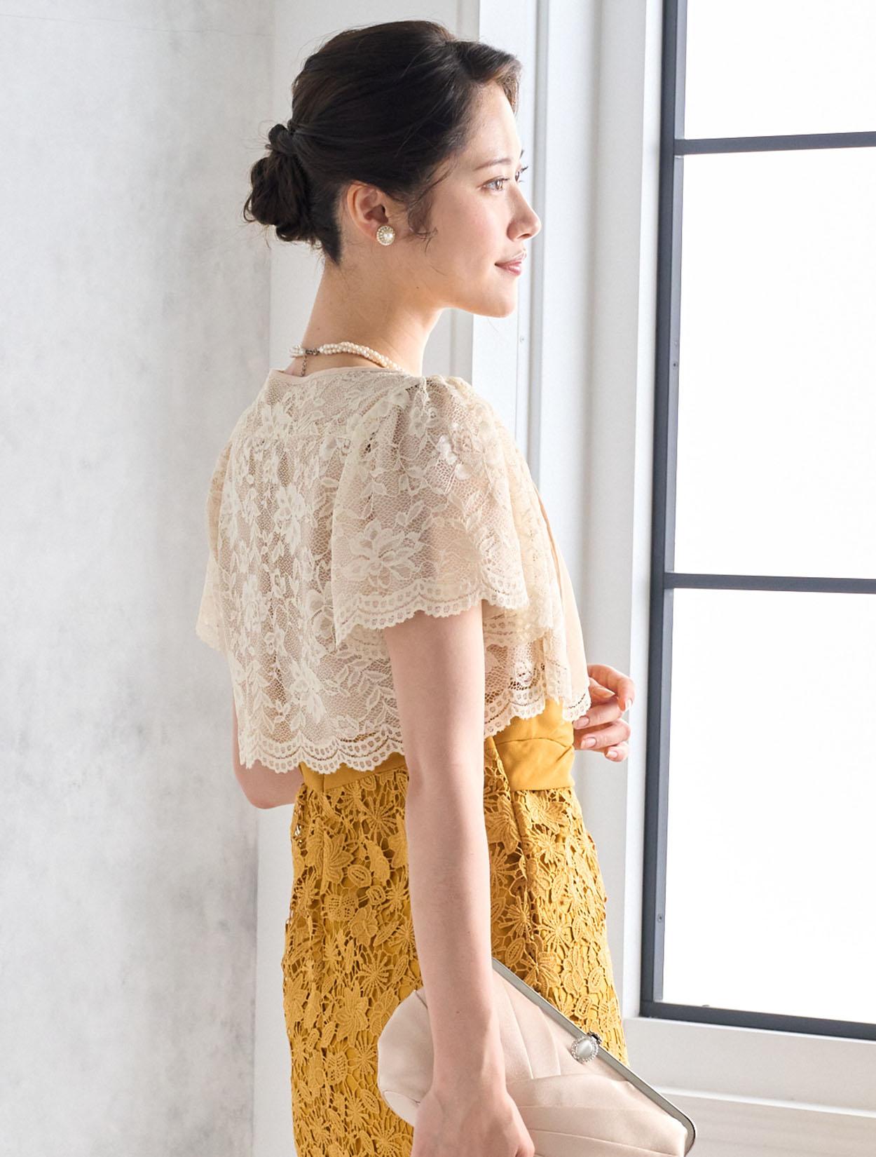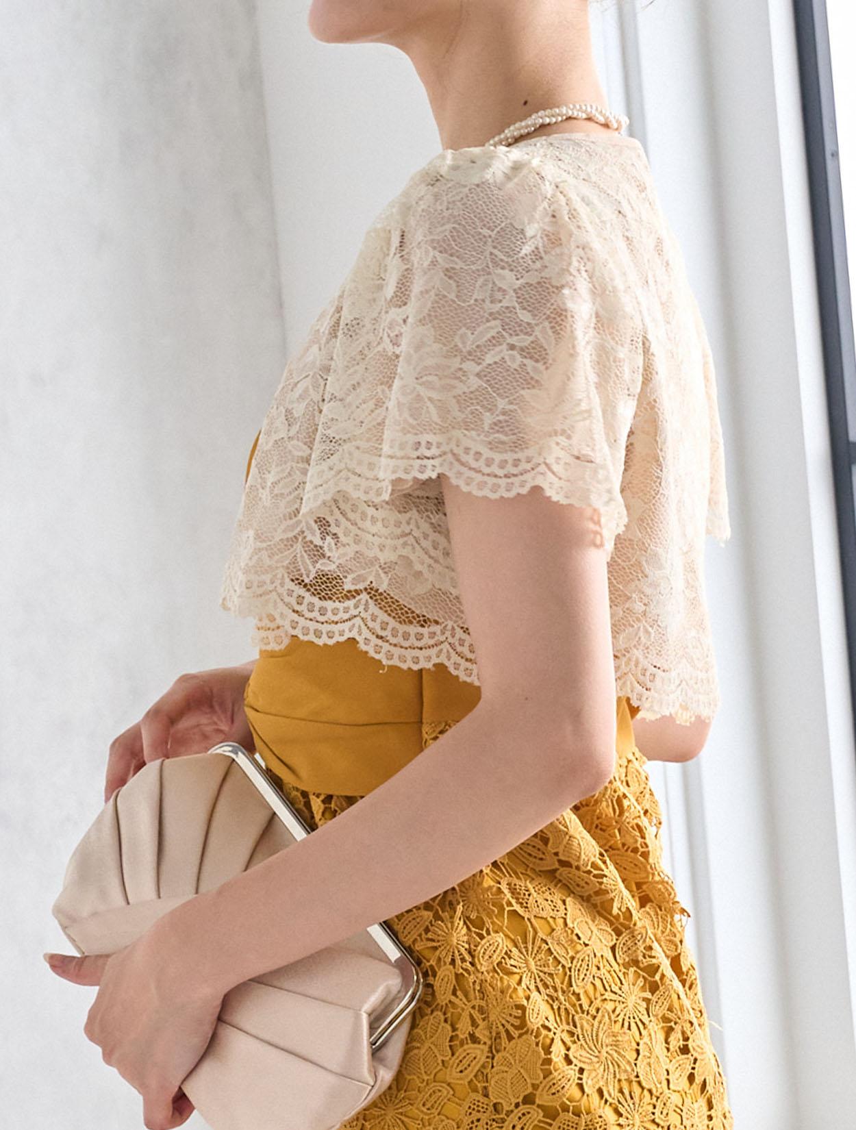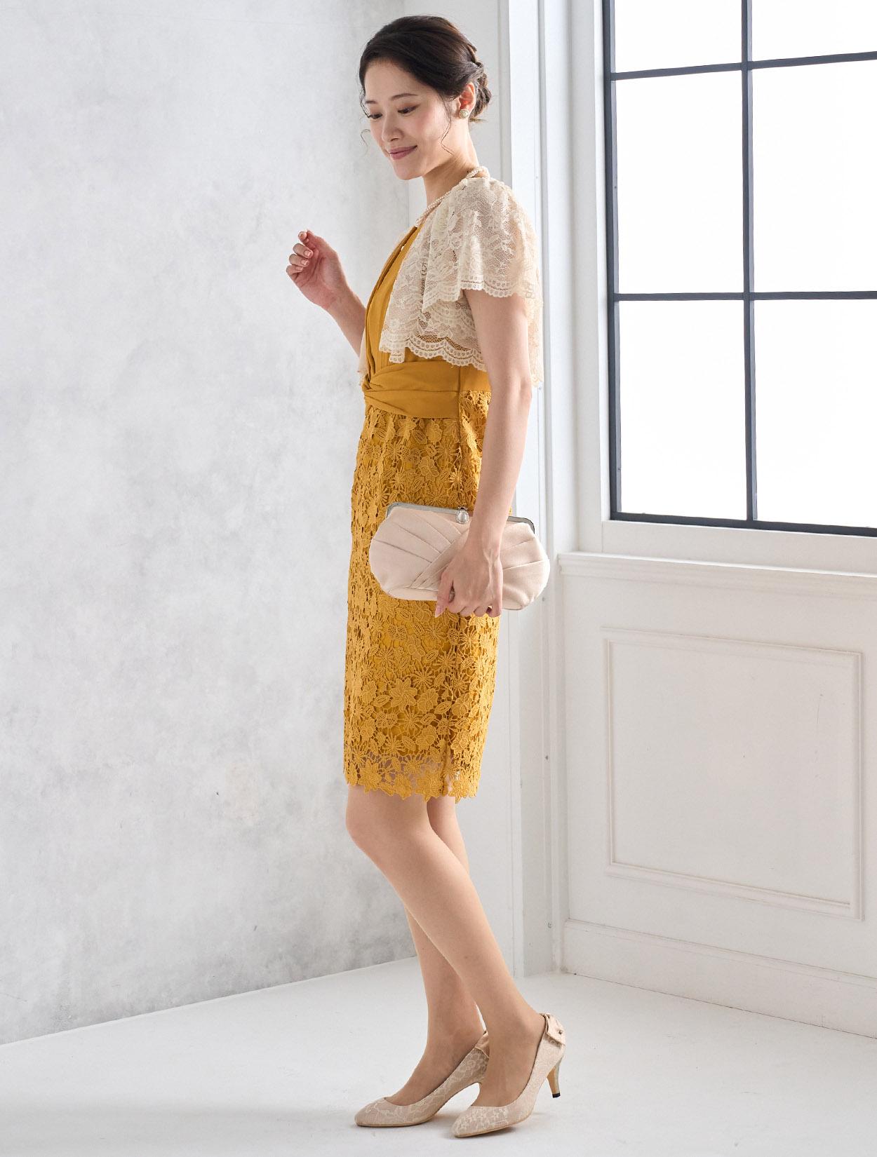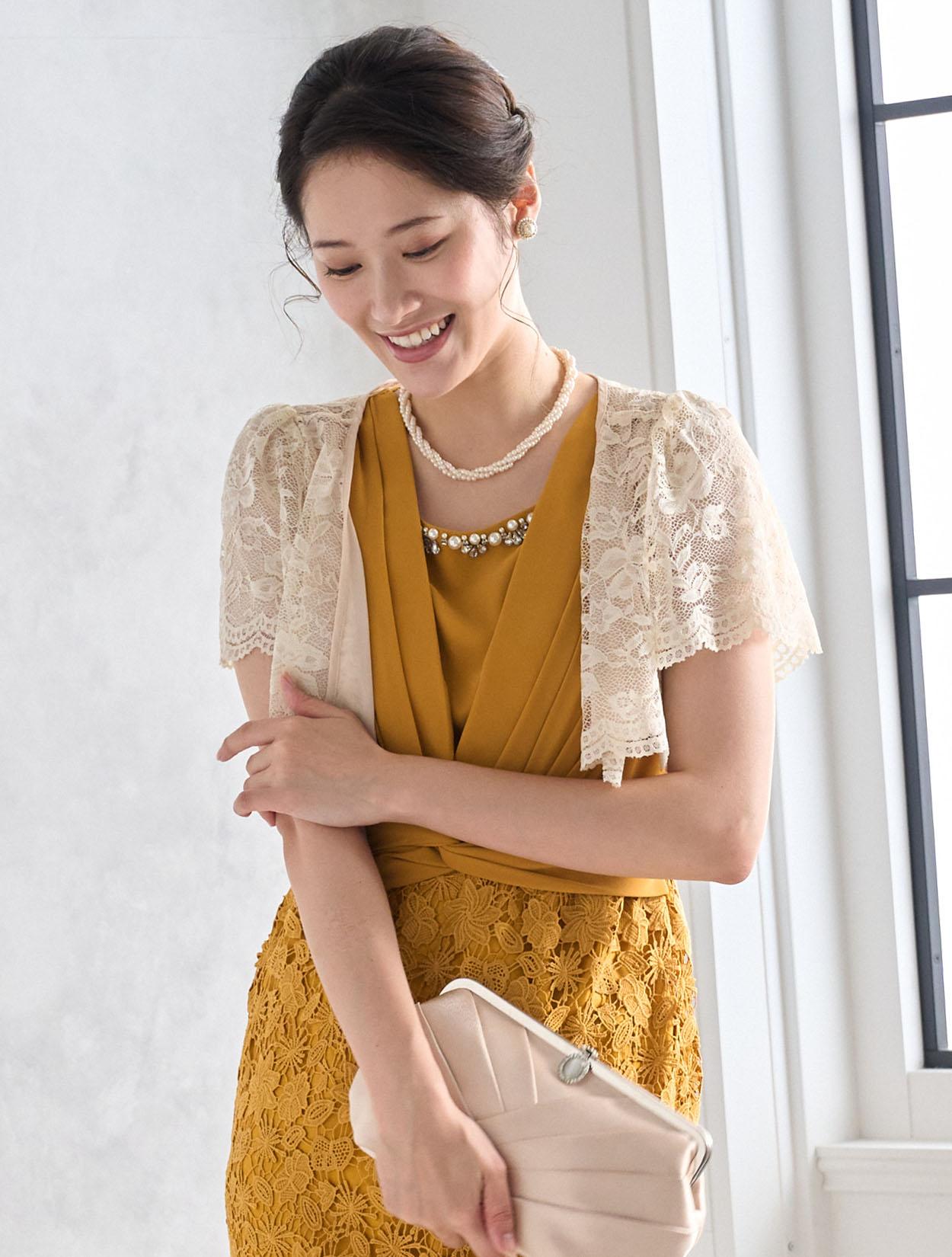 大人っぽいタイト系ドレスにレースのボレロを合わせた甘辛コーデ。ボレロはリバーシブルなので、レースならフェミニンに、シフォンならシンプルにお好みの着こなしができます。