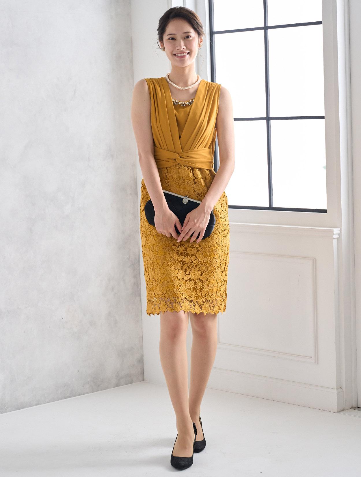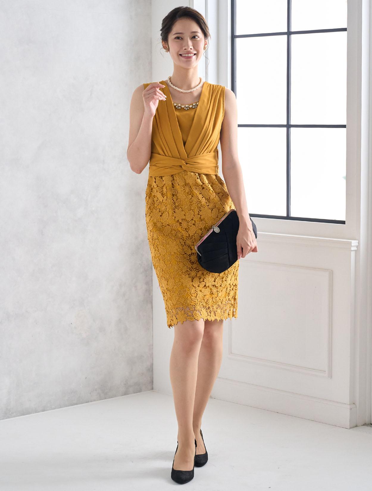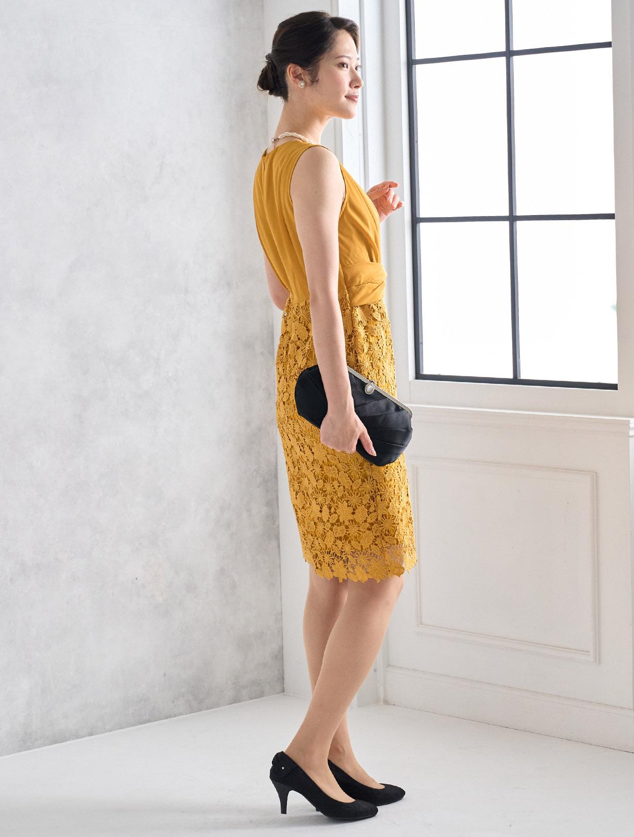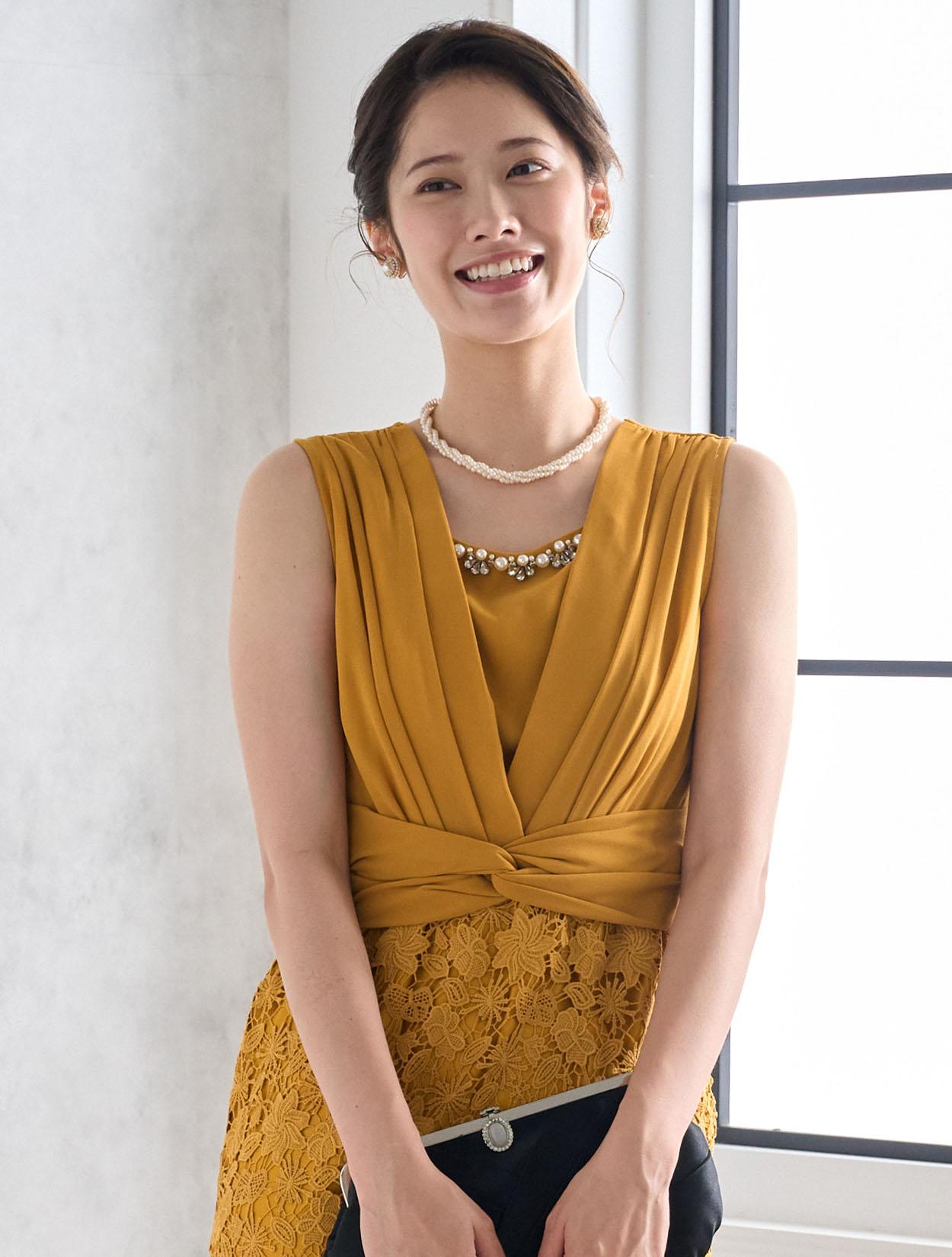 肩に入れたタックでカシュクールのようなVラインを作ったデザインは、上半身をすっきり見せてくれます。ウエストのクロスポイントや、広がらないタイトスカートは、全体をミニマルに着?せして見えるドレスです。大人っぽい印象のデザインですが、スカートに使われたレースがフェミニンさをプラスしてくれます。タイトドレスは周りと被りずらいのも嬉しいポイント。ビジューが付いた程よく開いた首元は、首が短いのが悩みの方でもネックレスなしでキレイに着こなせます。