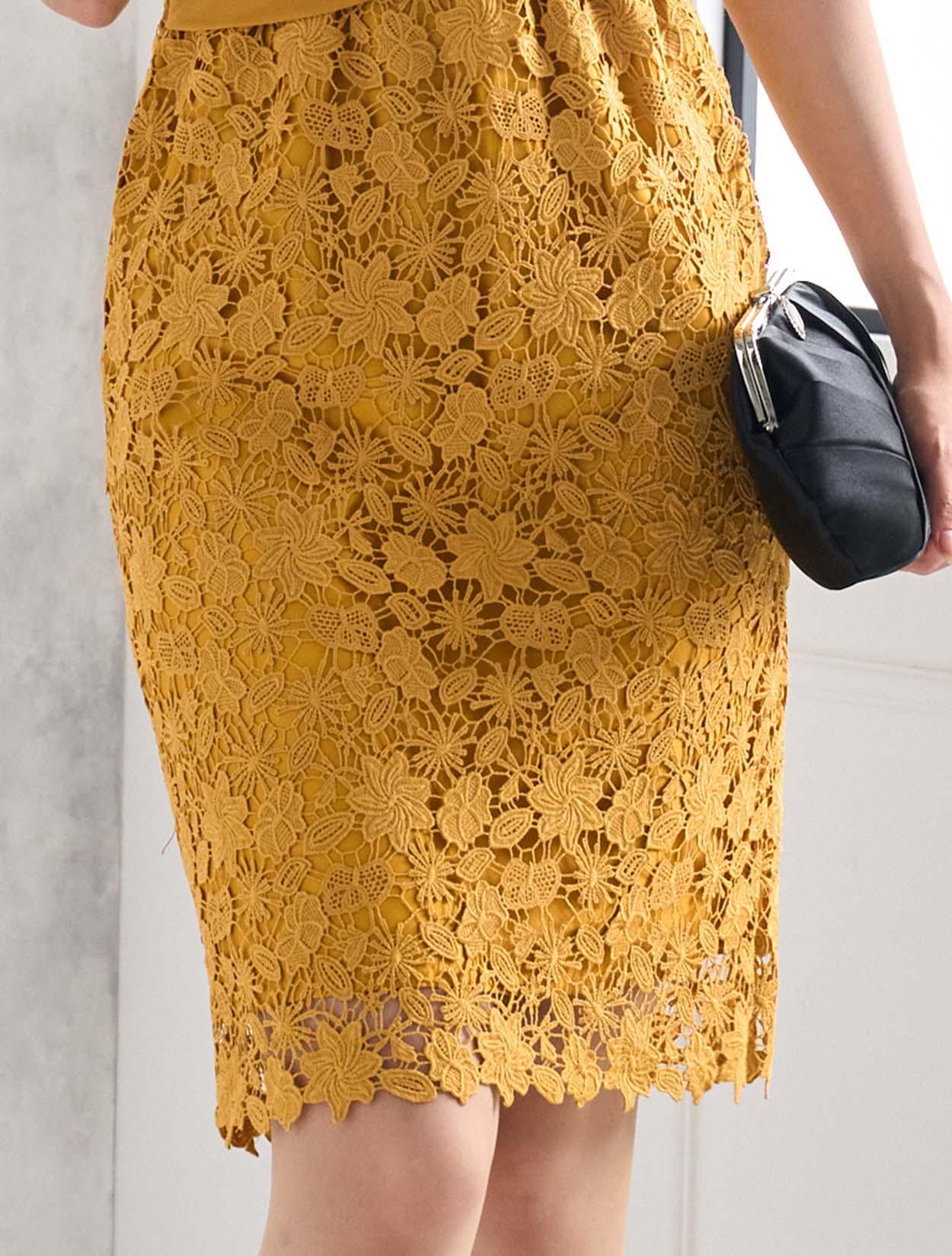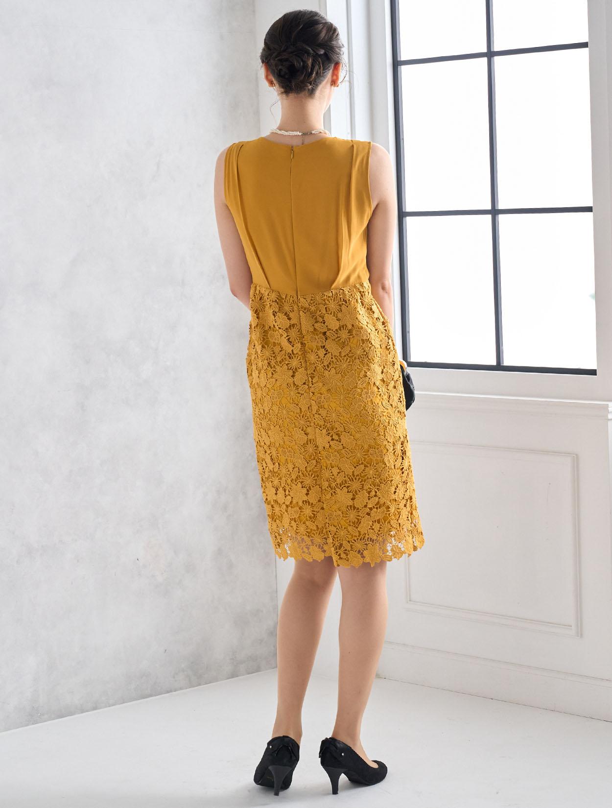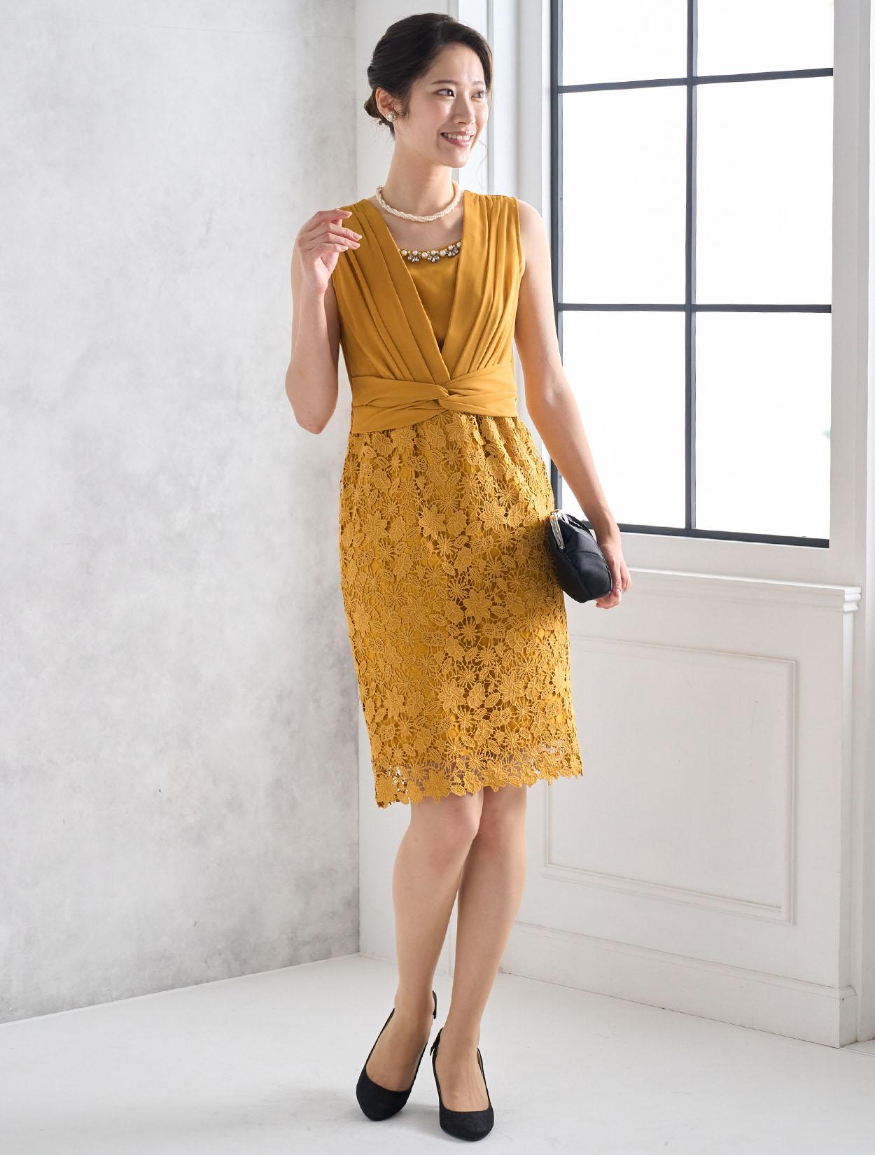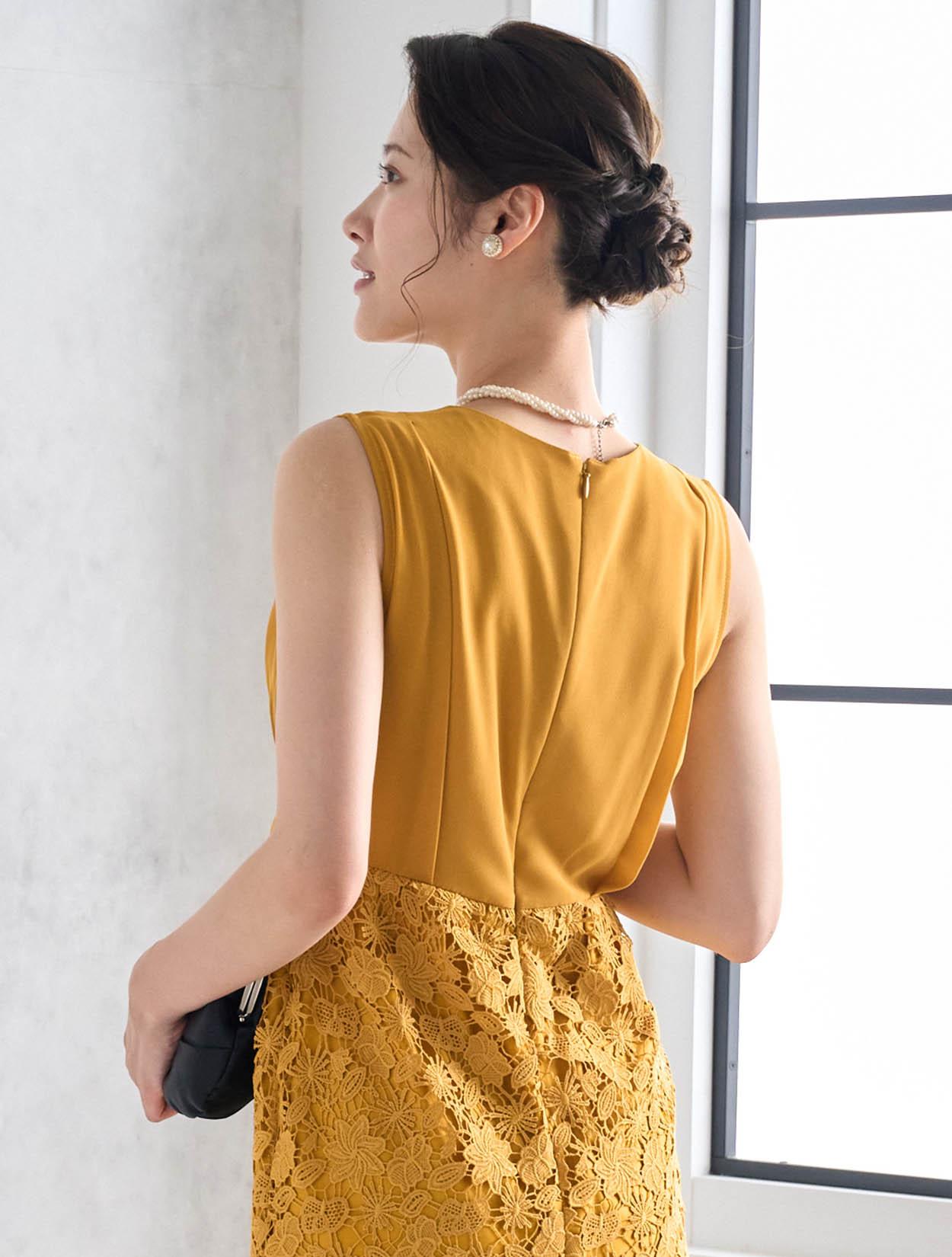 肩に入れたタックでカシュクールのようなVラインを作ったデザインは、上半身をすっきり見せてくれます。ウエストのクロスポイントや、広がらないタイトスカートは、全体をミニマルに着?せして見えるドレスです。大人っぽい印象のデザインですが、スカートに使われたレースがフェミニンさをプラスしてくれます。タイトドレスは周りと被りずらいのも嬉しいポイント。ビジューが付いた程よく開いた首元は、首が短いのが悩みの方でもネックレスなしでキレイに着こなせます。