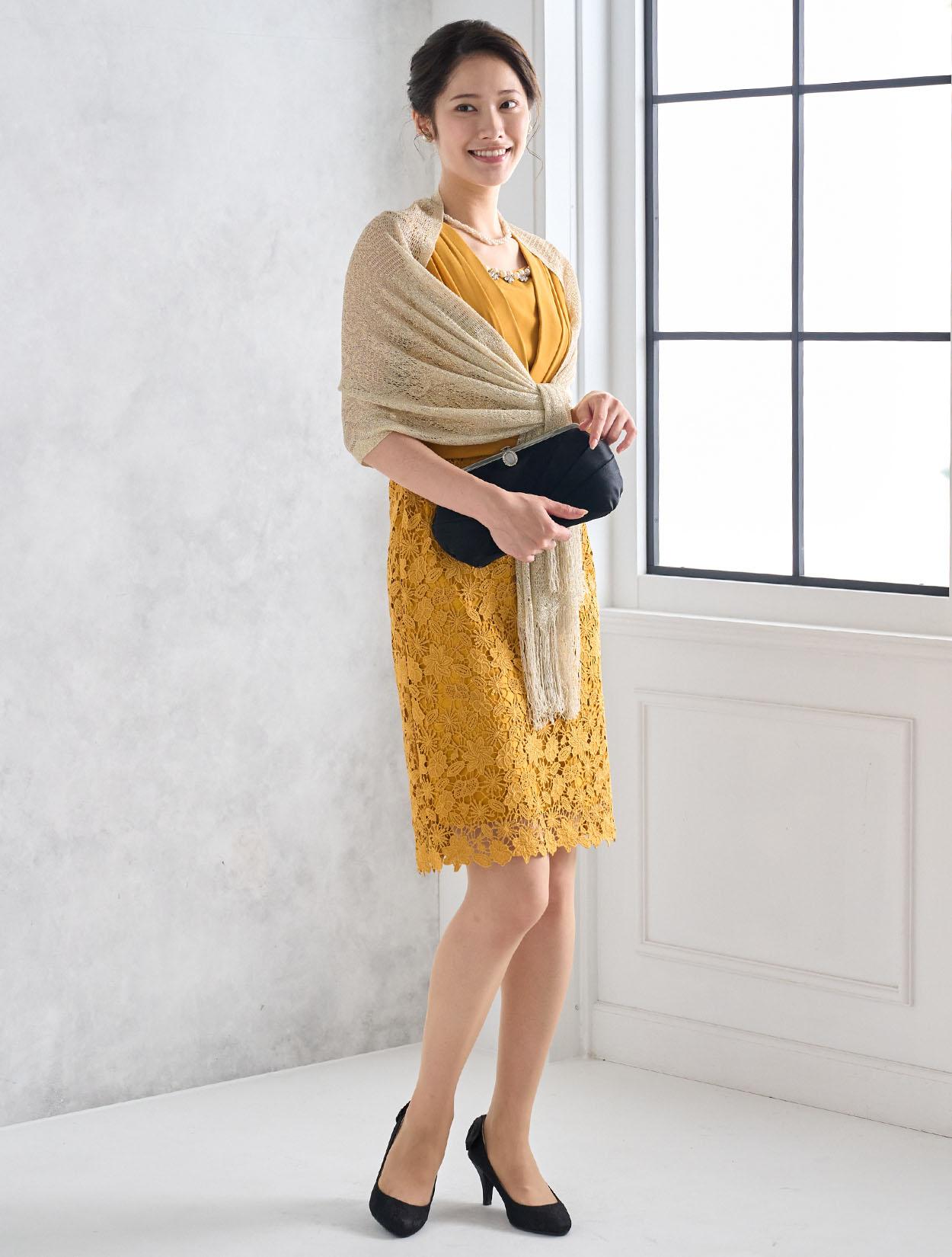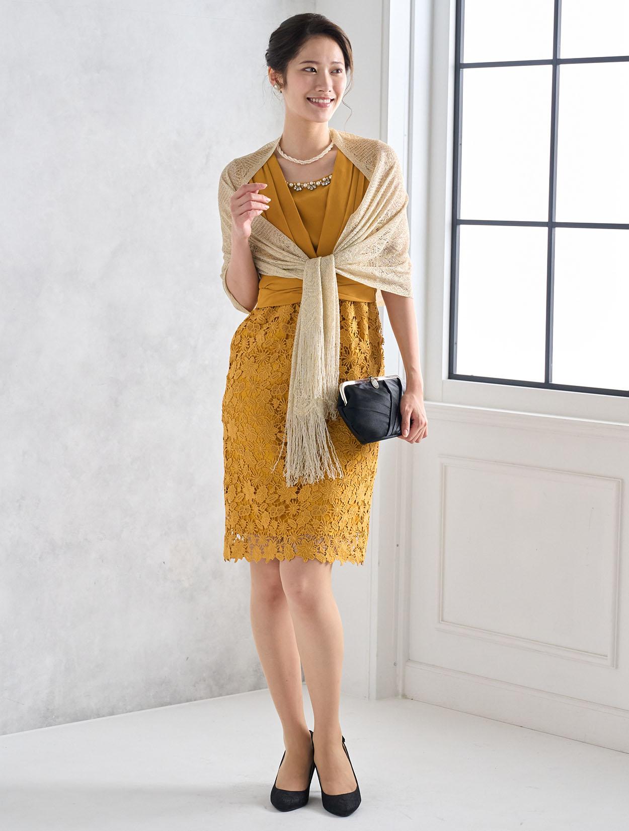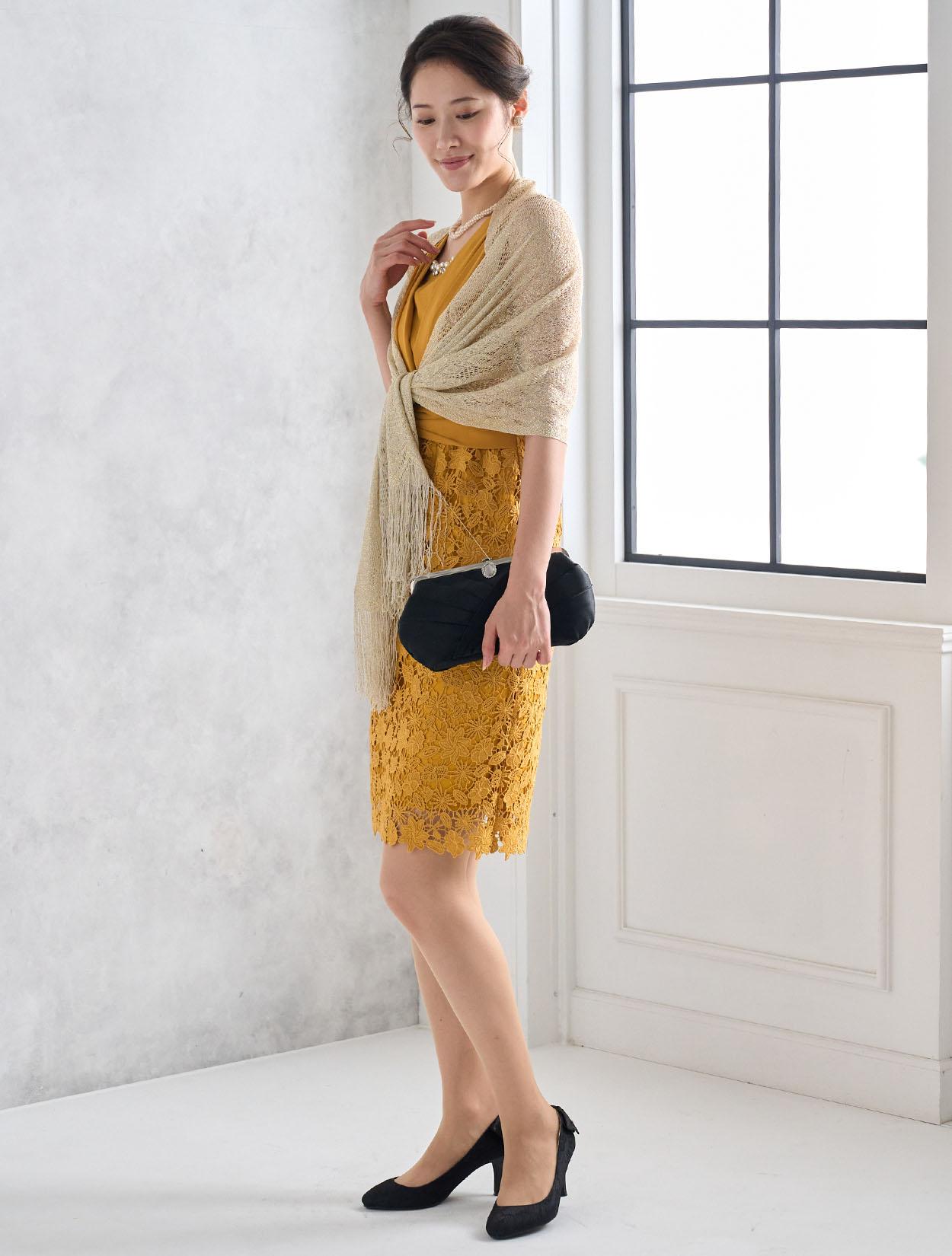 タイトドレスにゴールドショールを合わせた、かっこいい華やかな大人のパーティースタイル。バッグはブラックの差し色でメリハリを出しているのもポイントです。