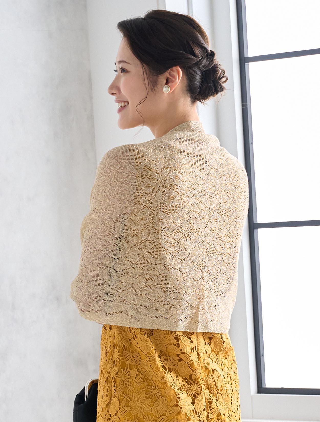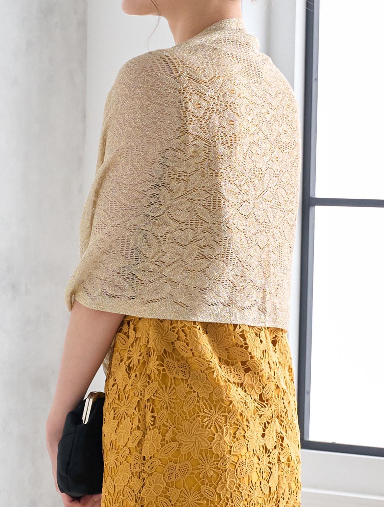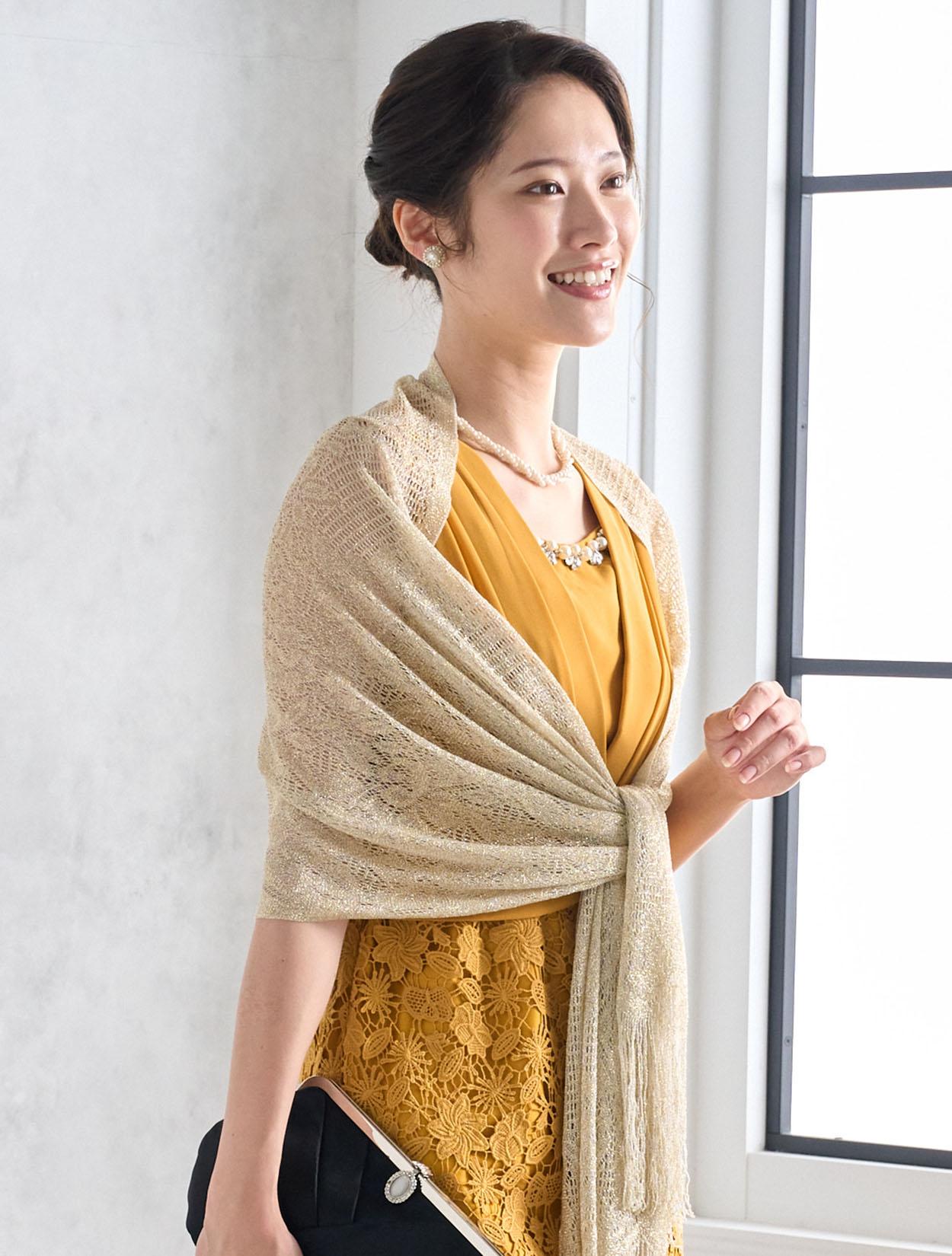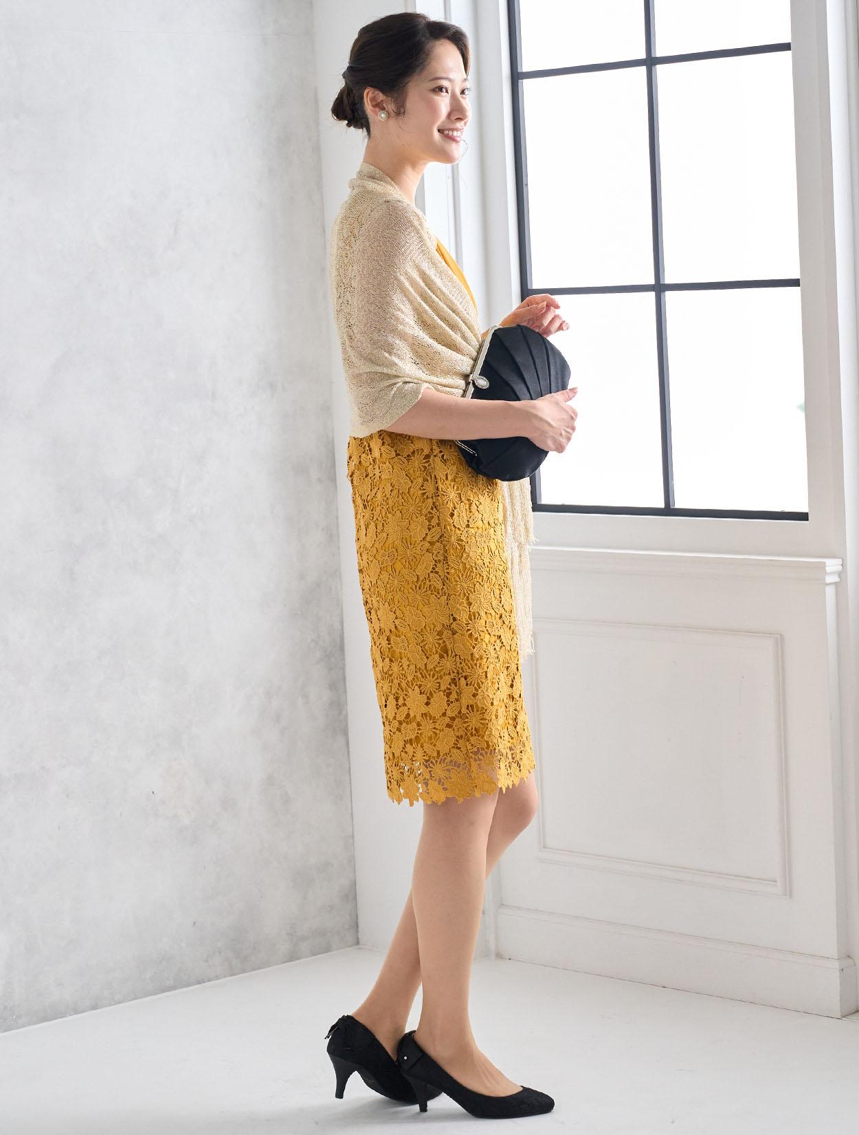 タイトドレスにゴールドショールを合わせた、かっこいい華やかな大人のパーティースタイル。バッグはブラックの差し色でメリハリを出しているのもポイントです。
