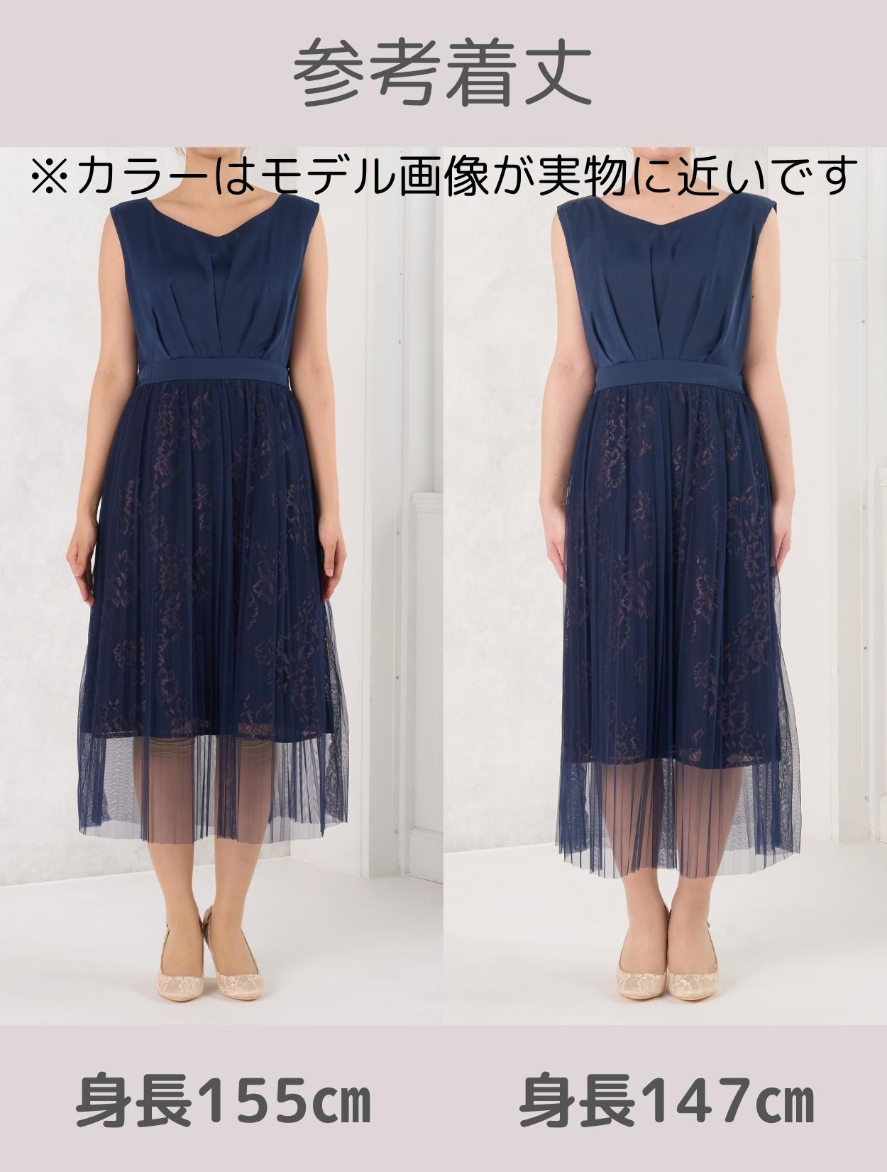 プリーツ加工を施したチュールレースから透ける花模様が珍しい、凝ったデザインのドレス。やや高めのウエスト位置に長すぎない丈で、小柄な方でもバランスよく着こなせます。横に広めのVネックは、首元をスッキリ見せてくれるので、首が短いのがお悩みの方にもおすすめです。上半身にはタックが入っているので立体的に見せてくれます。スカートの裏地は着丈約96㎝です。身長が高い方は、結婚式で着る場合には膝が透けないかご確認ください。
