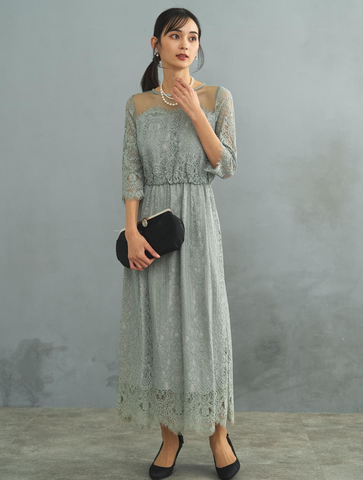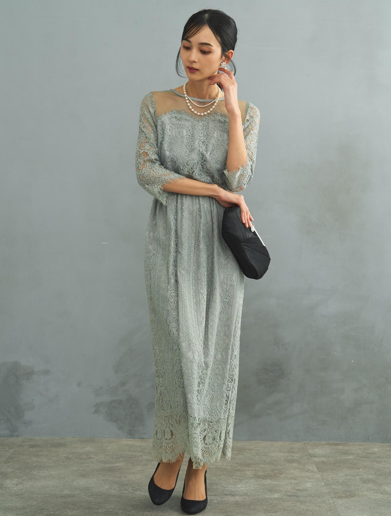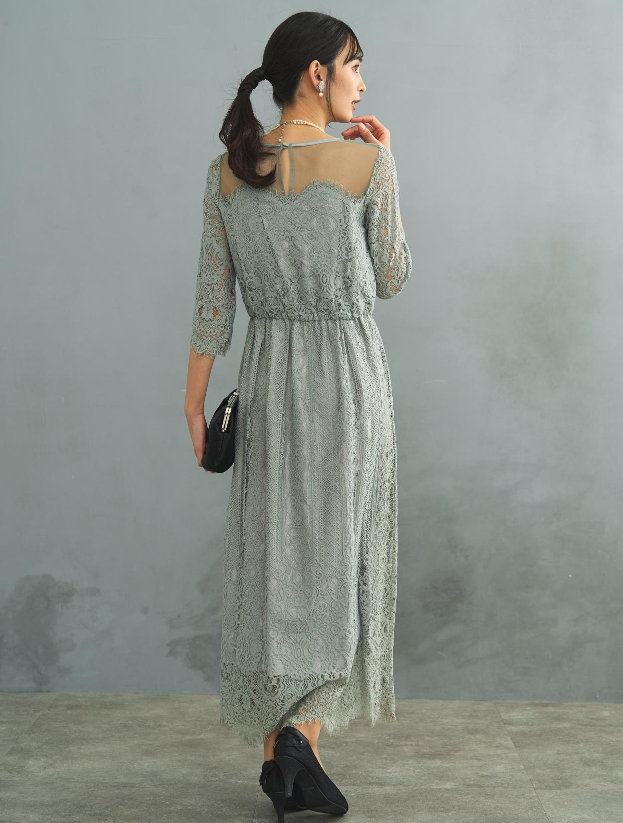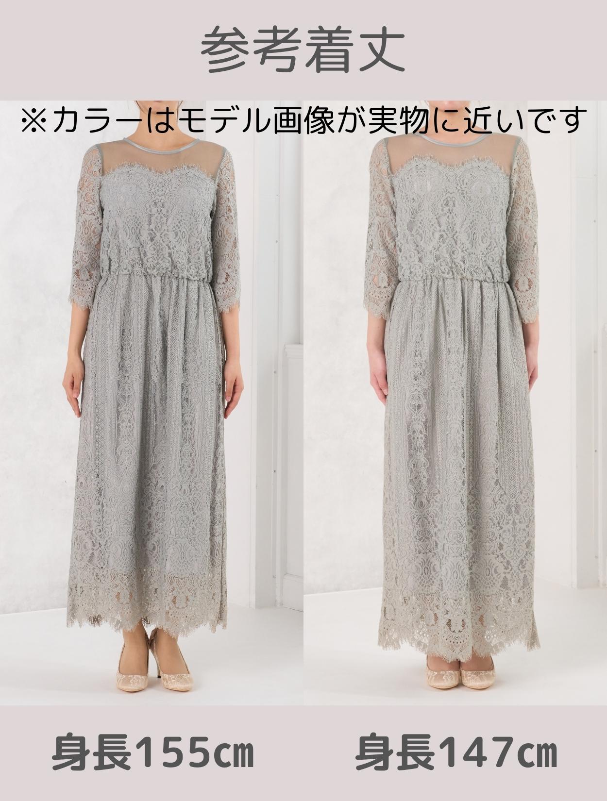 厚みのある上品なレースと軽さあるのチュールを組み合わせたバランスの良いデザインのドレス。透け感の気になる二の腕のレースは、厚みがあるので安心です。レースの柄は華やかで、袖やスカートの裾はスカラップ調にカッティングされている凝ったデザインがポイント。デコルテ部分のチュールは、抜け感がありトレンドを演出してくれます。ウエストはゴム仕様で、長時間着用していても疲れにくく着心地の良いドレスです。ロング丈のスカートは、広がり過ぎないラインで大人っぽい印象をたのしめます。
