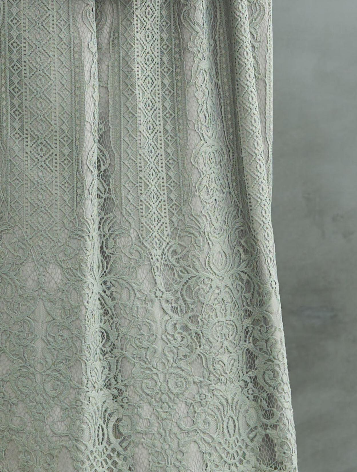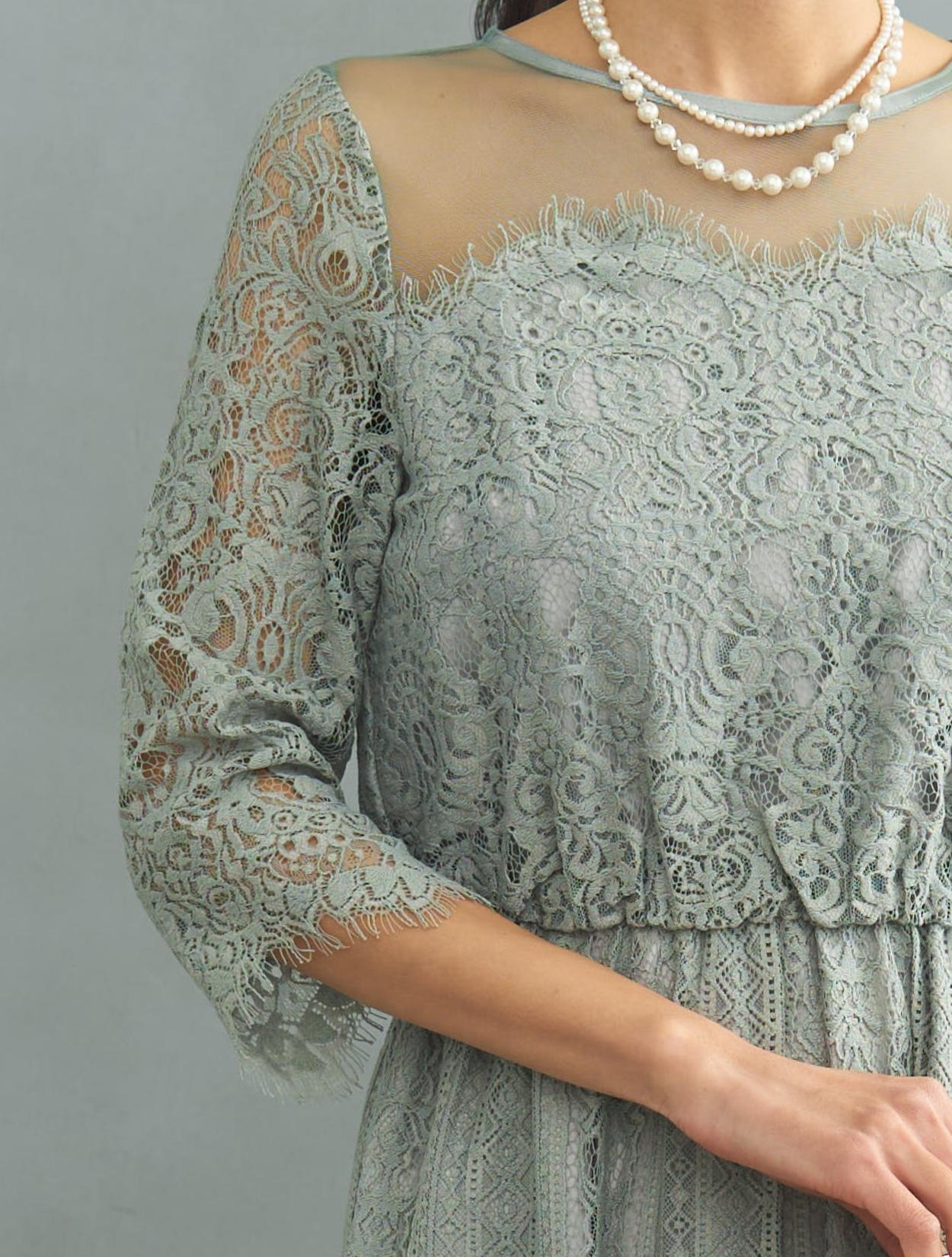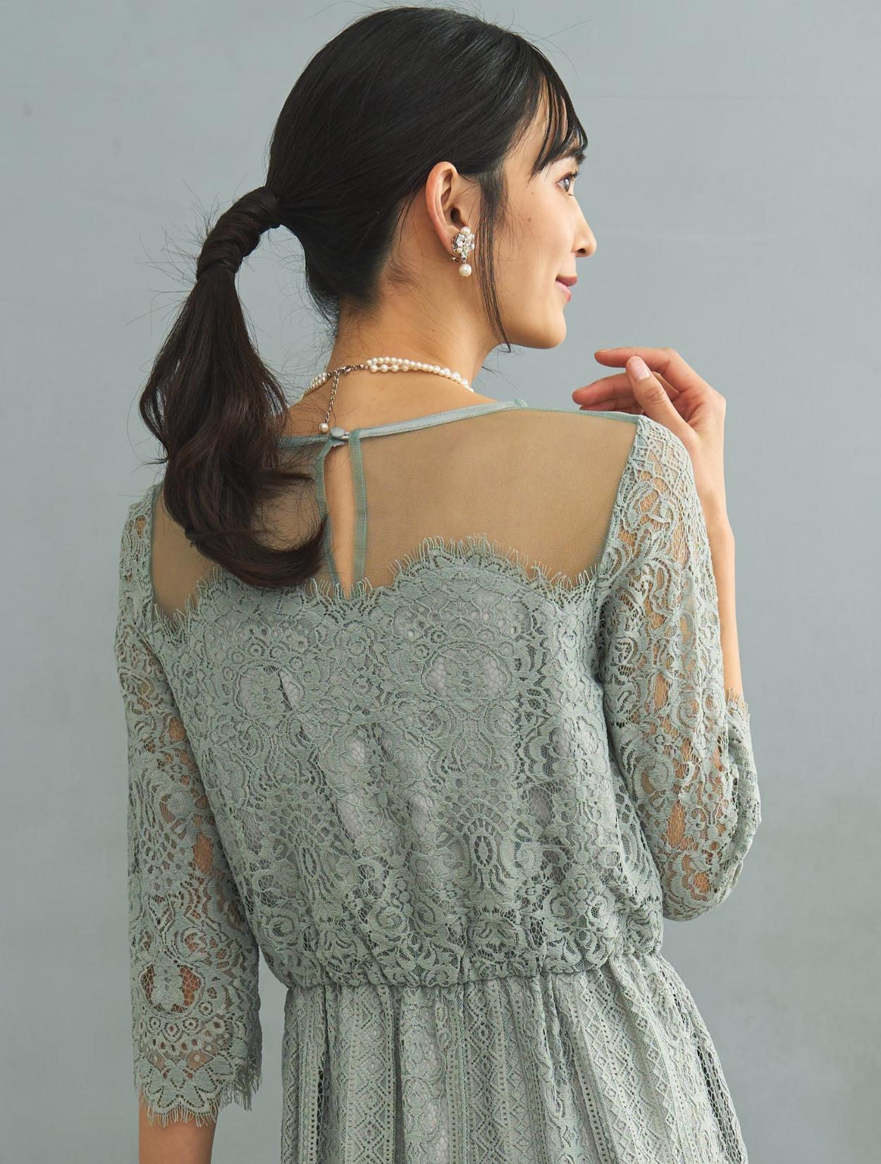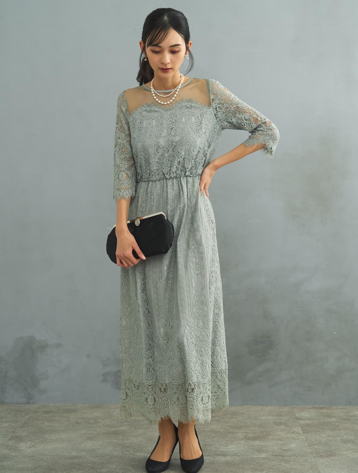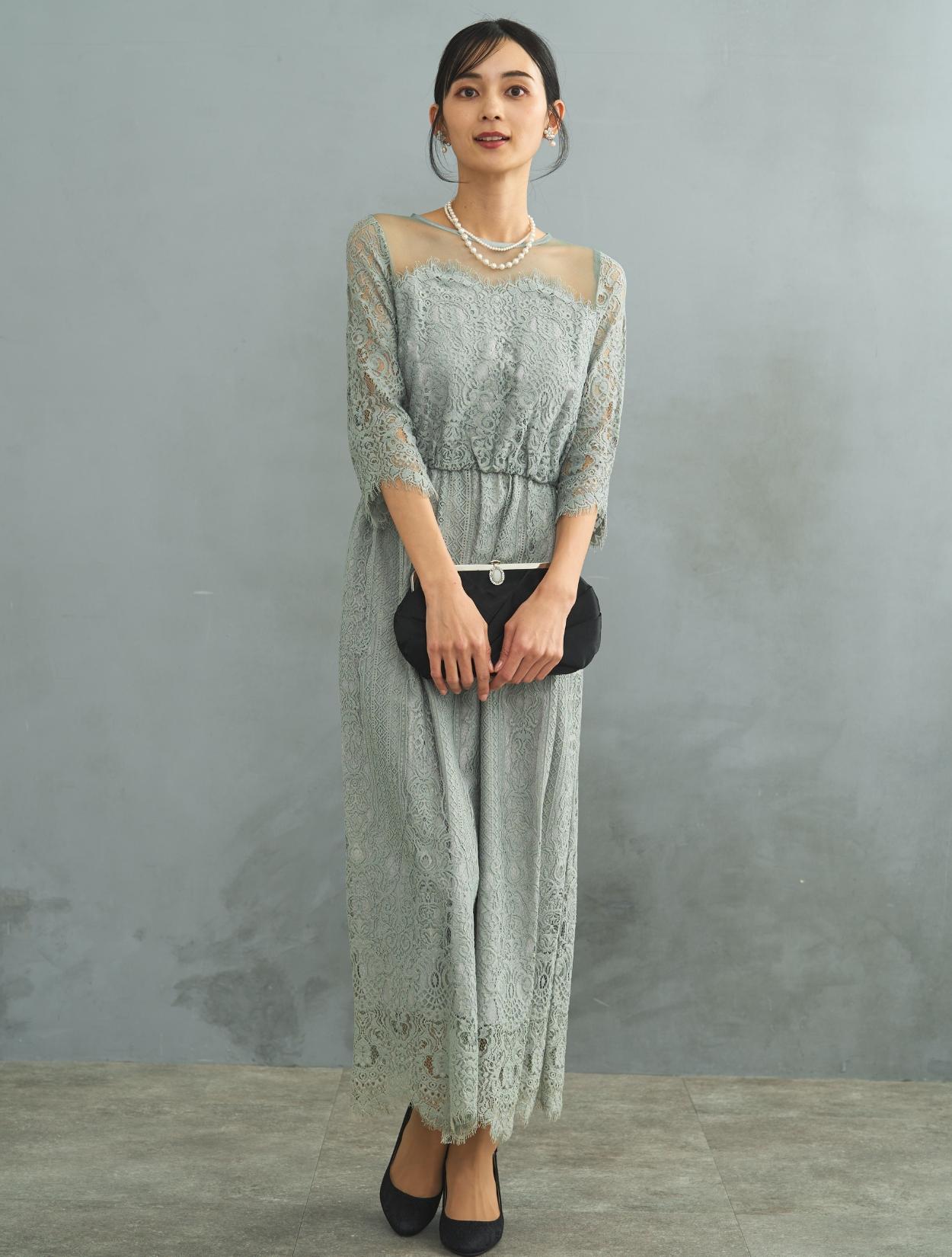 厚みのある上品なレースと軽さあるのチュールを組み合わせたバランスの良いデザインのドレス。透け感の気になる二の腕のレースは、厚みがあるので安心です。レースの柄は華やかで、袖やスカートの裾はスカラップ調にカッティングされている凝ったデザインがポイント。デコルテ部分のチュールは、抜け感がありトレンドを演出してくれます。ウエストはゴム仕様で、長時間着用していても疲れにくく着心地の良いドレスです。ロング丈のスカートは、広がり過ぎないラインで大人っぽい印象をたのしめます。