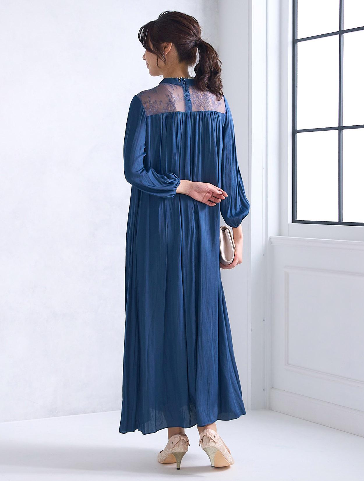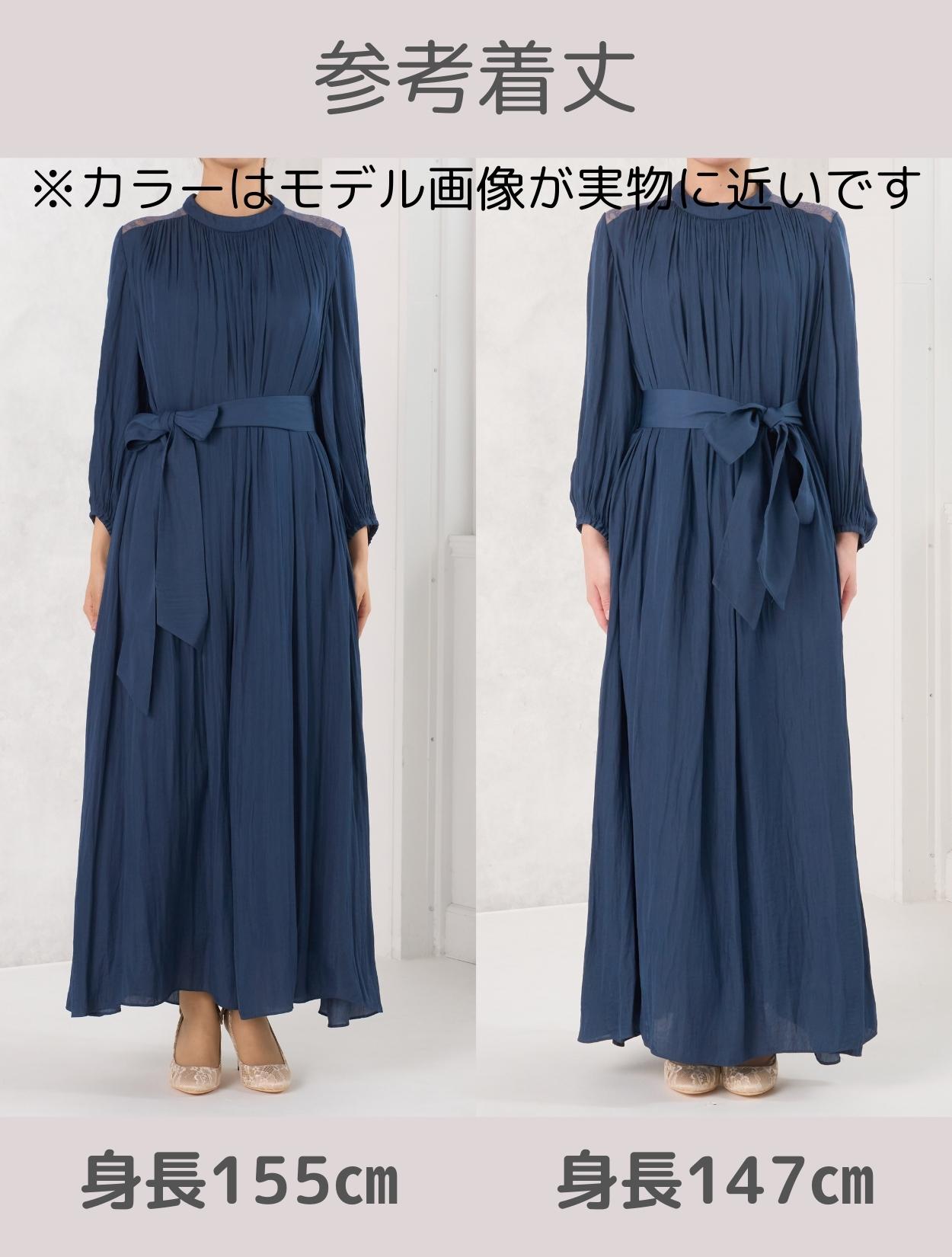 ナチュラルでエフォートレスなラインが個性的な大人のドレス。程よい光沢としっとり感のあるサテン生地で、ドレス全体にたっぷりとギャザーをとっているので高級感があります。背中のファスナーはコンシールファスナーで、デザインを邪魔しません。ネックラインはミニマルなミニボトルネック。露出を抑えたデザインで上品に着こなせます。主張し過ぎない肩から背中にかけてのレースがおしゃれのポイント。付属でウエストリボンがついているので、ウエストはお好みでキュッと絞ってメリハリを出しても◎。周りと被りずらい個性派さんには、あえてウエストを絞らず、緩やかなAラインの着こなしを楽しむのもおすすめです。お袖はしっかりありますので、結婚式など露出NGのフォーマルな場面でもドレス一枚で着用可能です。袖はもたつかないデザインで、立食などお食事を伴う場面でもストレスフリーで着られます。