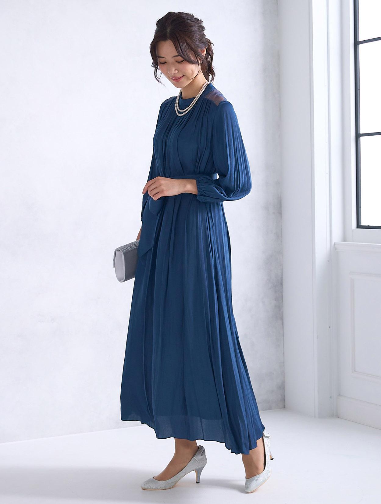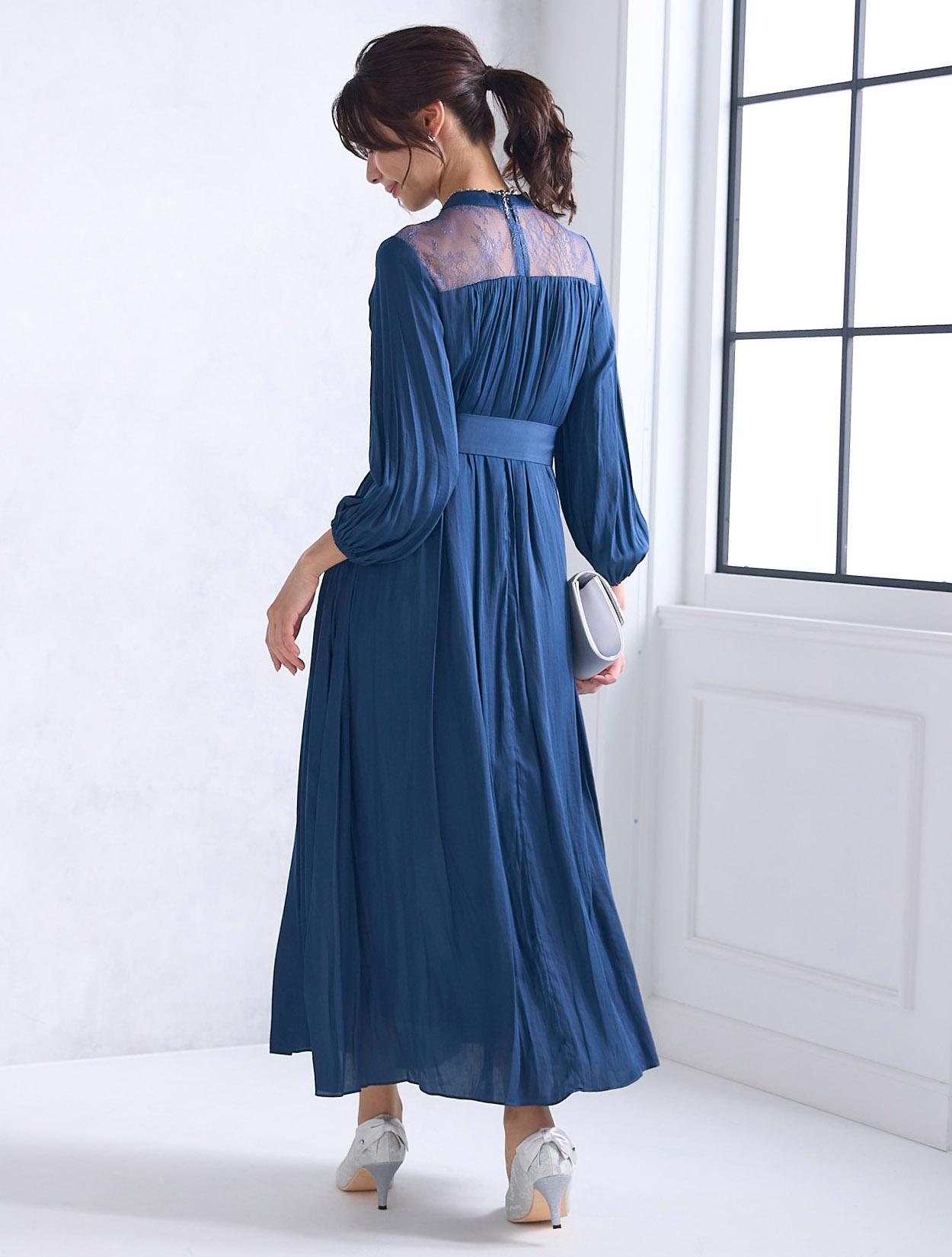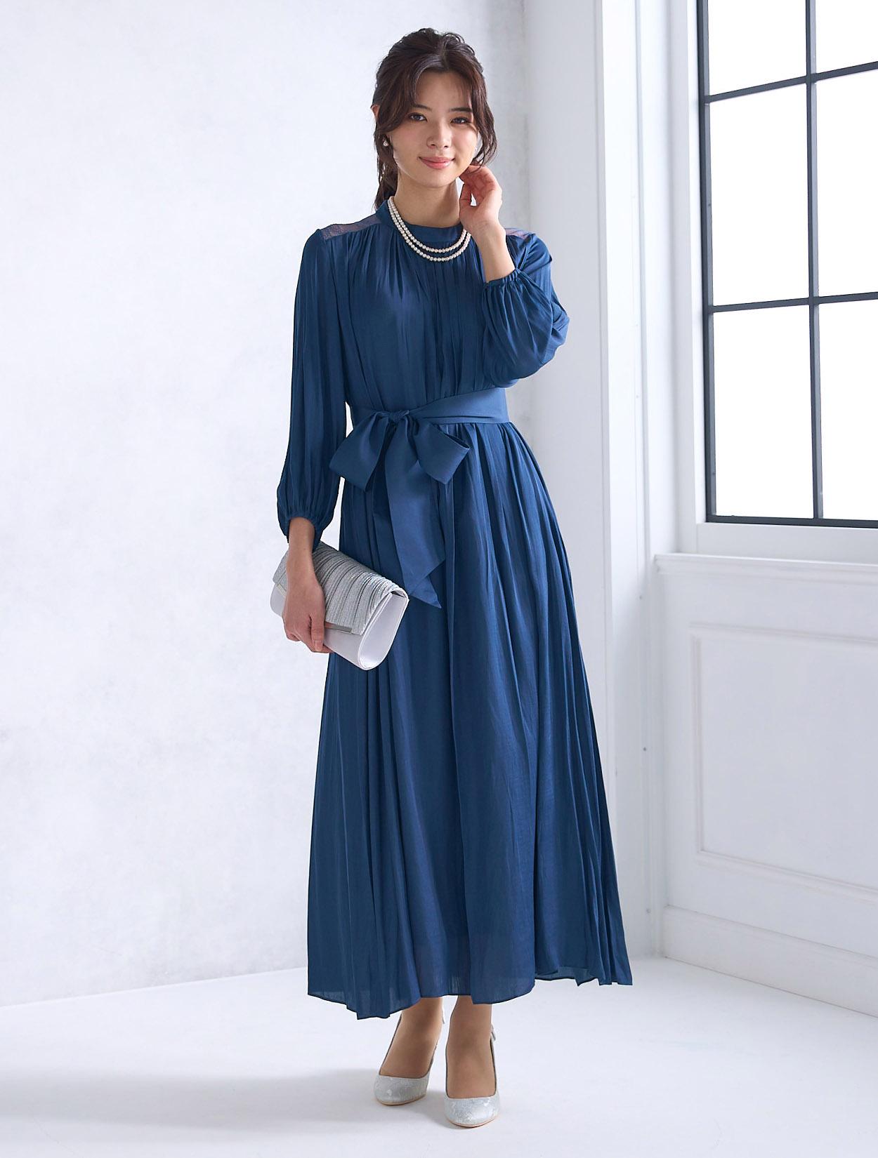 青味が感じられる明るめのネイビードレス。ネイビーの中ではハッキリと発色しているので、生地の光沢もあり程よく華やかに着こなせるカラーです。ネイビーは日本人の肌色に合いやすいので、レンタルドレスでも人気のカラーです。