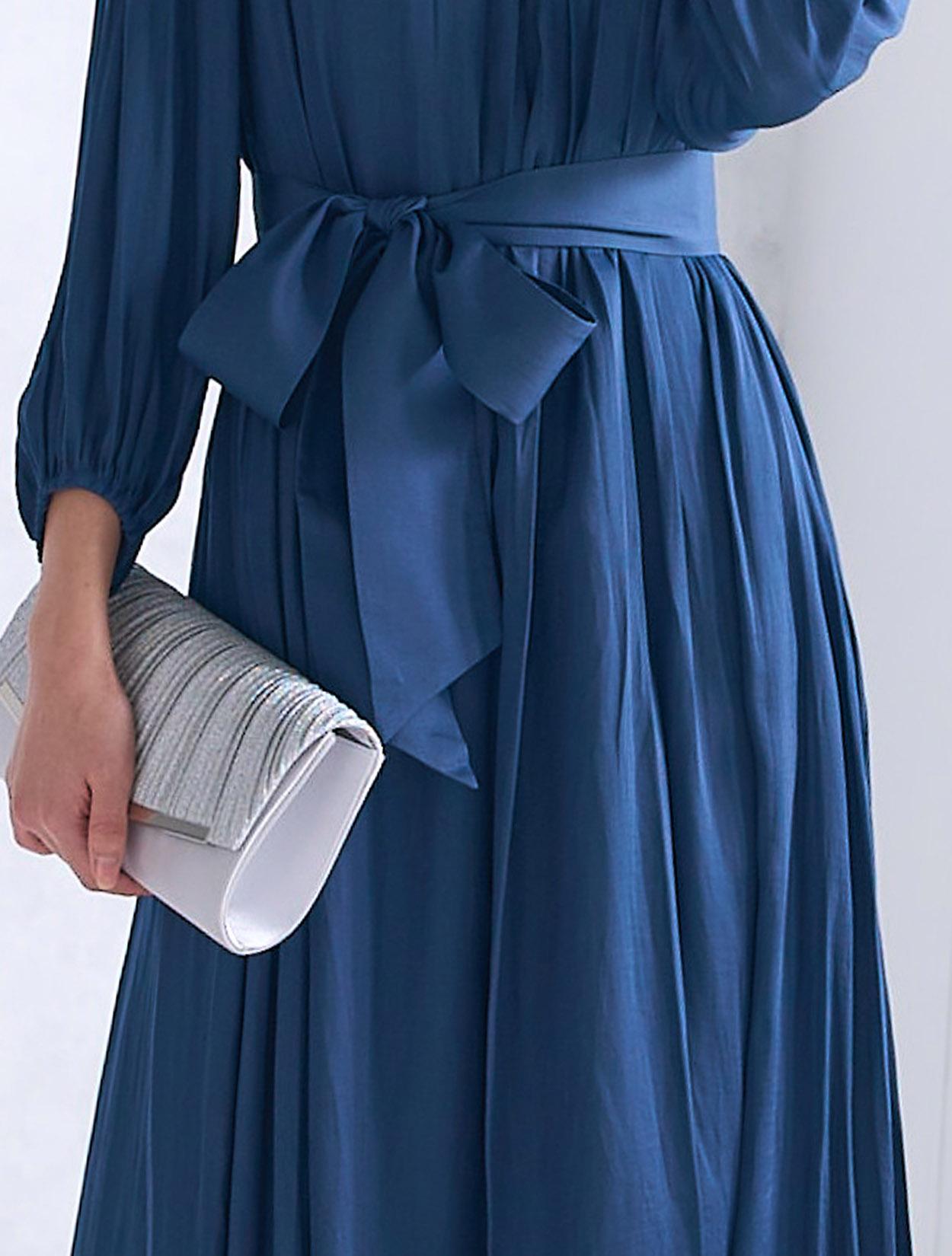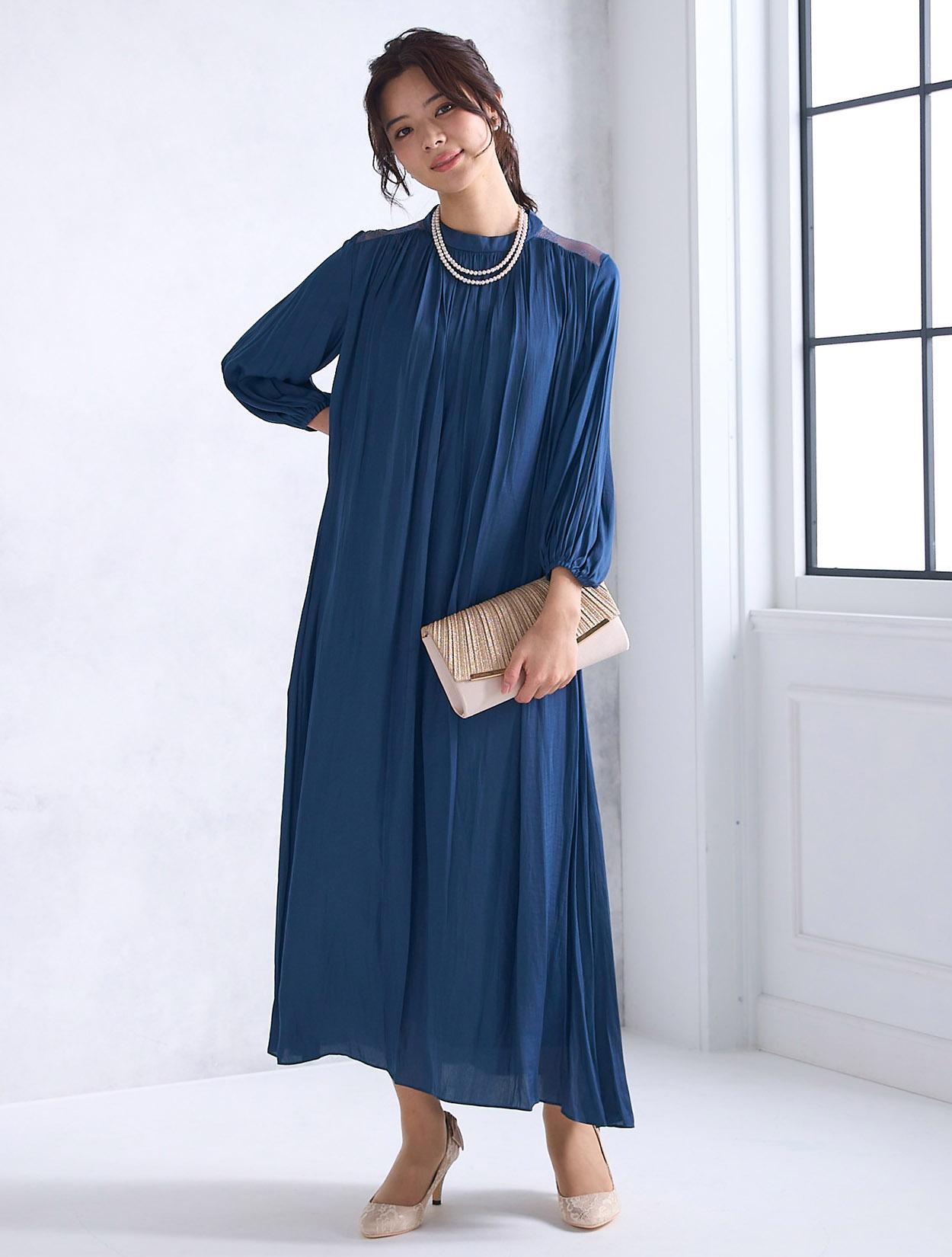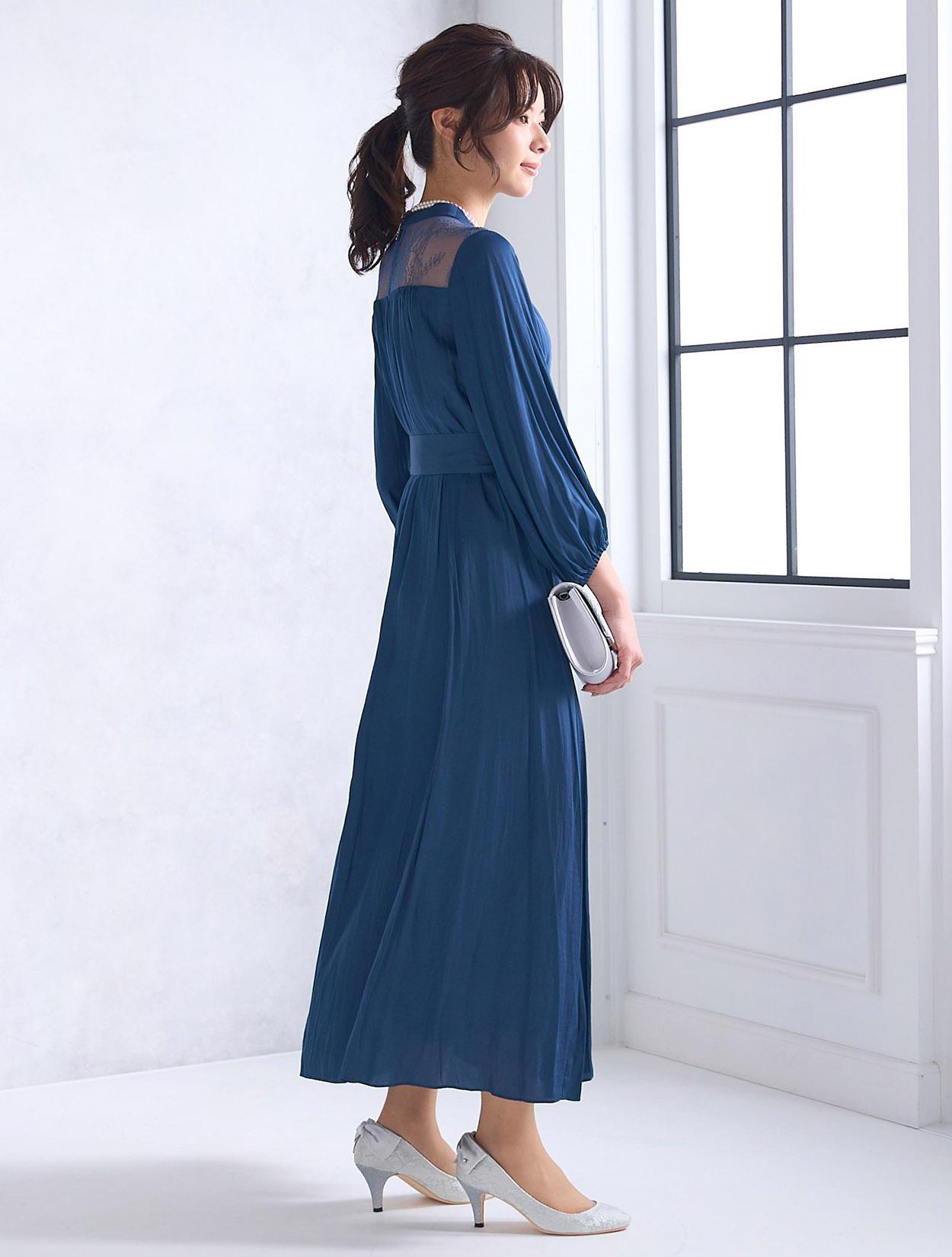青味が感じられる明るめのネイビードレス。ネイビーの中ではハッキリと発色しているので、生地の光沢もあり程よく華やかに着こなせるカラーです。ネイビーは日本人の肌色に合いやすいので、レンタルドレスでも人気のカラーです。