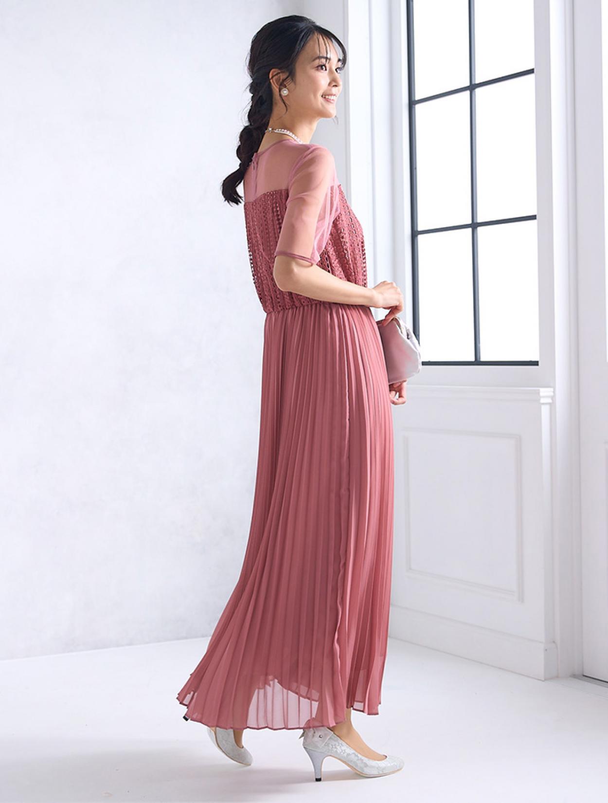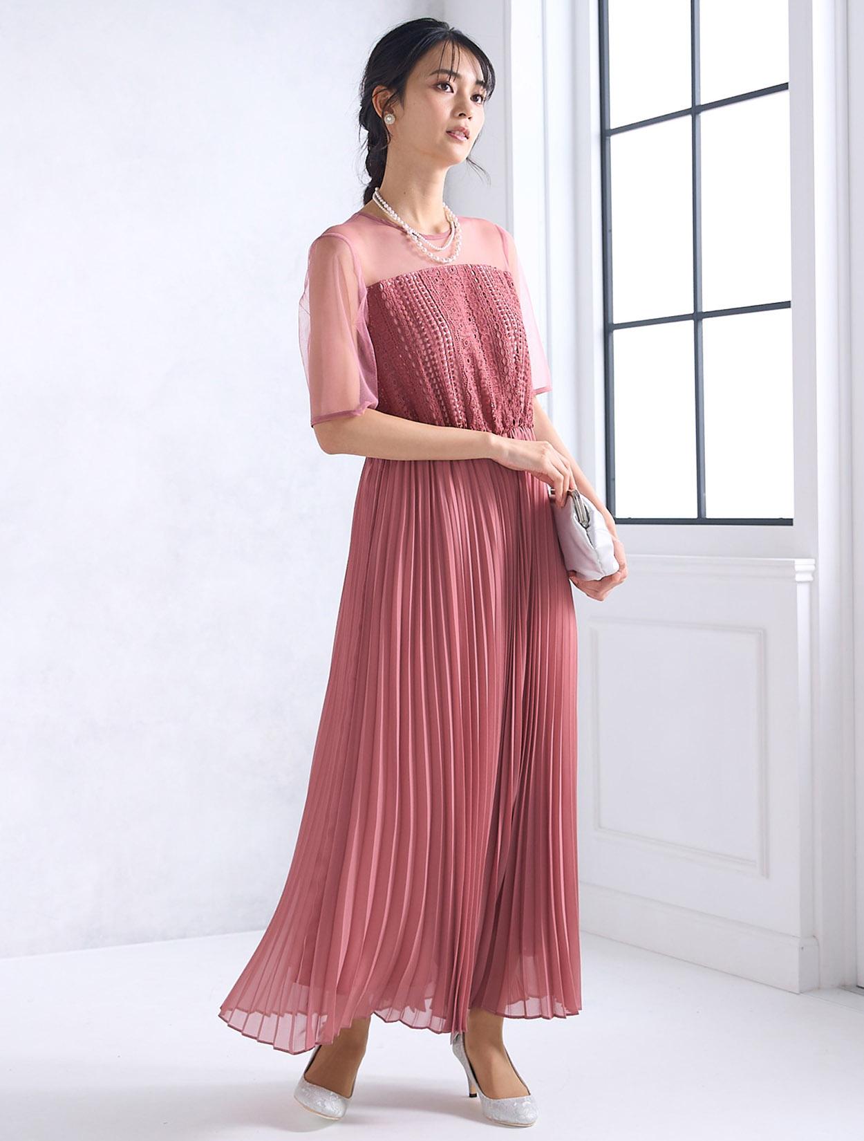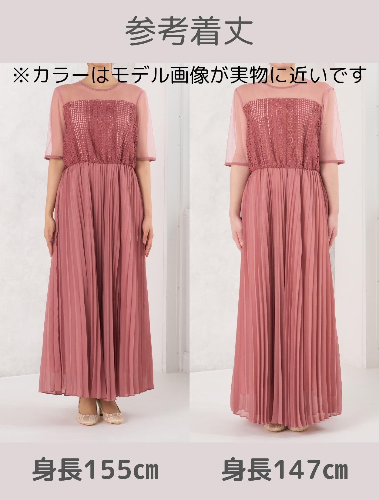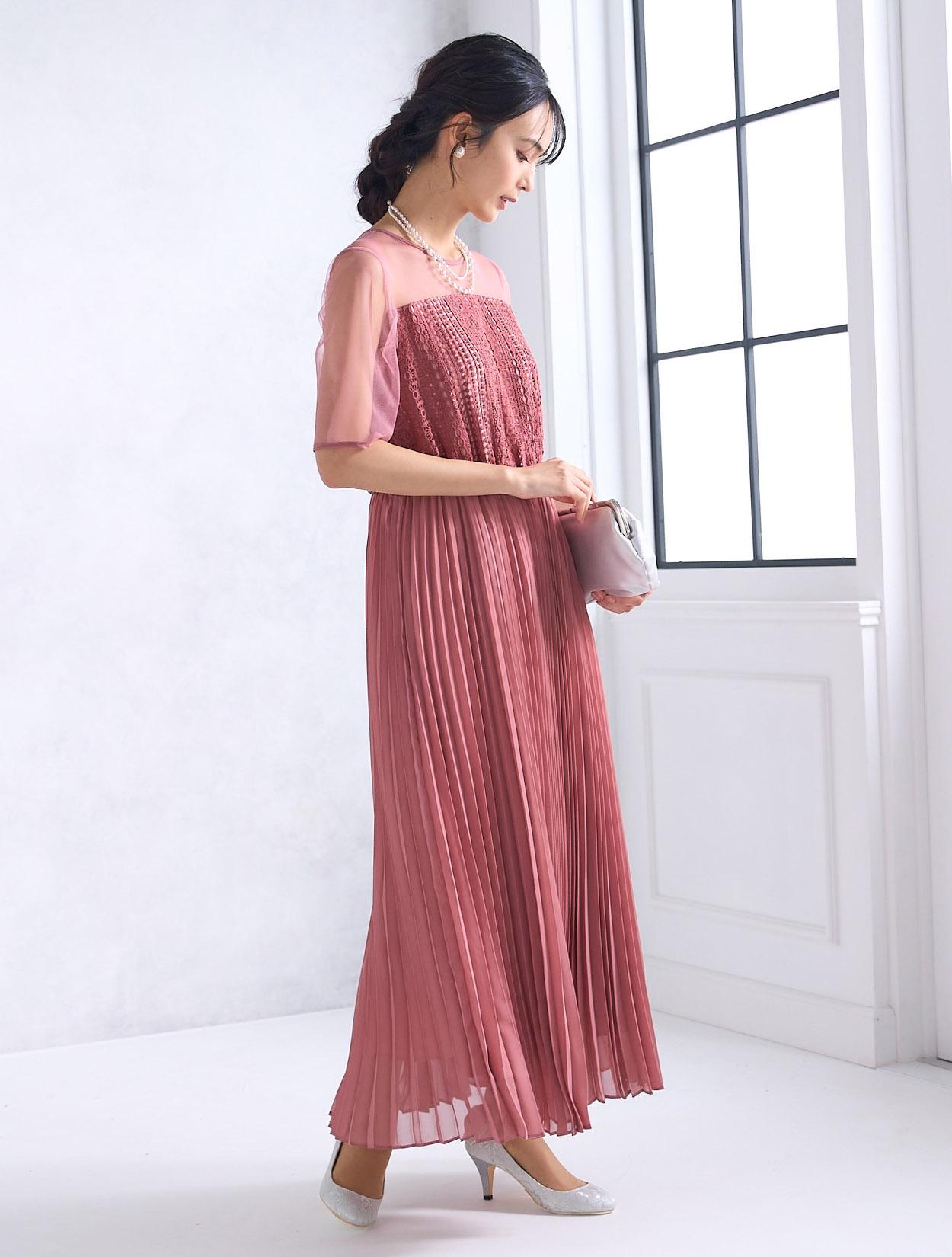 ストライプ調にデザインされたレースとトレンドのプリーツスカートで、しっかり縦のラインを強調してくれるスタイルアップ効果のあるドレス。デコルテ部分のチュールが程よい抜け感を出してくれますが、首元は空き過ぎないデザインなので、上品に着こなせます。ウエスト部分はゴム仕様でストレスなく着られるデザインですが、背中ファスナーで上半身は程よくすっきり見えます。人気の袖ありドレスなので、結婚式でも羽織なしで一枚で着られるのも嬉しいポイント。丈は長めなので、身長が160㎝以上ある方におすすめです。