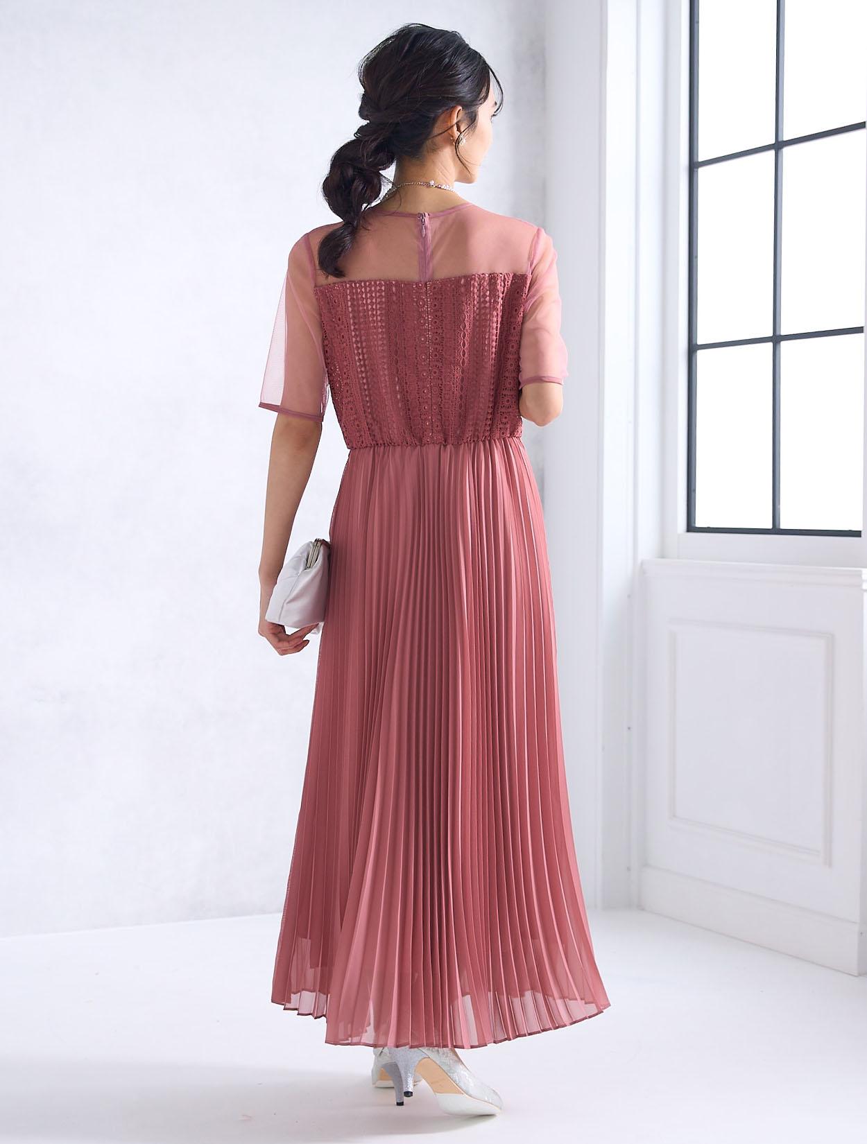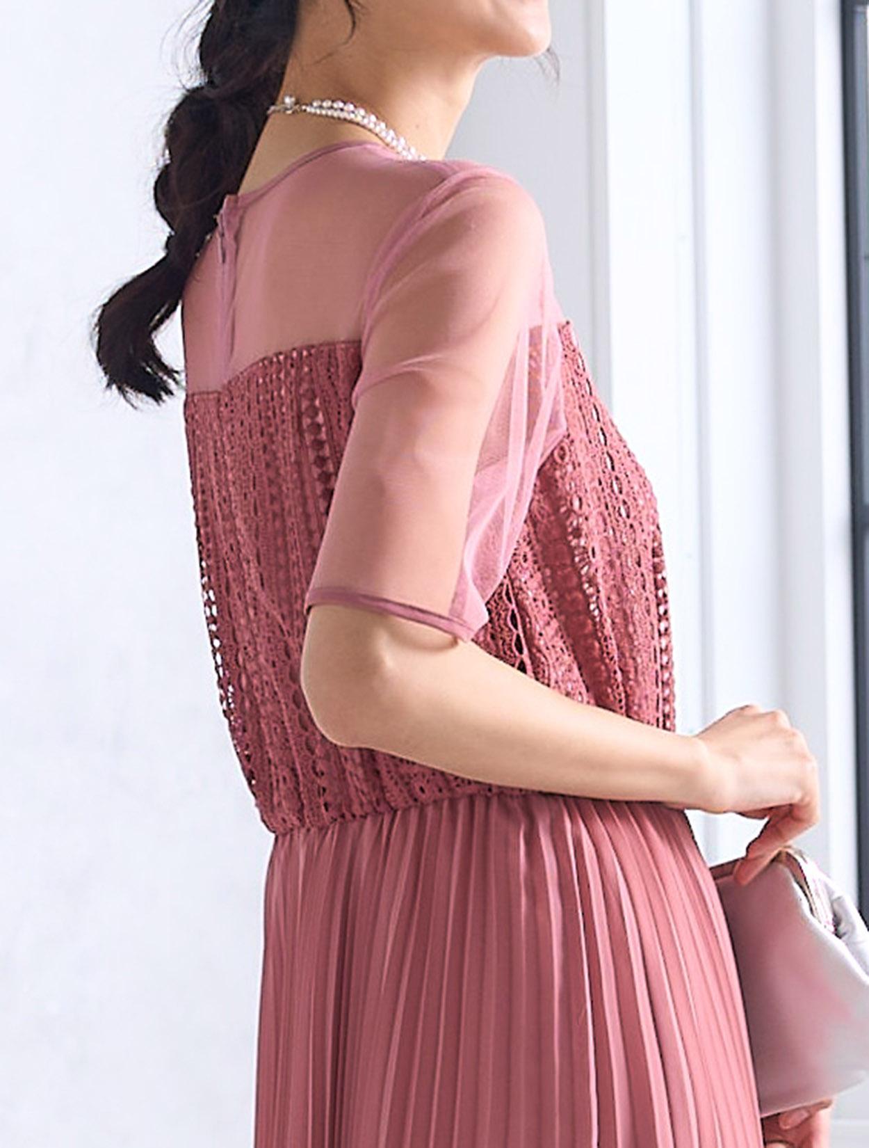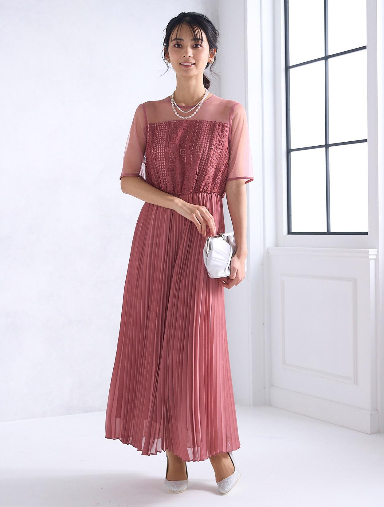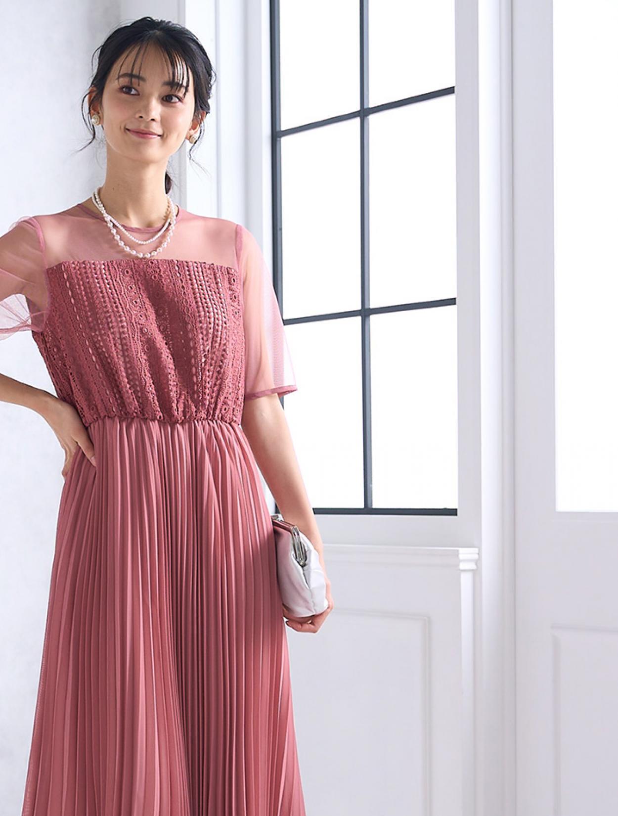 ストライプ調にデザインされたレースとトレンドのプリーツスカートで、しっかり縦のラインを強調してくれるスタイルアップ効果のあるドレス。デコルテ部分のチュールが程よい抜け感を出してくれますが、首元は空き過ぎないデザインなので、上品に着こなせます。ウエスト部分はゴム仕様でストレスなく着られるデザインですが、背中ファスナーで上半身は程よくすっきり見えます。人気の袖ありドレスなので、結婚式でも羽織なしで一枚で着られるのも嬉しいポイント。丈は長めなので、身長が160㎝以上ある方におすすめです。