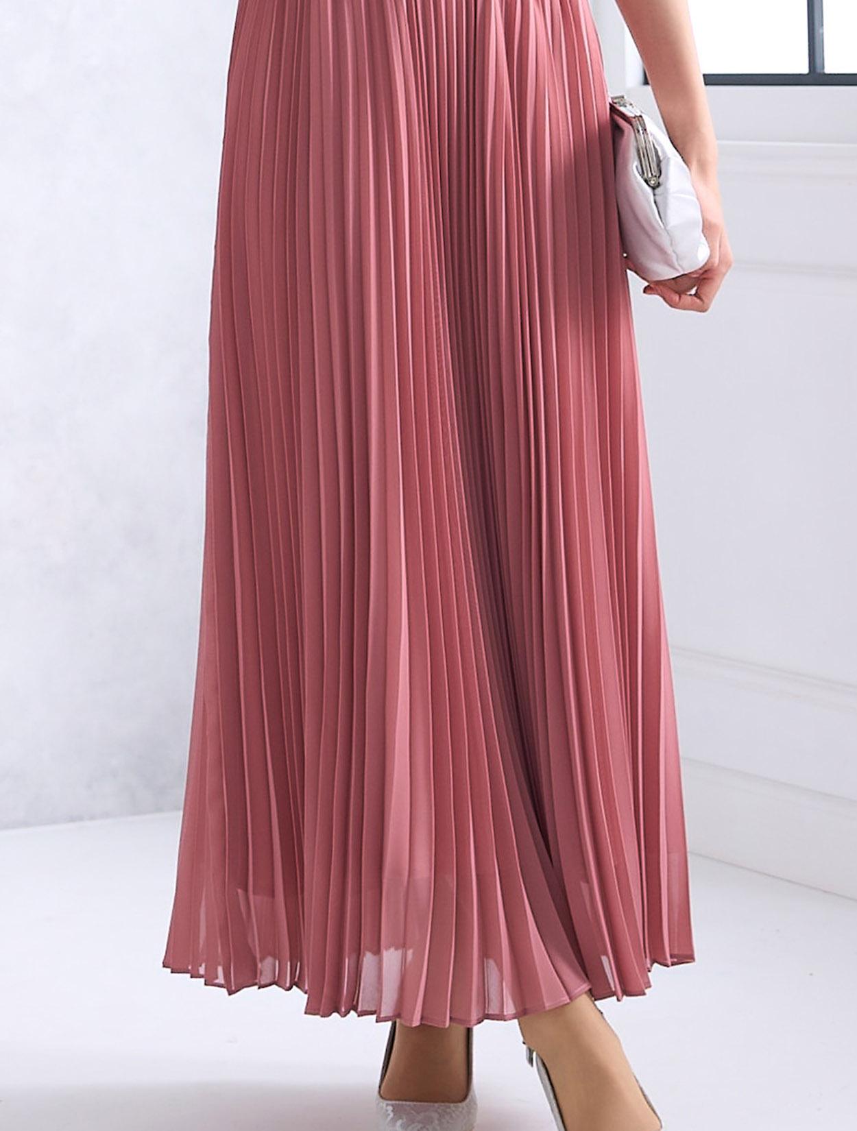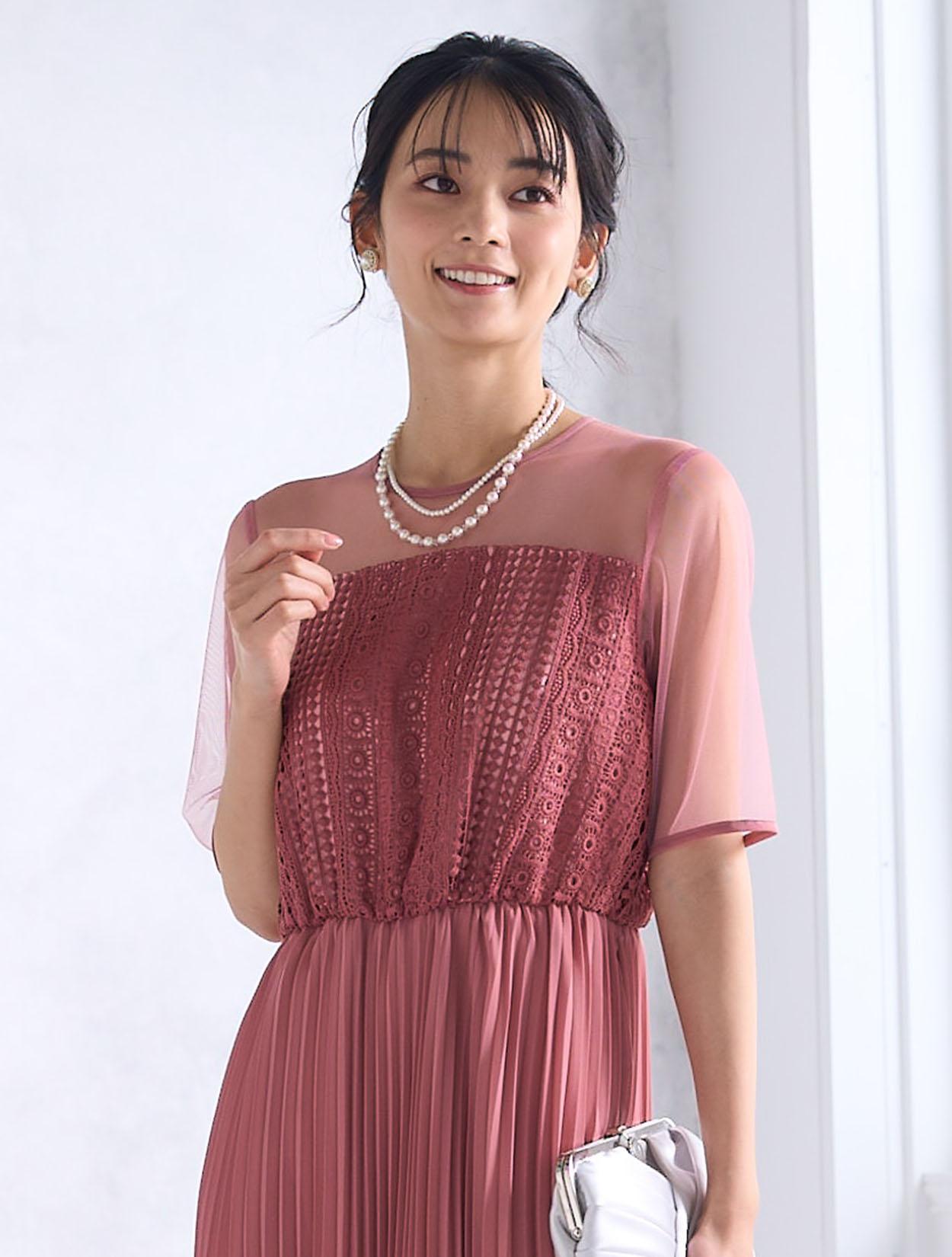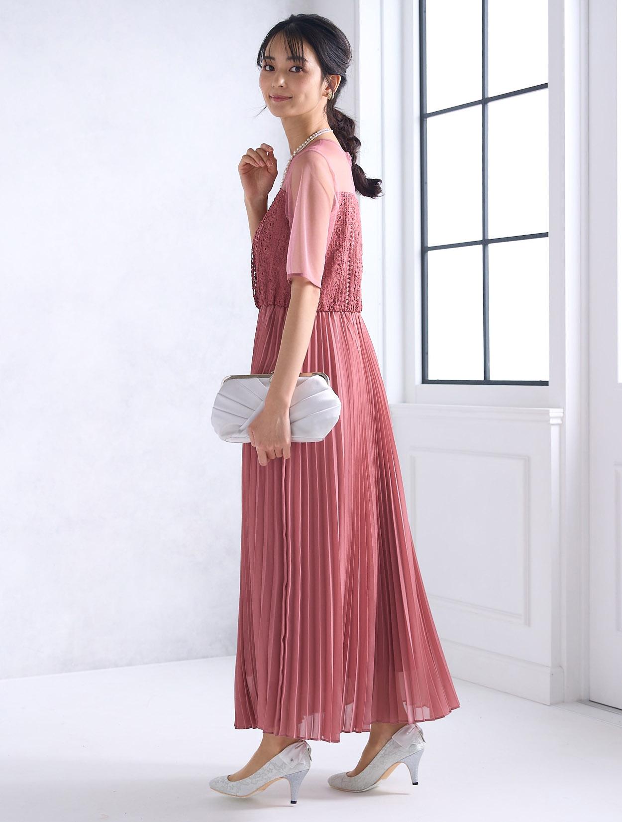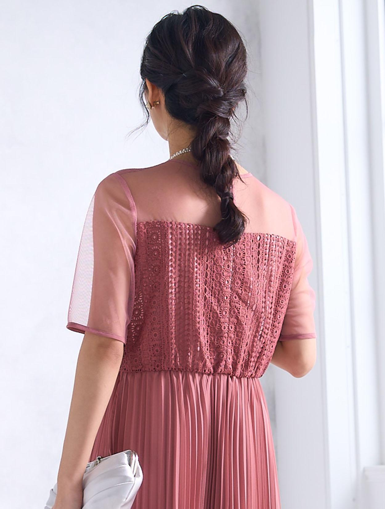 ストライプ調にデザインされたレースとトレンドのプリーツスカートで、しっかり縦のラインを強調してくれるスタイルアップ効果のあるドレス。デコルテ部分のチュールが程よい抜け感を出してくれますが、首元は空き過ぎないデザインなので、上品に着こなせます。ウエスト部分はゴム仕様でストレスなく着られるデザインですが、背中ファスナーで上半身は程よくすっきり見えます。人気の袖ありドレスなので、結婚式でも羽織なしで一枚で着られるのも嬉しいポイント。丈は長めなので、身長が160㎝以上ある方におすすめです。