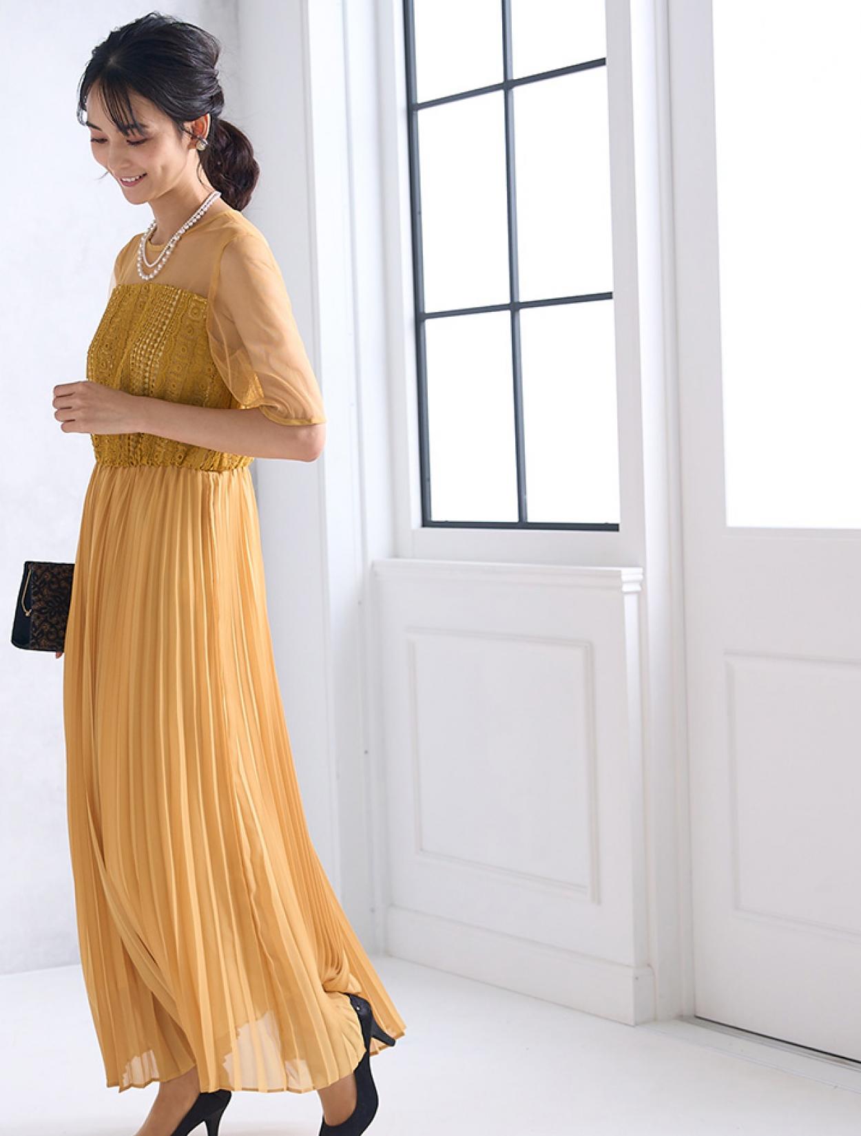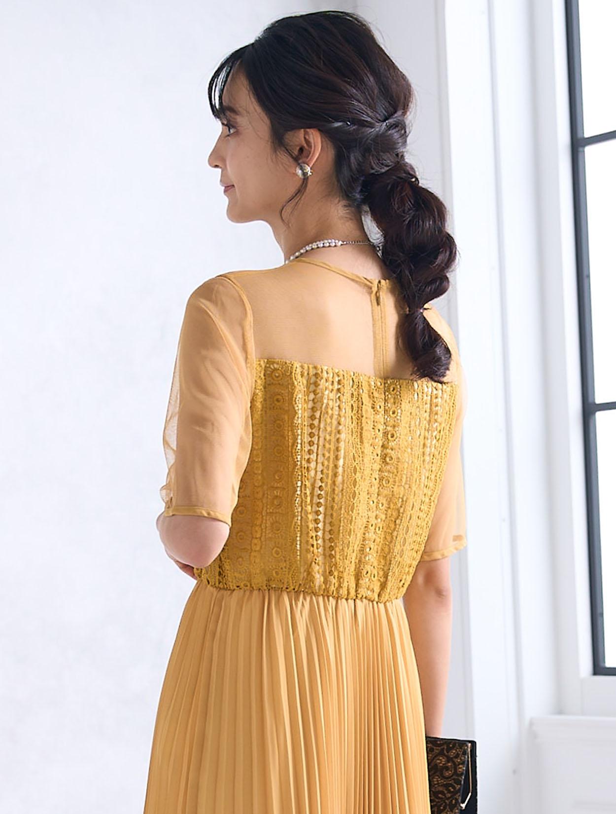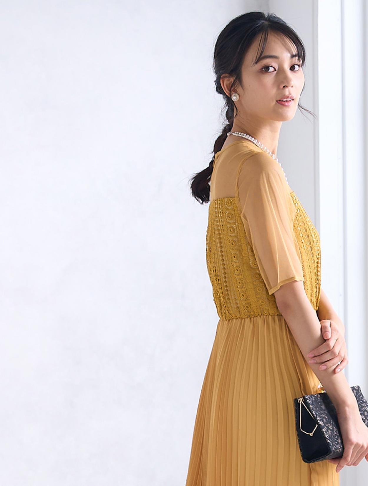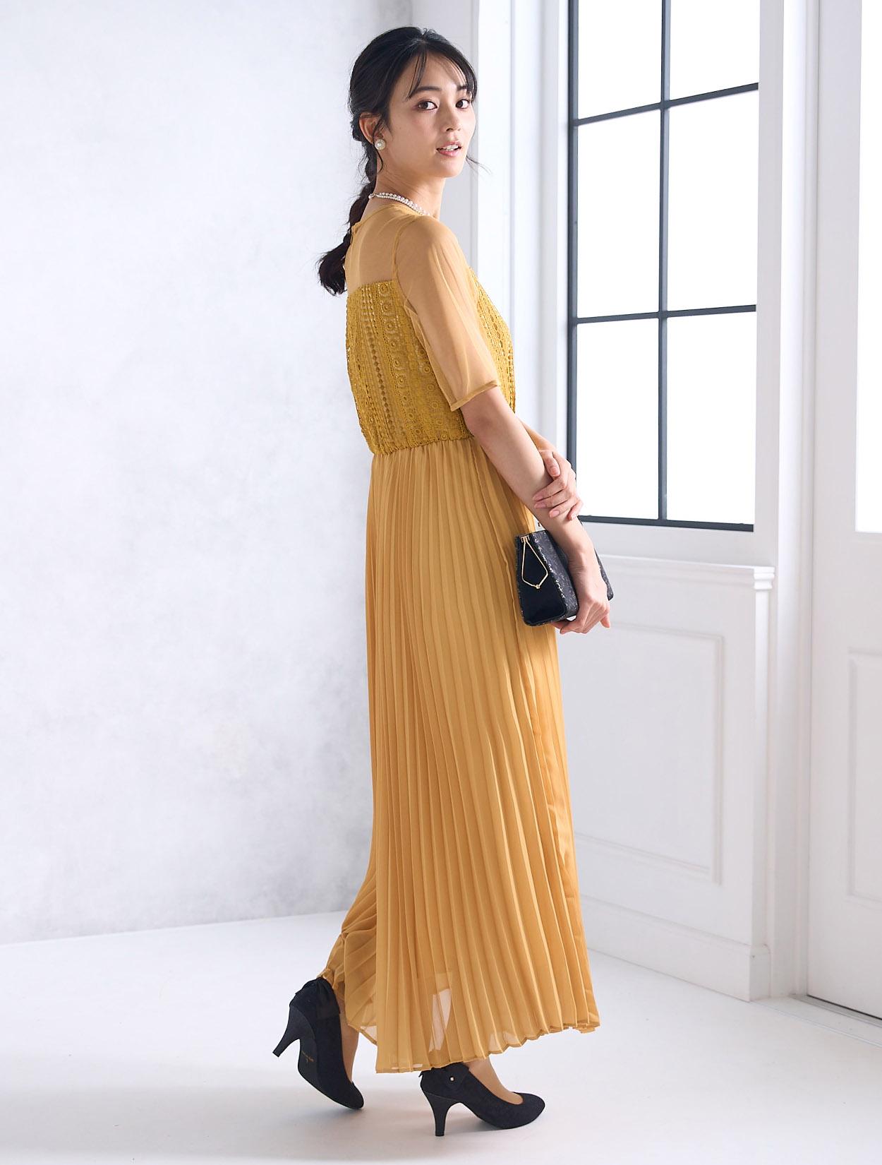 ストライプ調にデザインされたレースとトレンドのプリーツスカートで、しっかり縦のラインを強調してくれるスタイルアップ効果のあるドレス。デコルテ部分のチュールが程よい抜け感を出してくれますが、首元は空き過ぎないデザインなので、上品に着こなせます。ウエスト部分はゴム仕様でストレスなく着られるデザインですが、背中ファスナーで上半身は程よくすっきり見えます。人気の袖ありドレスなので、結婚式でも羽織なしで一枚で着られるのも嬉しいポイント。丈は長めなので、身長が160㎝以上ある方におすすめです。