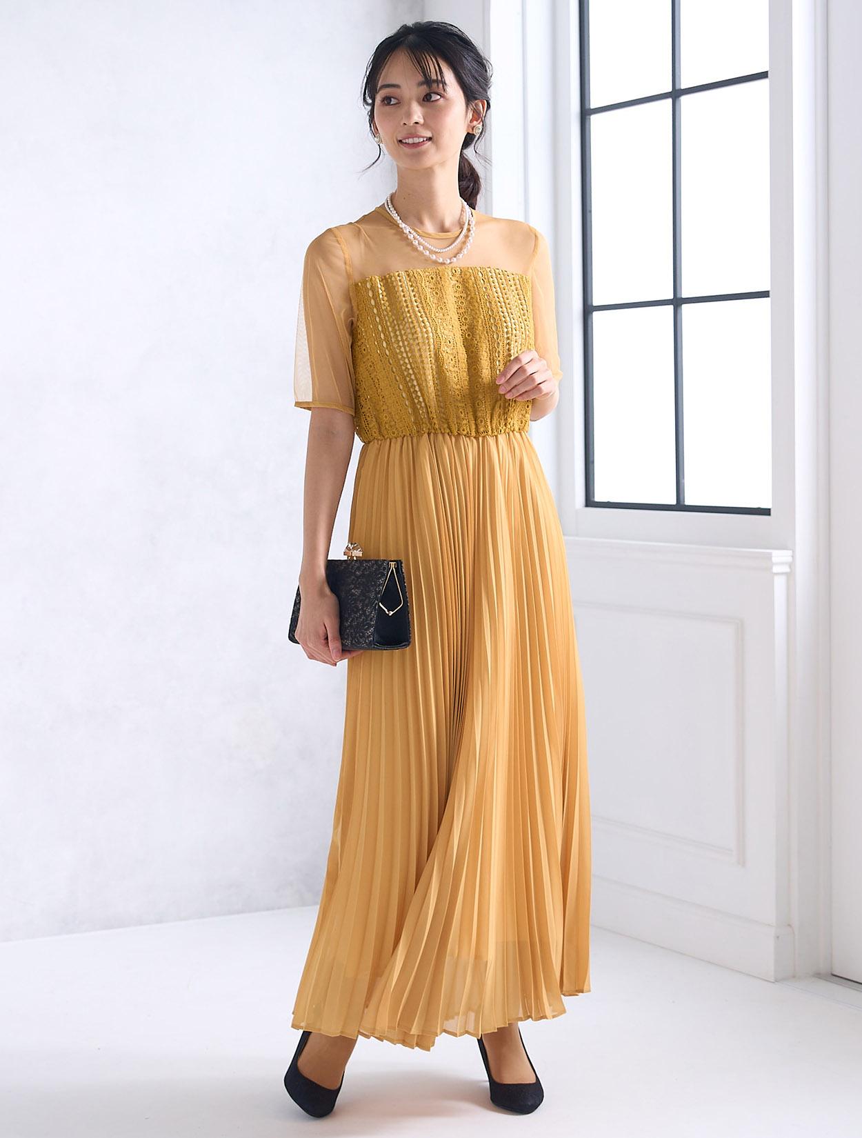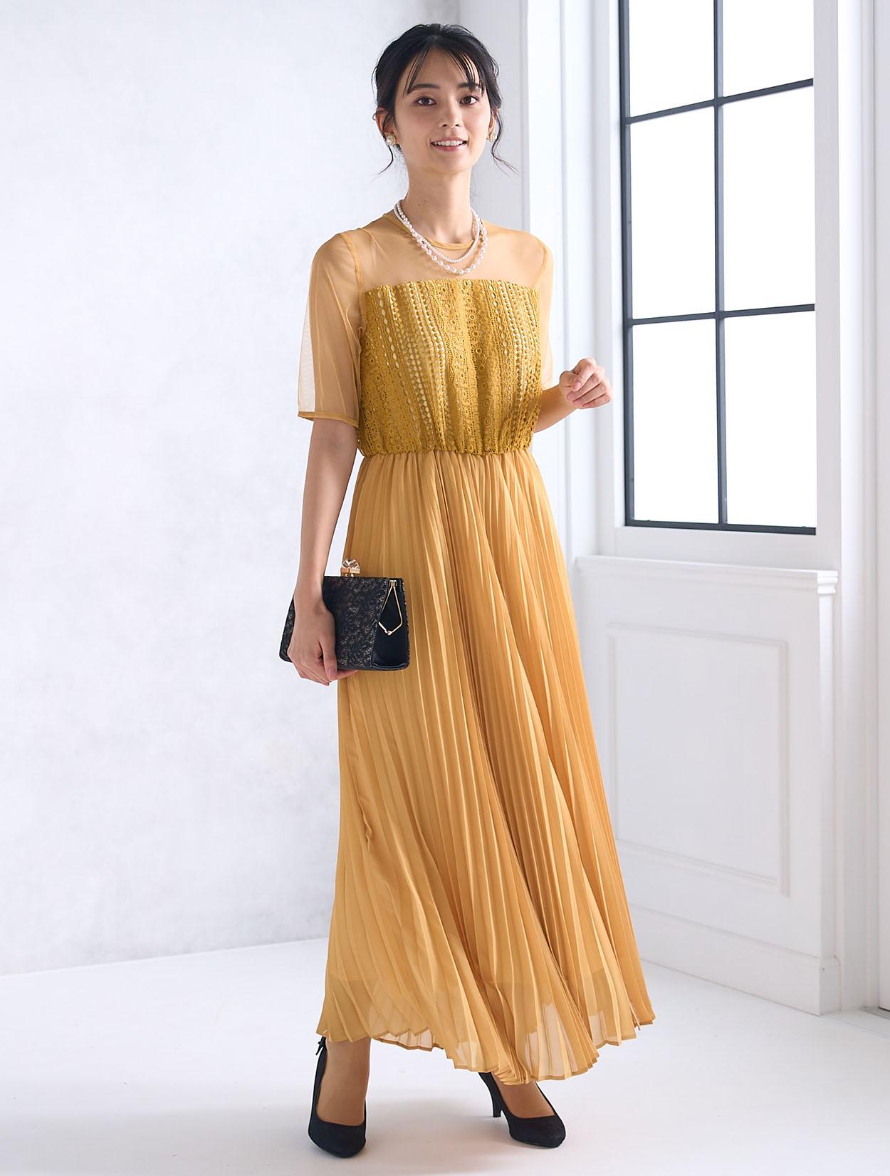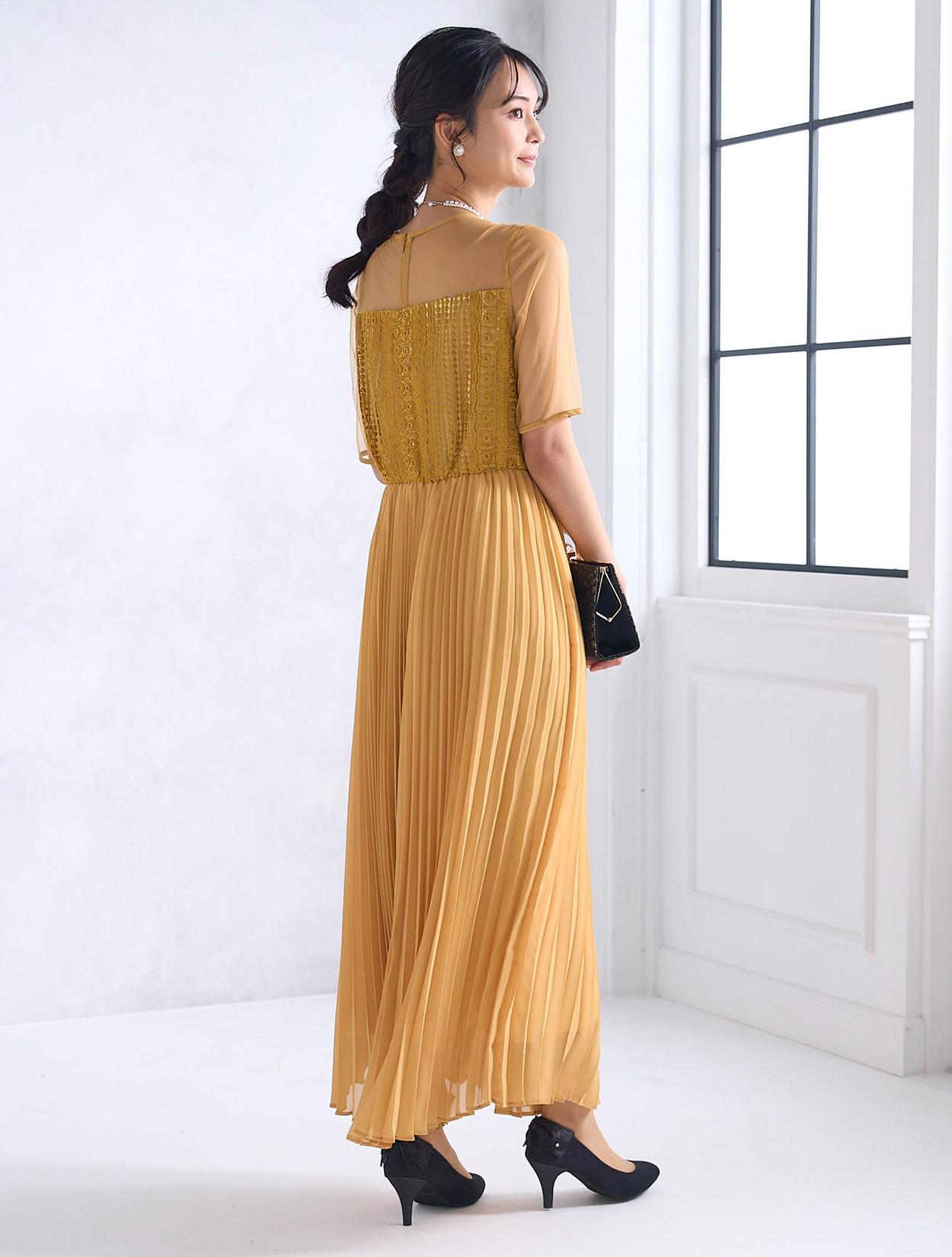 ストライプ調にデザインされたレースとトレンドのプリーツスカートで、しっかり縦のラインを強調してくれるスタイルアップ効果のあるドレス。デコルテ部分のチュールが程よい抜け感を出してくれますが、首元は空き過ぎないデザインなので、上品に着こなせます。ウエスト部分はゴム仕様でストレスなく着られるデザインですが、背中ファスナーで上半身は程よくすっきり見えます。人気の袖ありドレスなので、結婚式でも羽織なしで一枚で着られるのも嬉しいポイント。丈は長めなので、身長が160㎝以上ある方におすすめです。