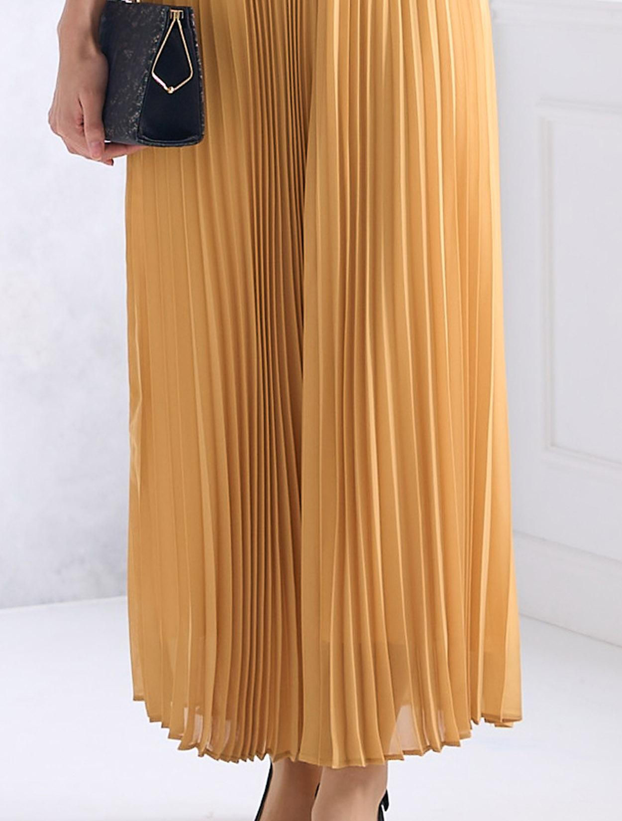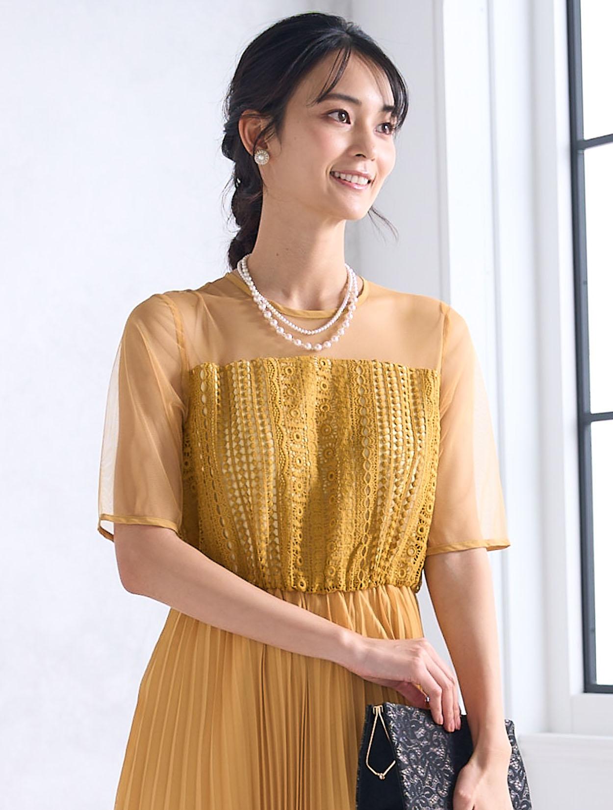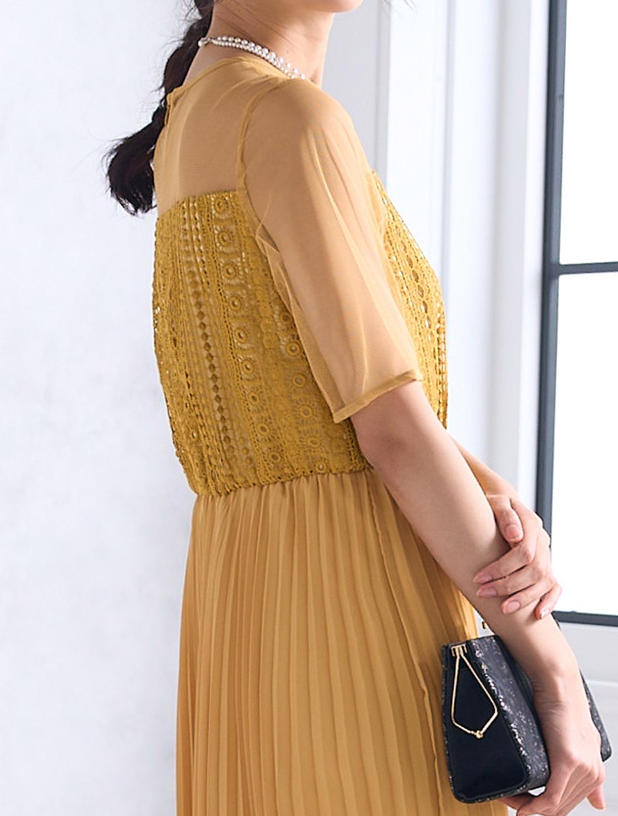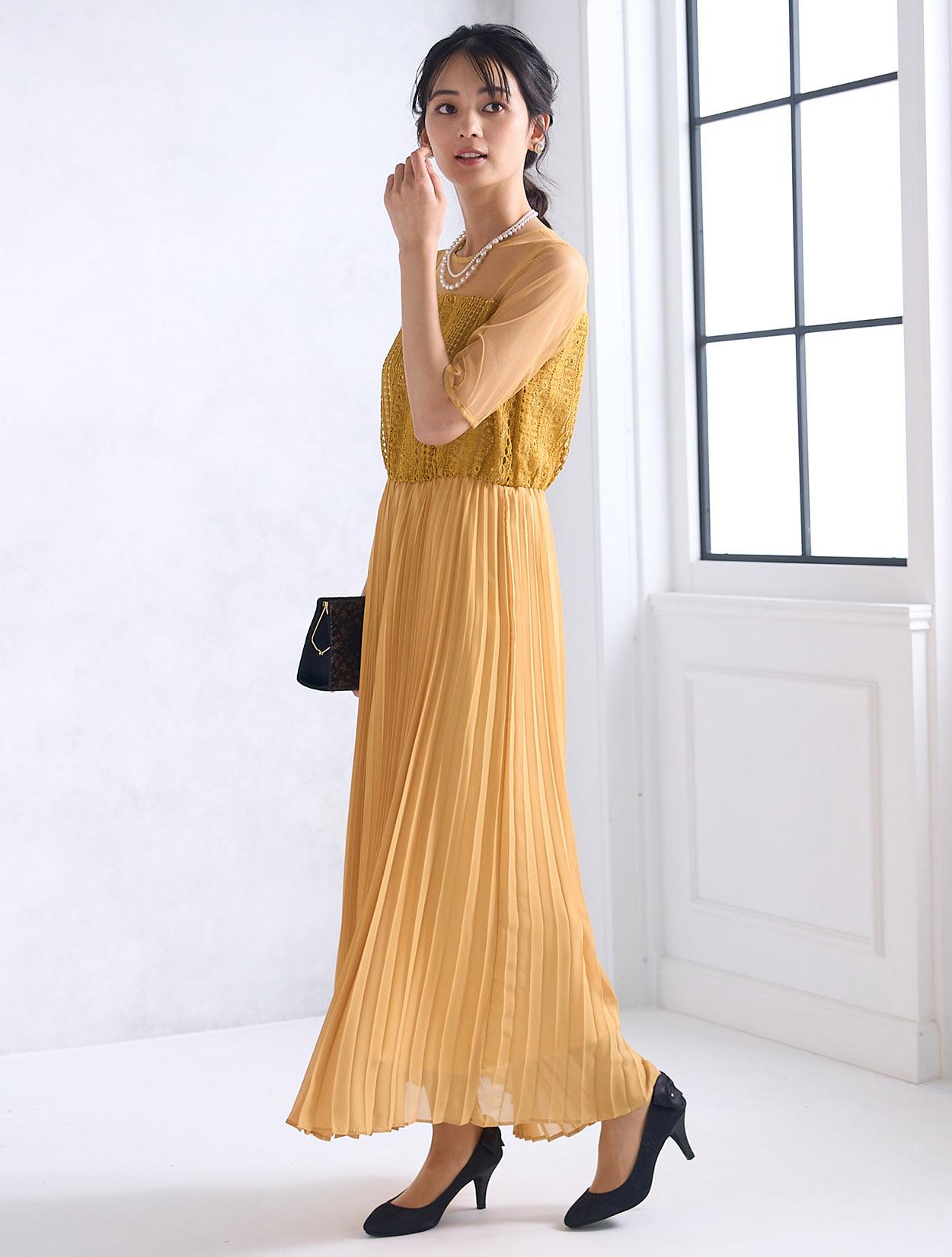 ストライプ調にデザインされたレースとトレンドのプリーツスカートで、しっかり縦のラインを強調してくれるスタイルアップ効果のあるドレス。デコルテ部分のチュールが程よい抜け感を出してくれますが、首元は空き過ぎないデザインなので、上品に着こなせます。ウエスト部分はゴム仕様でストレスなく着られるデザインですが、背中ファスナーで上半身は程よくすっきり見えます。人気の袖ありドレスなので、結婚式でも羽織なしで一枚で着られるのも嬉しいポイント。丈は長めなので、身長が160㎝以上ある方におすすめです。