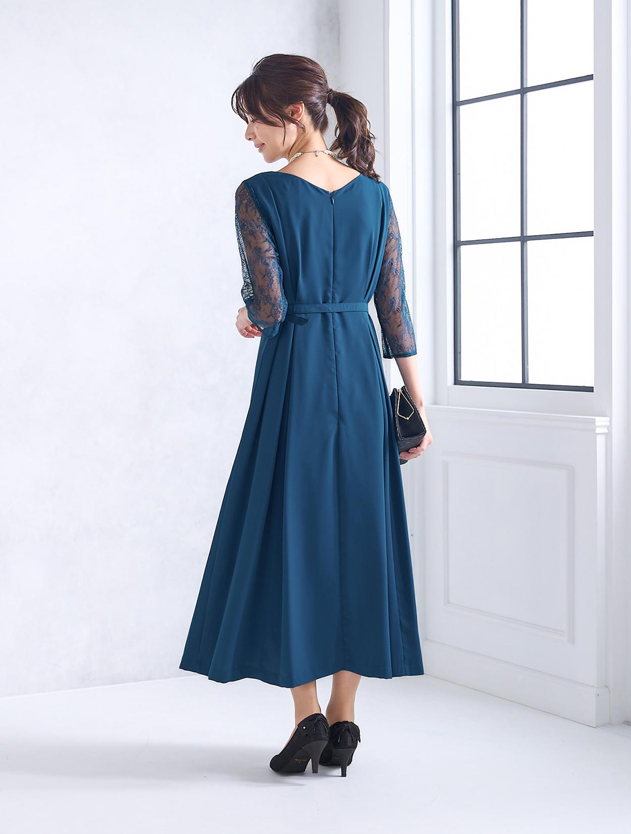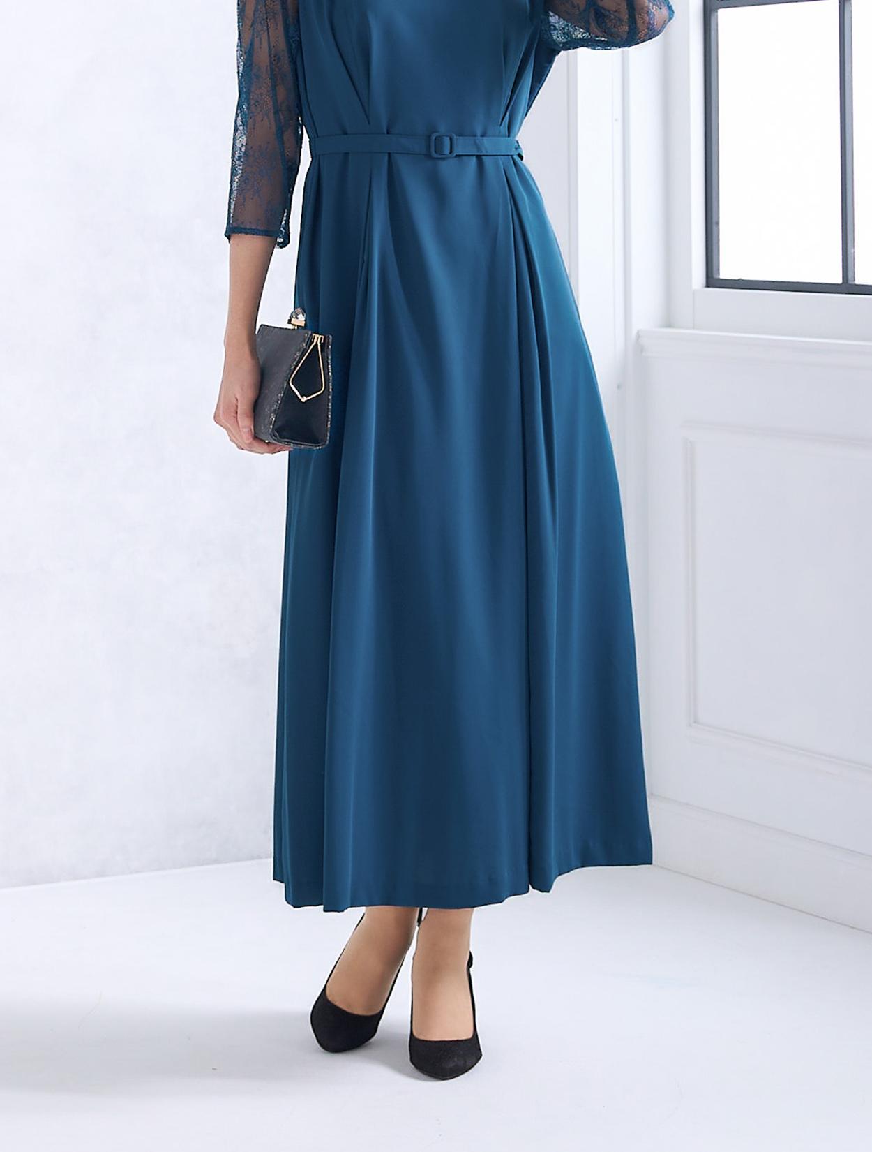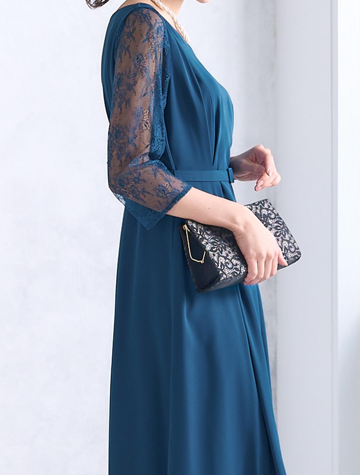 ウエストを境に上半身にもスカートにもダーツを入れた立体的なデザインのドレスで、着用した時の身体のラインがとてもきれいに見えます。ウエストマークのベルトが付いているの、さらにメリハリのあるすっきりしたラインで着こなせます。ベルトはドレスと共布なので、フォーマルな場面や格式ある会場でも◎。横に広い浅めのVネックは、首元やお顔回りに余裕を待たせてくれるので首が短いのがお悩みの方にもおすすめです。お袖のみエレガントなレースで、一部に程よい透け感があるので重たくなりすぎません。全体的には露出は少ないドレスなので、親族ドレスとしても安心して着用できます。