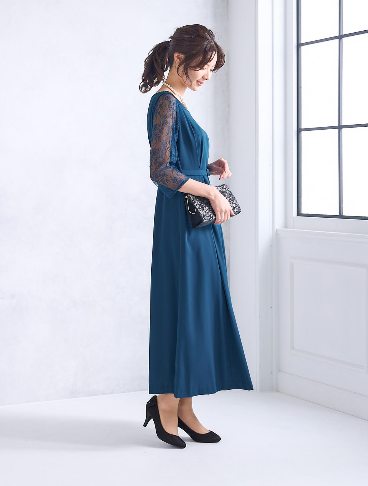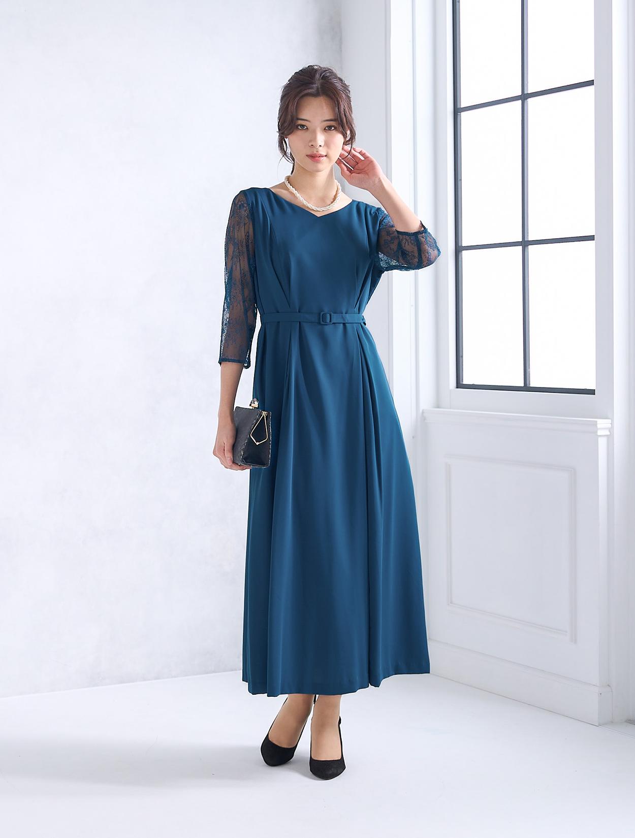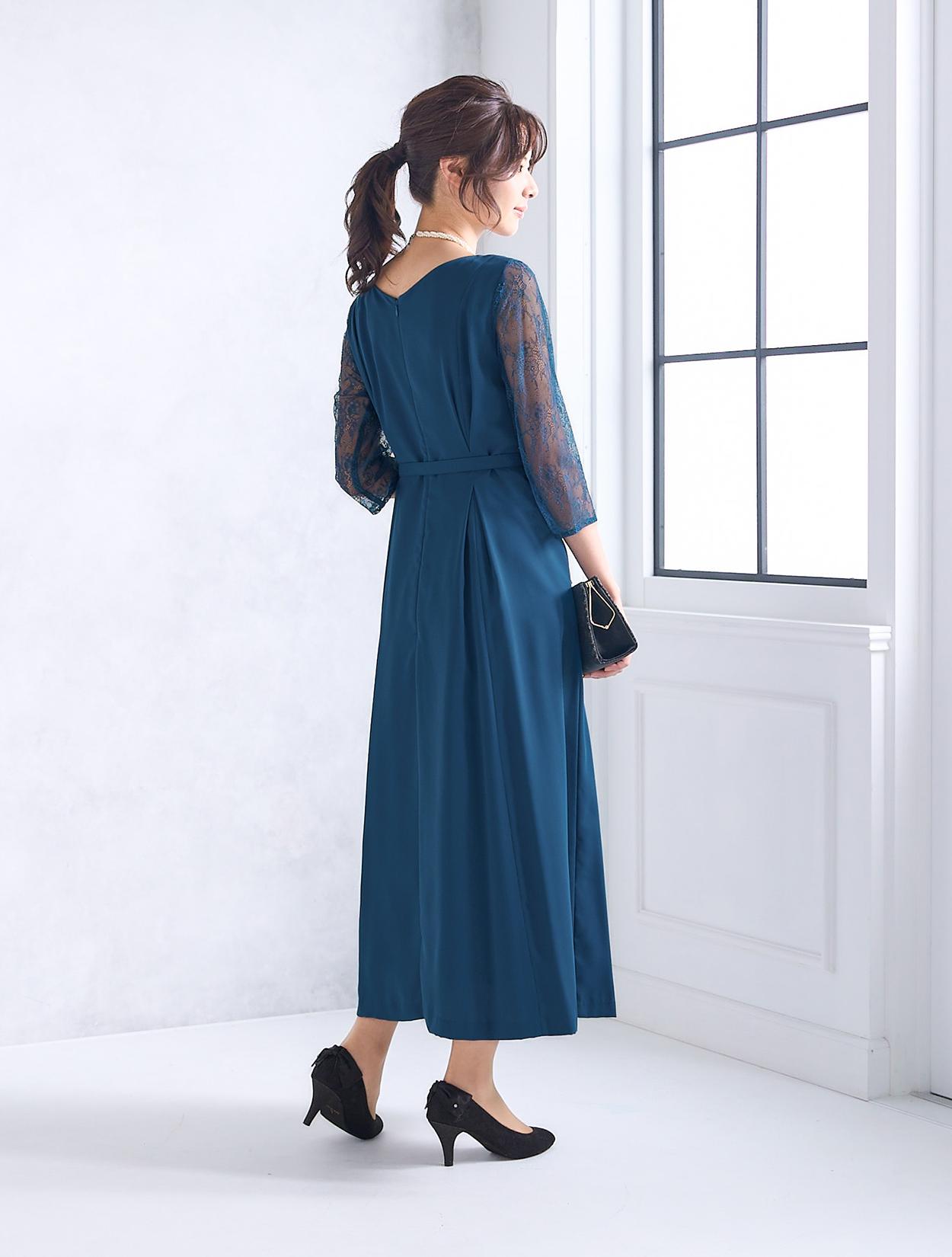 ウエストを境に上半身にもスカートにもダーツを入れた立体的なデザインのドレスで、着用した時の身体のラインがとてもきれいに見えます。ウエストマークのベルトが付いているの、さらにメリハリのあるすっきりしたラインで着こなせます。ベルトはドレスと共布なので、フォーマルな場面や格式ある会場でも◎。横に広い浅めのVネックは、首元やお顔回りに余裕を待たせてくれるので首が短いのがお悩みの方にもおすすめです。お袖のみエレガントなレースで、一部に程よい透け感があるので重たくなりすぎません。全体的には露出は少ないドレスなので、親族ドレスとしても安心して着用できます。