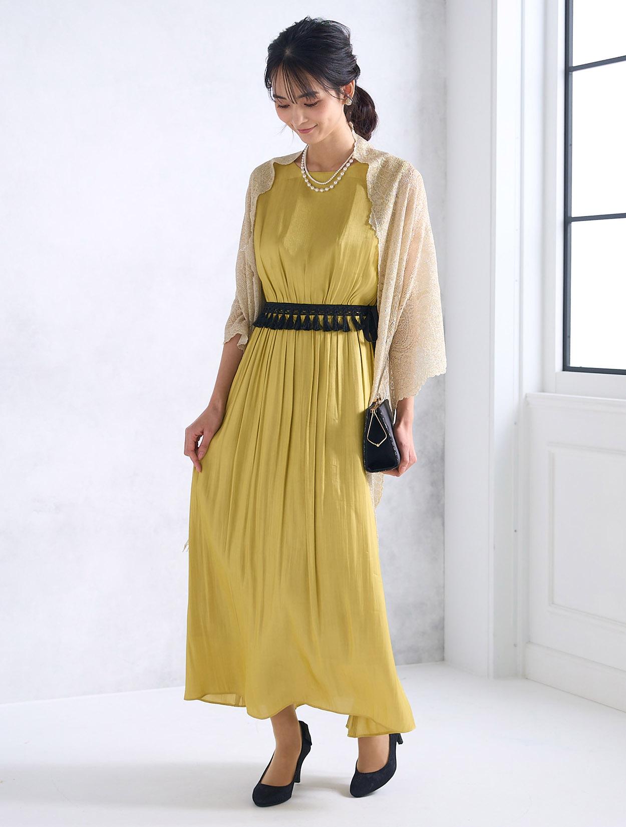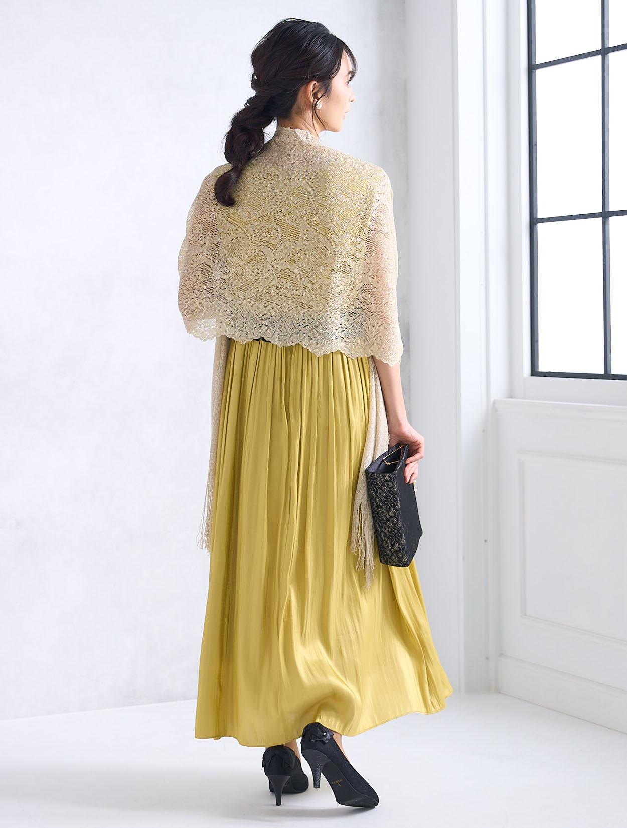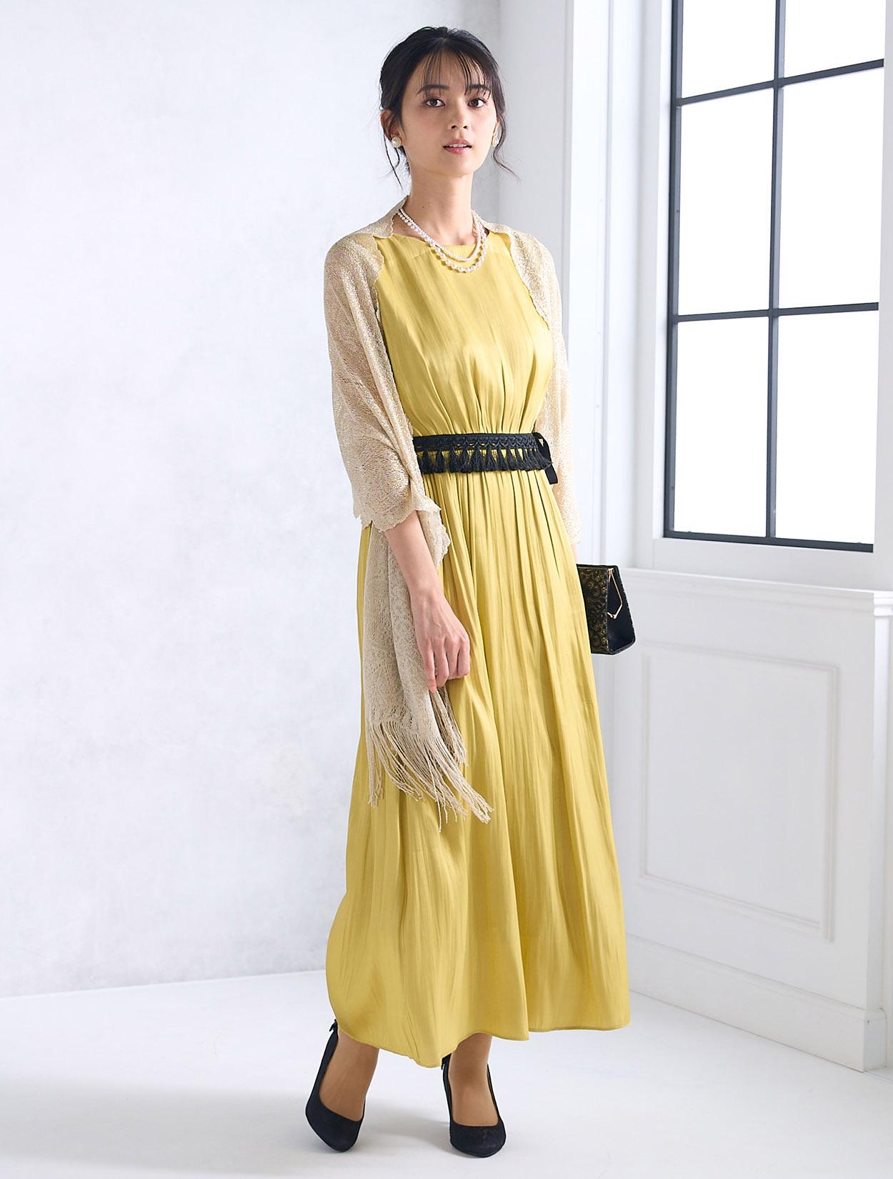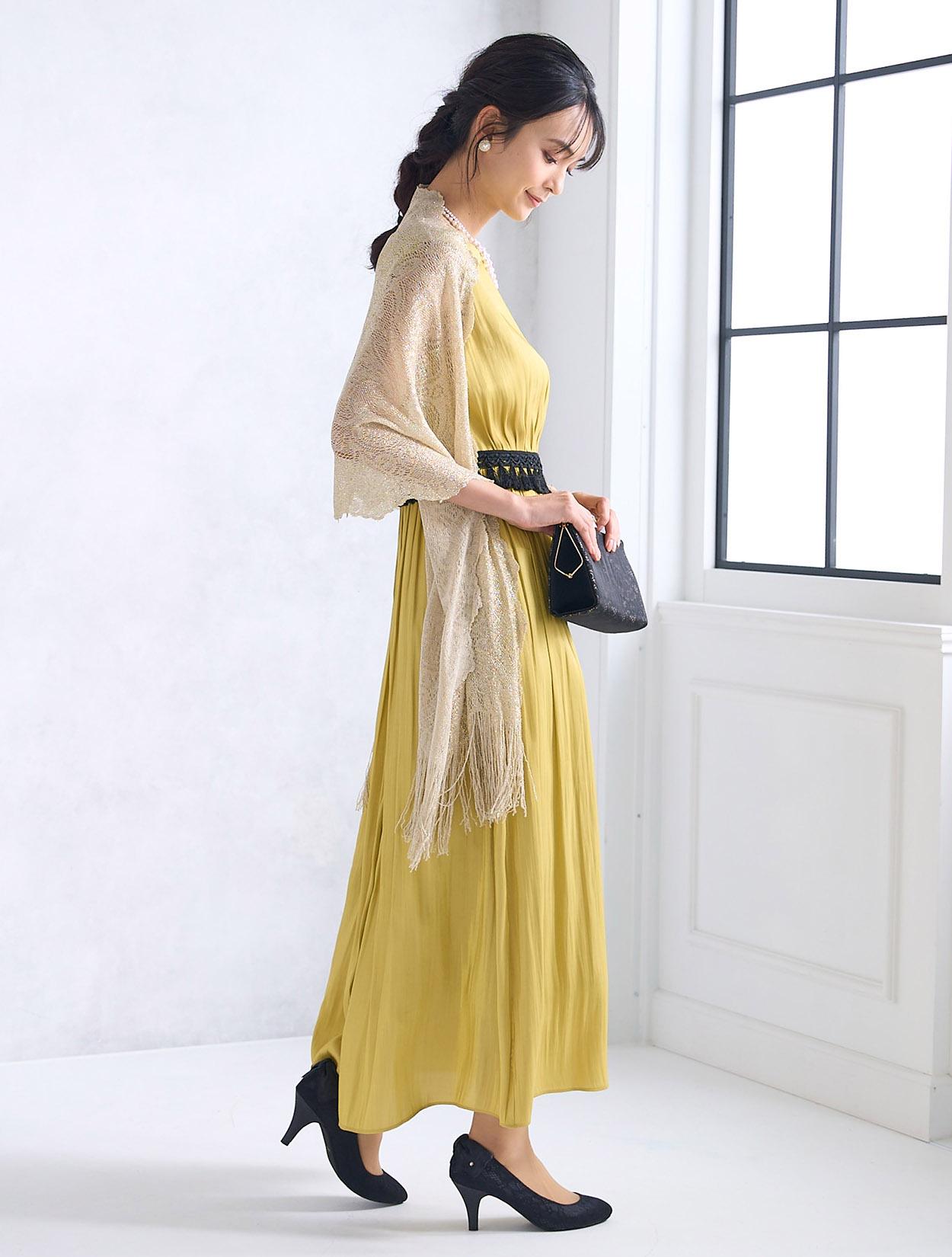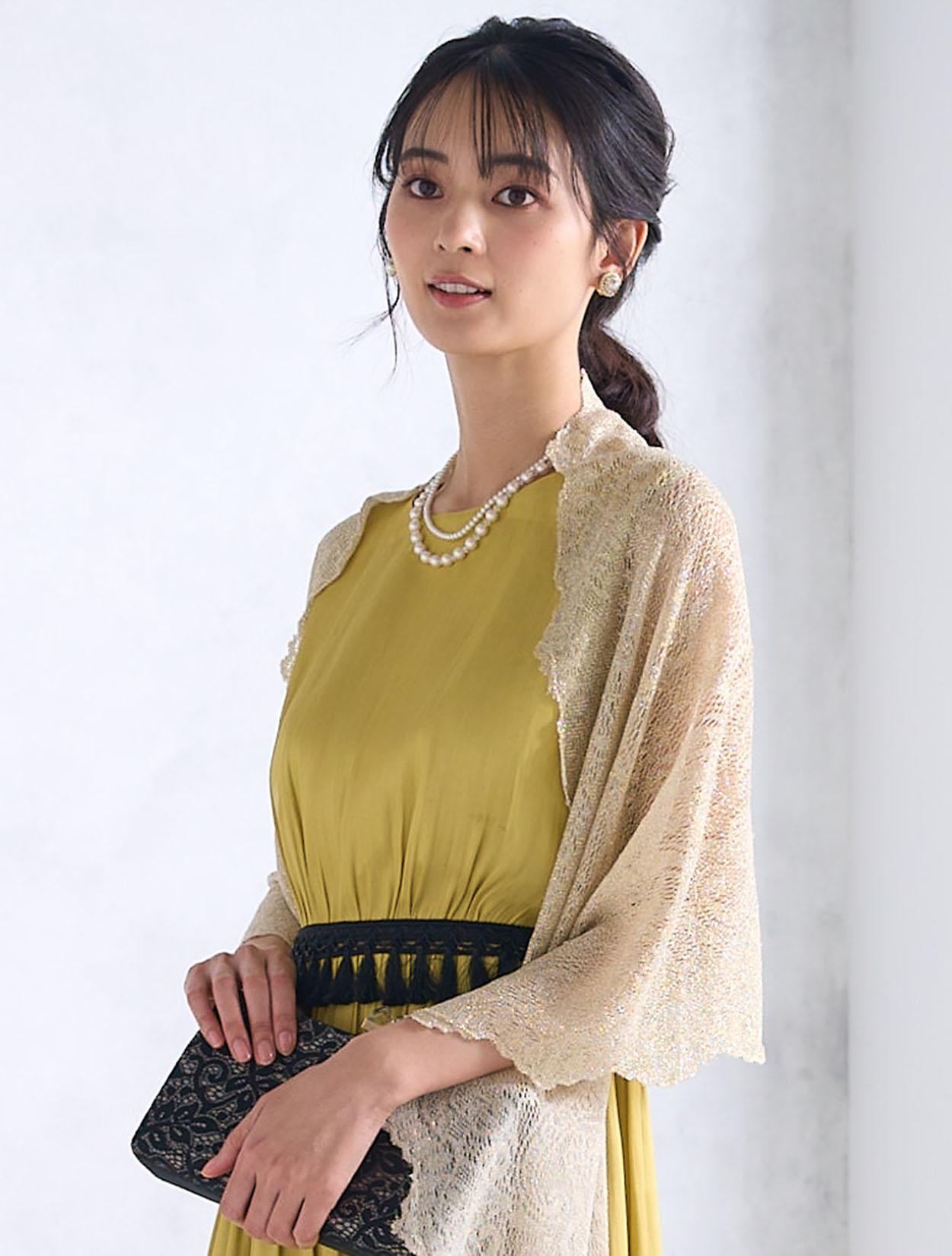 華やかなイエロードレスにゴールドのラメショールでさらにパーティー感アップ!ブラックのバッグでメリハリを出した甘辛MIXコーディネートです。