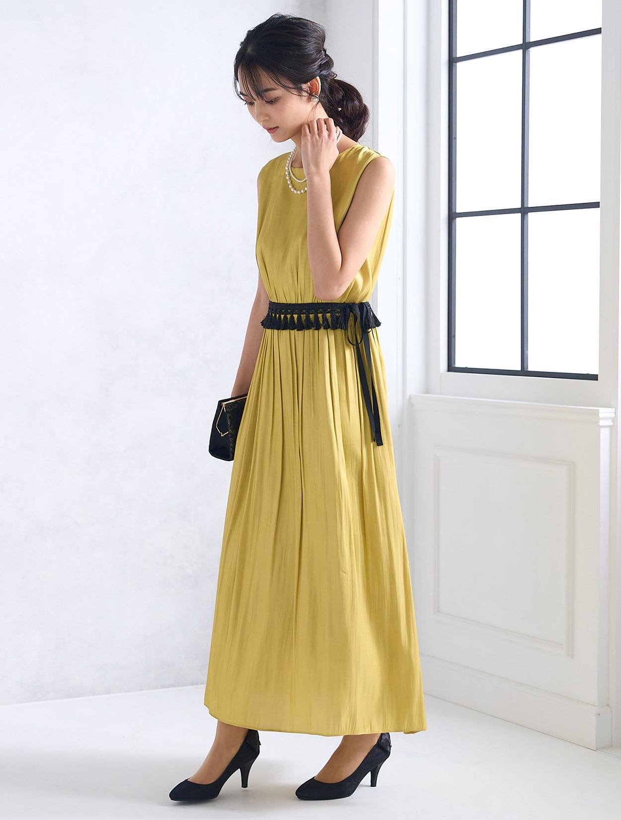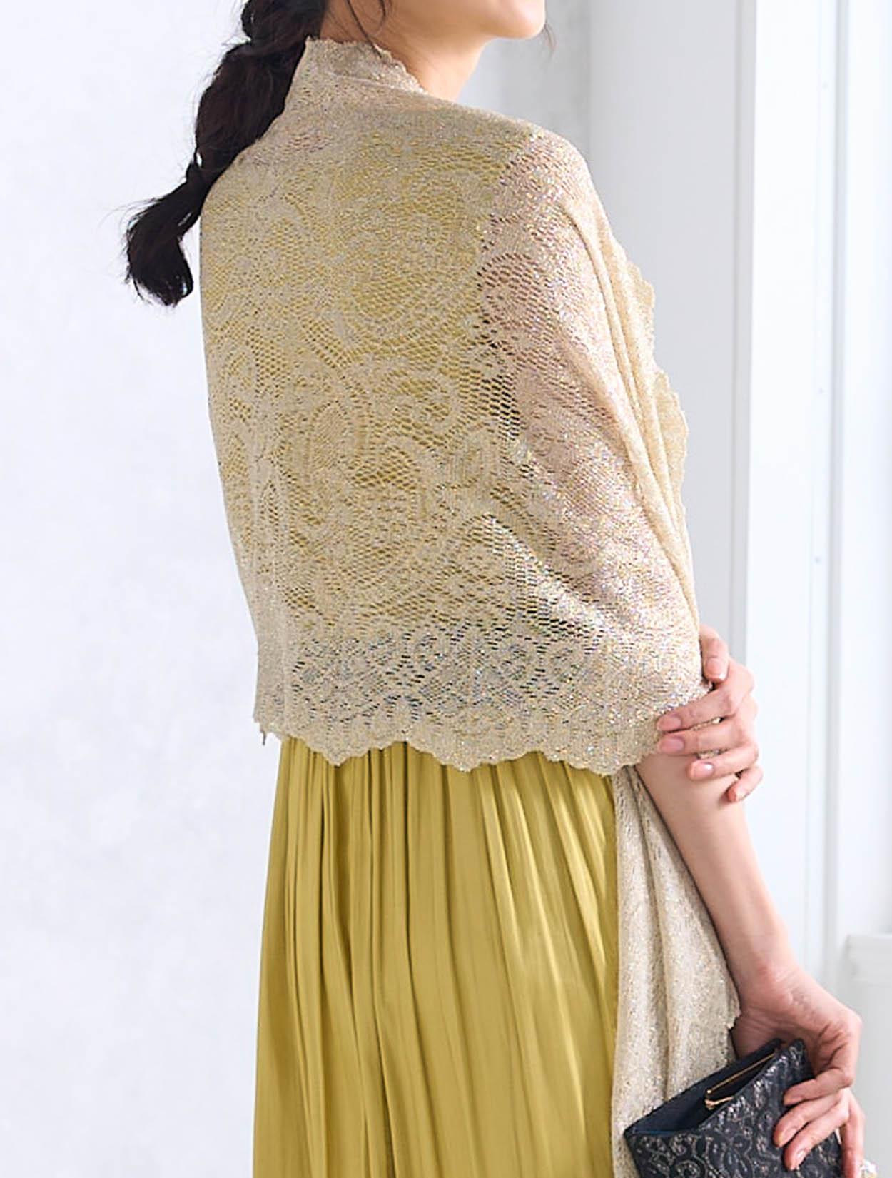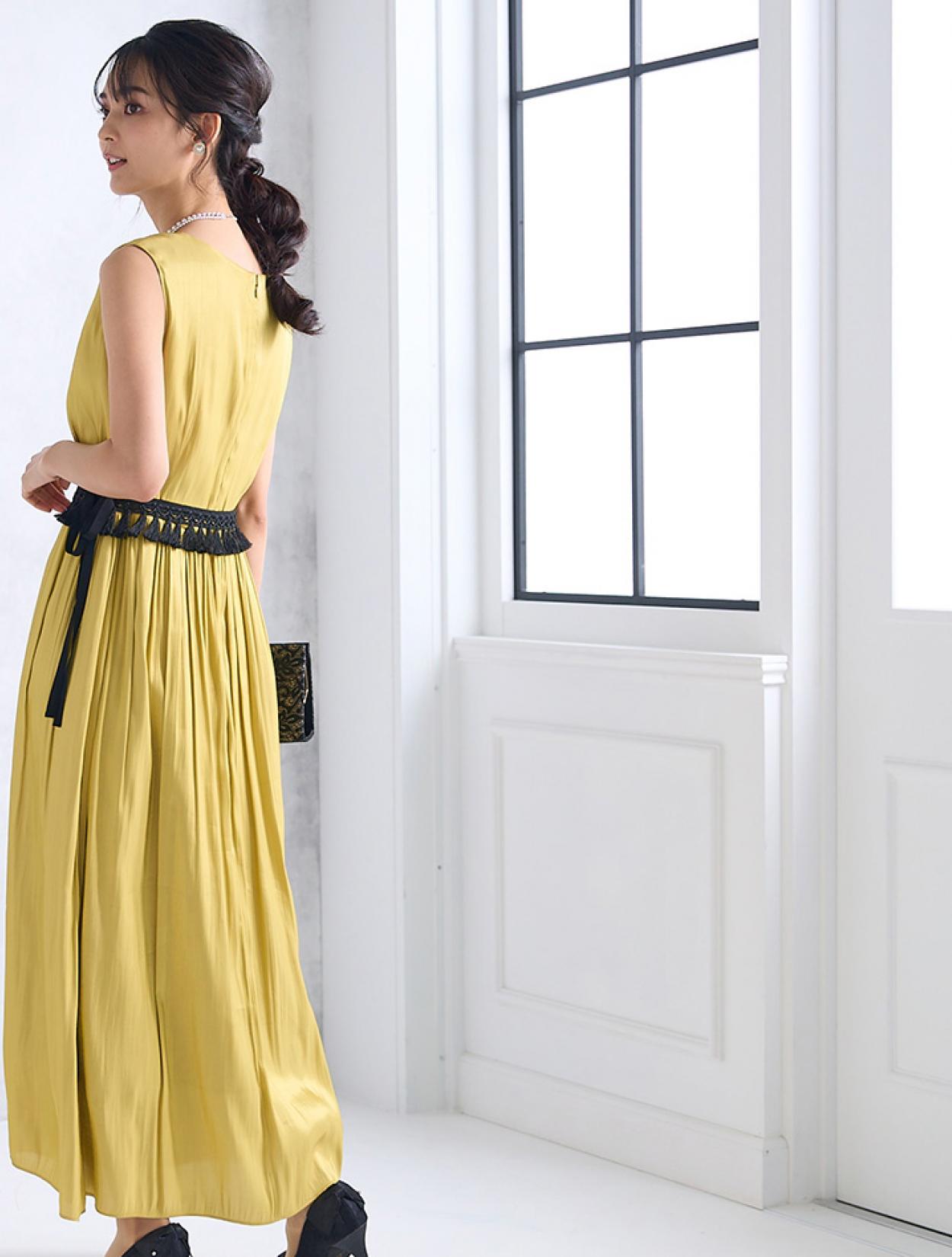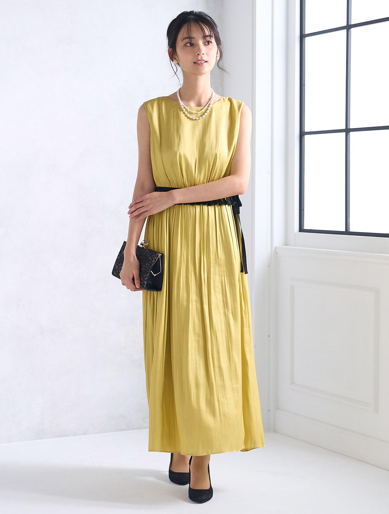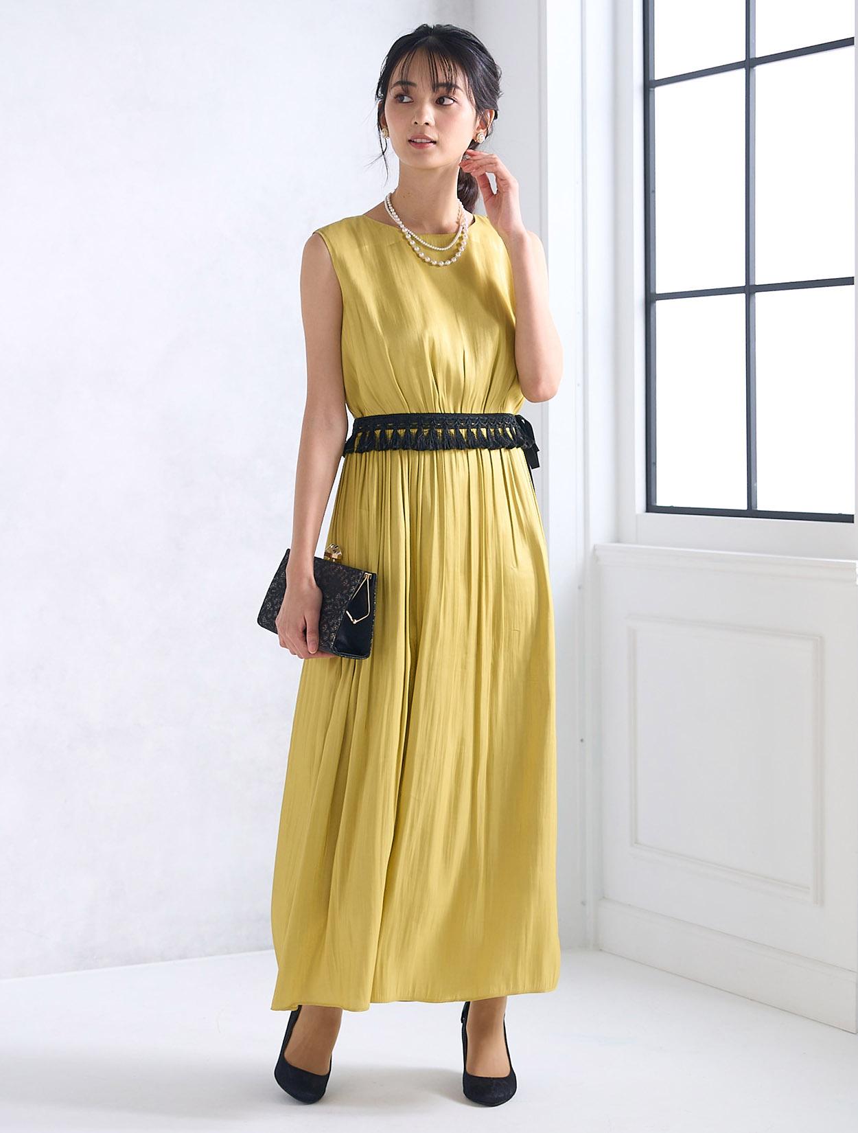 華やかなイエロードレスにゴールドのラメショールでさらにパーティー感アップ!ブラックのバッグでメリハリを出した甘辛MIXコーディネートです。
