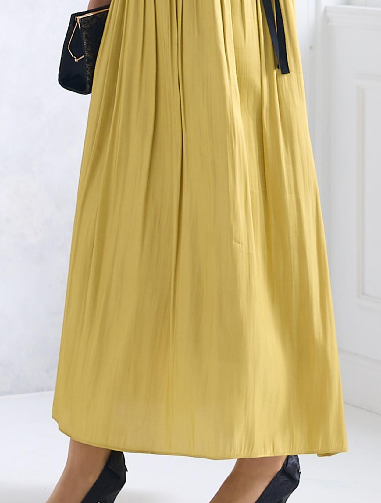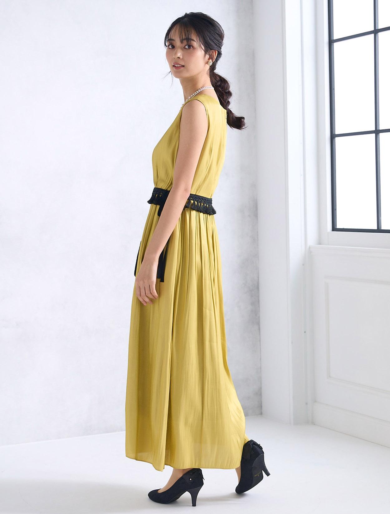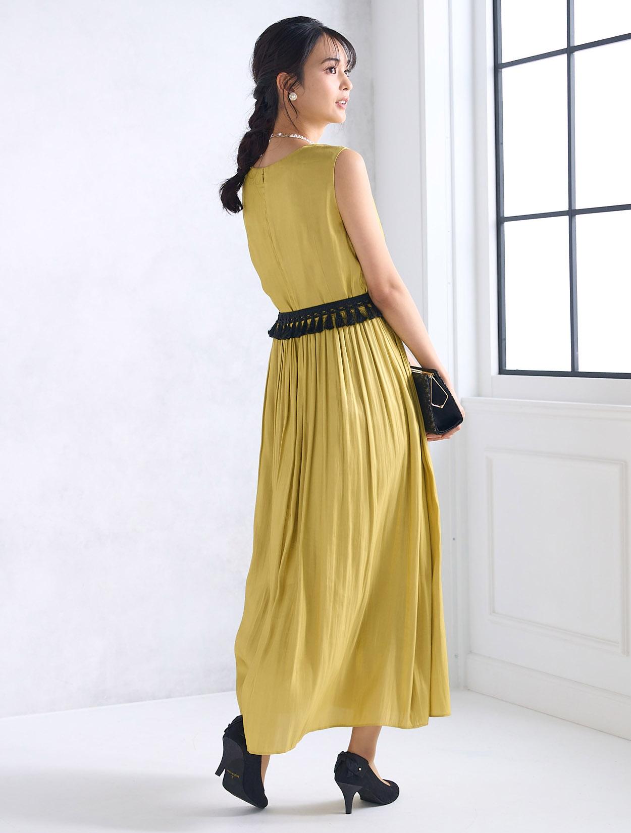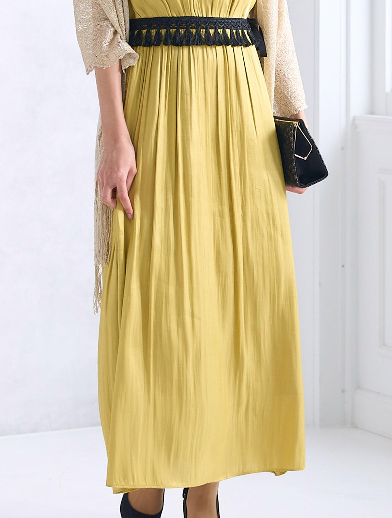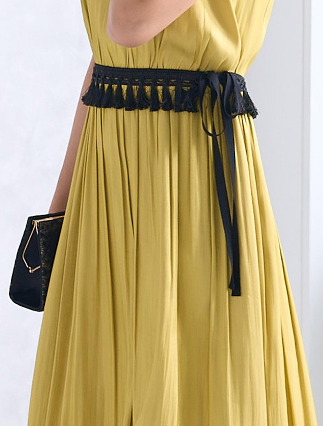 ウエストのフリンジベルトがアクセント。あまりないフリンジのベルトは、おしゃれさんや個性派さんに人気です。ウエストはゴム仕様で、全体的にゆったりした作りなのでストレスフリーに着られます。ウエストにはたっぷりとギャザーをとって生地をふんだんに使っているので、カジュアルに見え過ぎず高級感もあります。さりげなくラメの糸を入れ込んでいるので、角度によって光沢が変化するのもポイントです。
