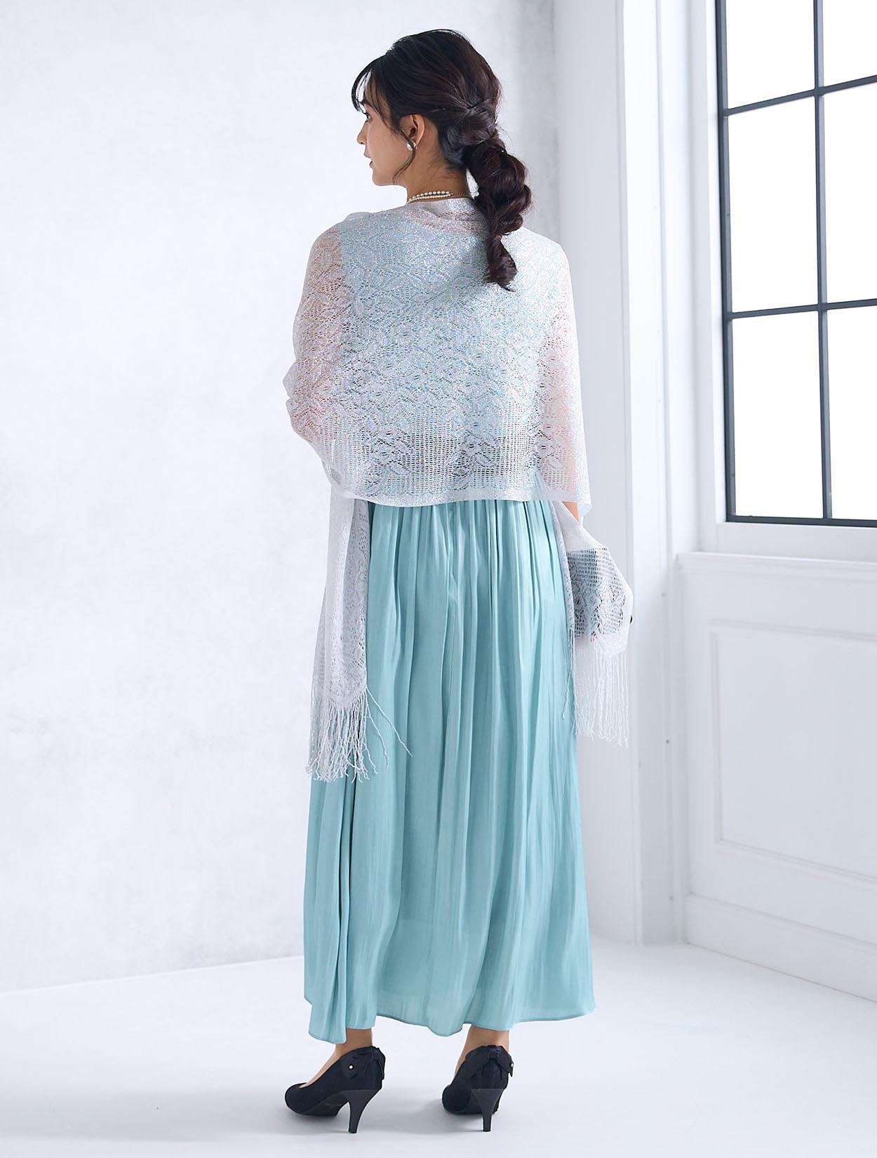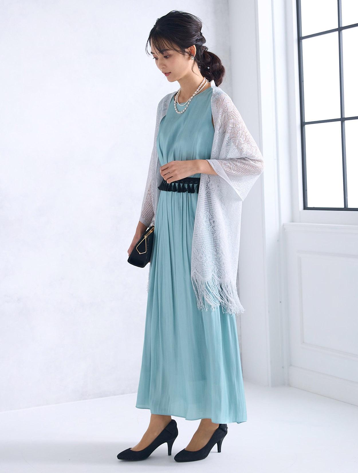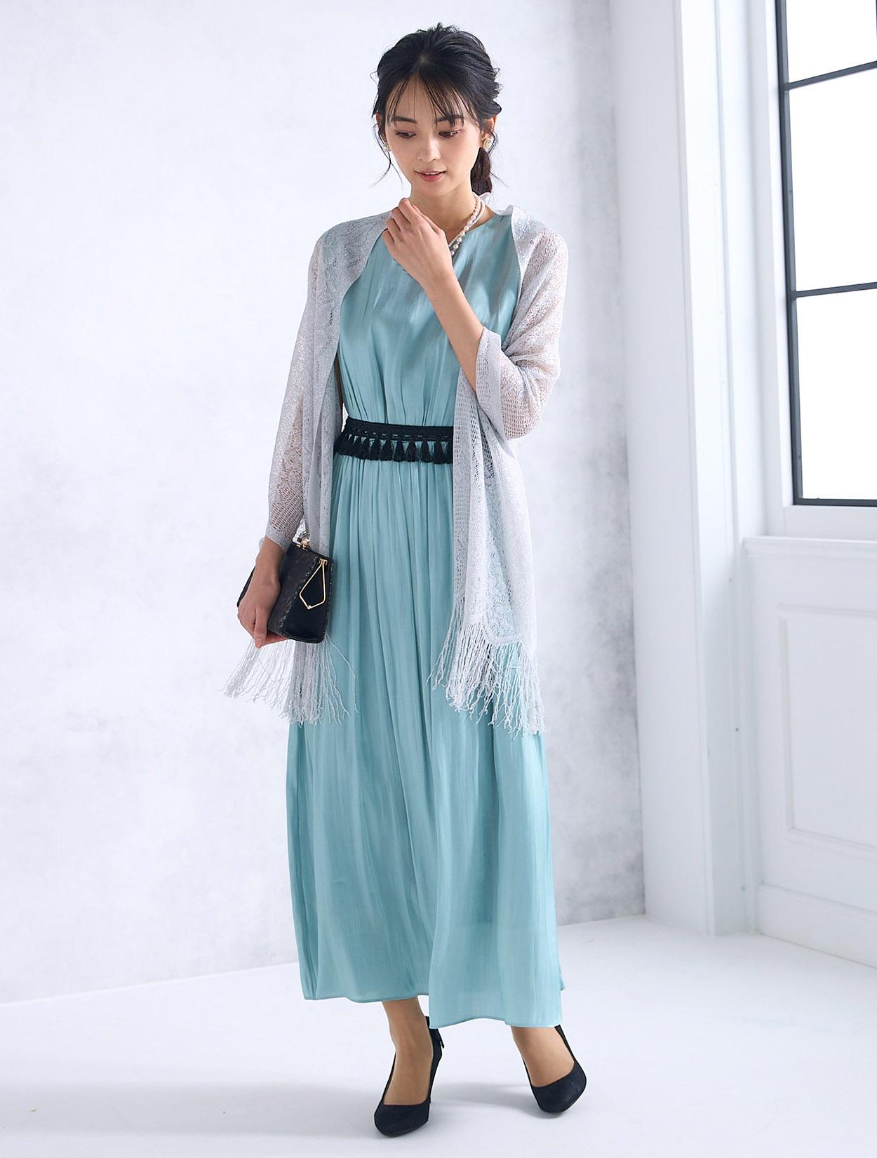 サックスブルーのドレスにシルバーショールが爽やかな清涼感のあるコーディネート。ブラックの差し色で大人っぽいメリハリをプラス。特に夏におすすめのコーデです。