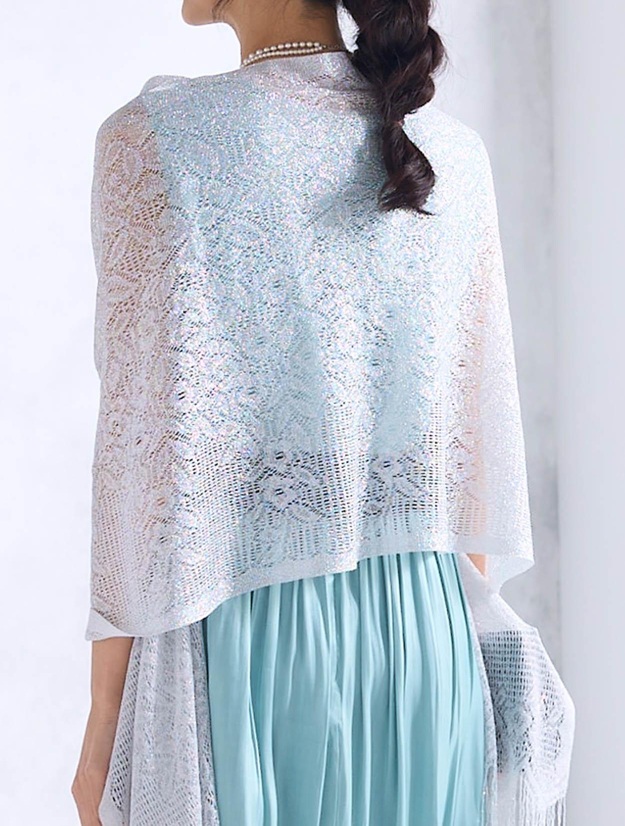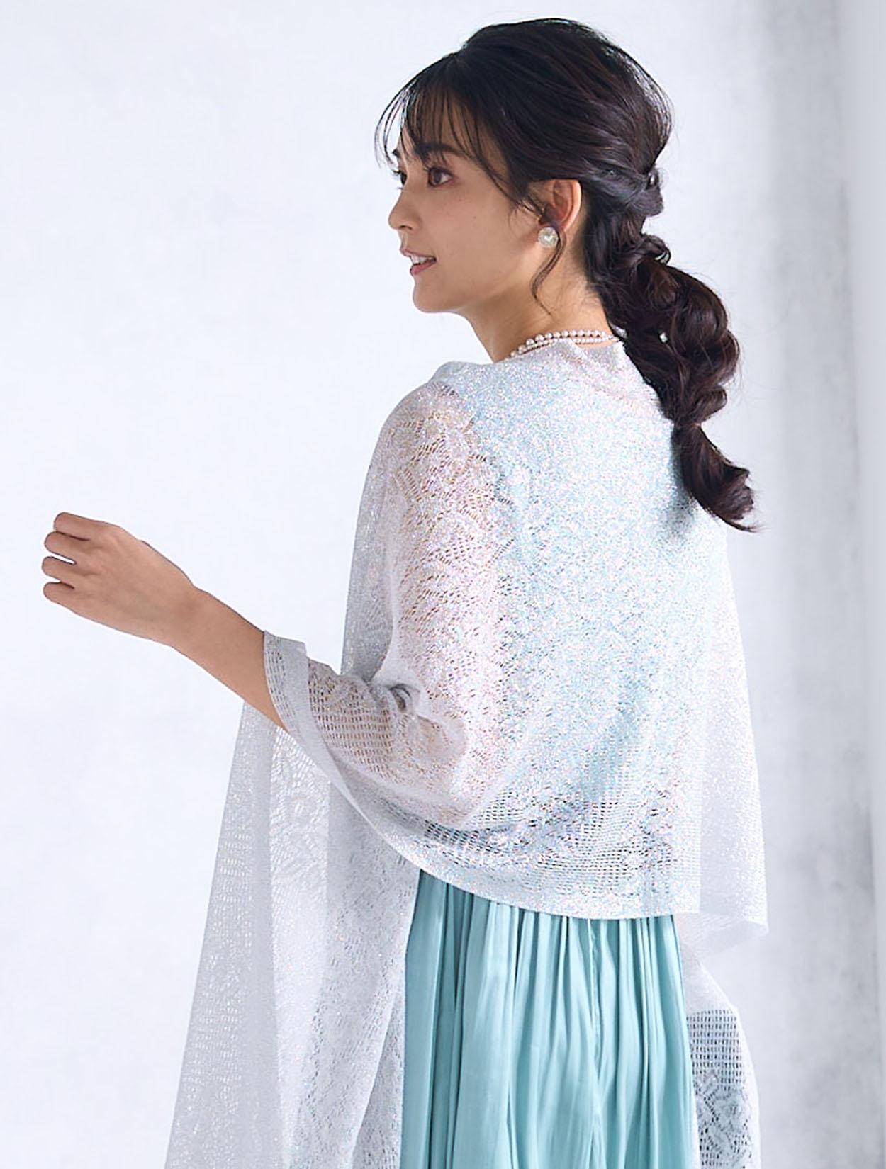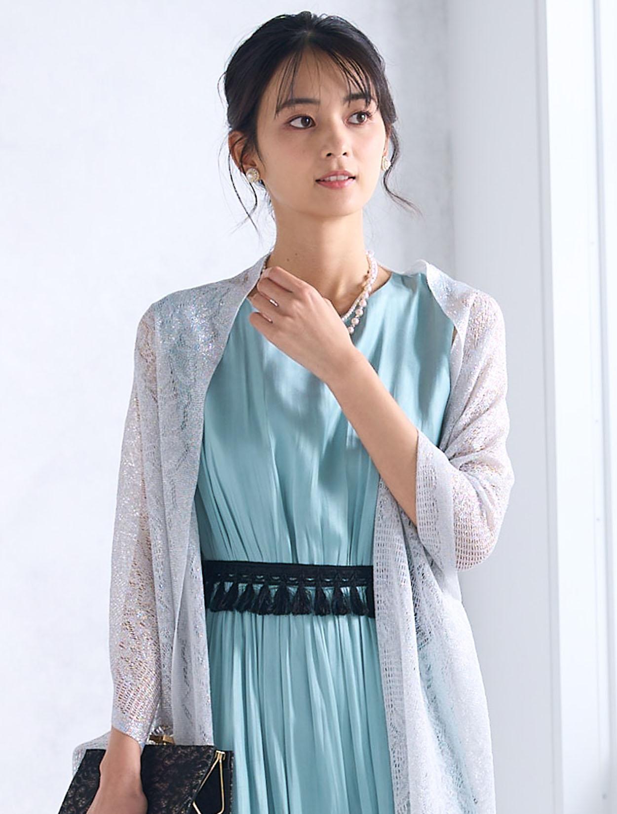 サックスブルーのドレスにシルバーショールが爽やかな清涼感のあるコーディネート。ブラックの差し色で大人っぽいメリハリをプラス。特に夏におすすめのコーデです。