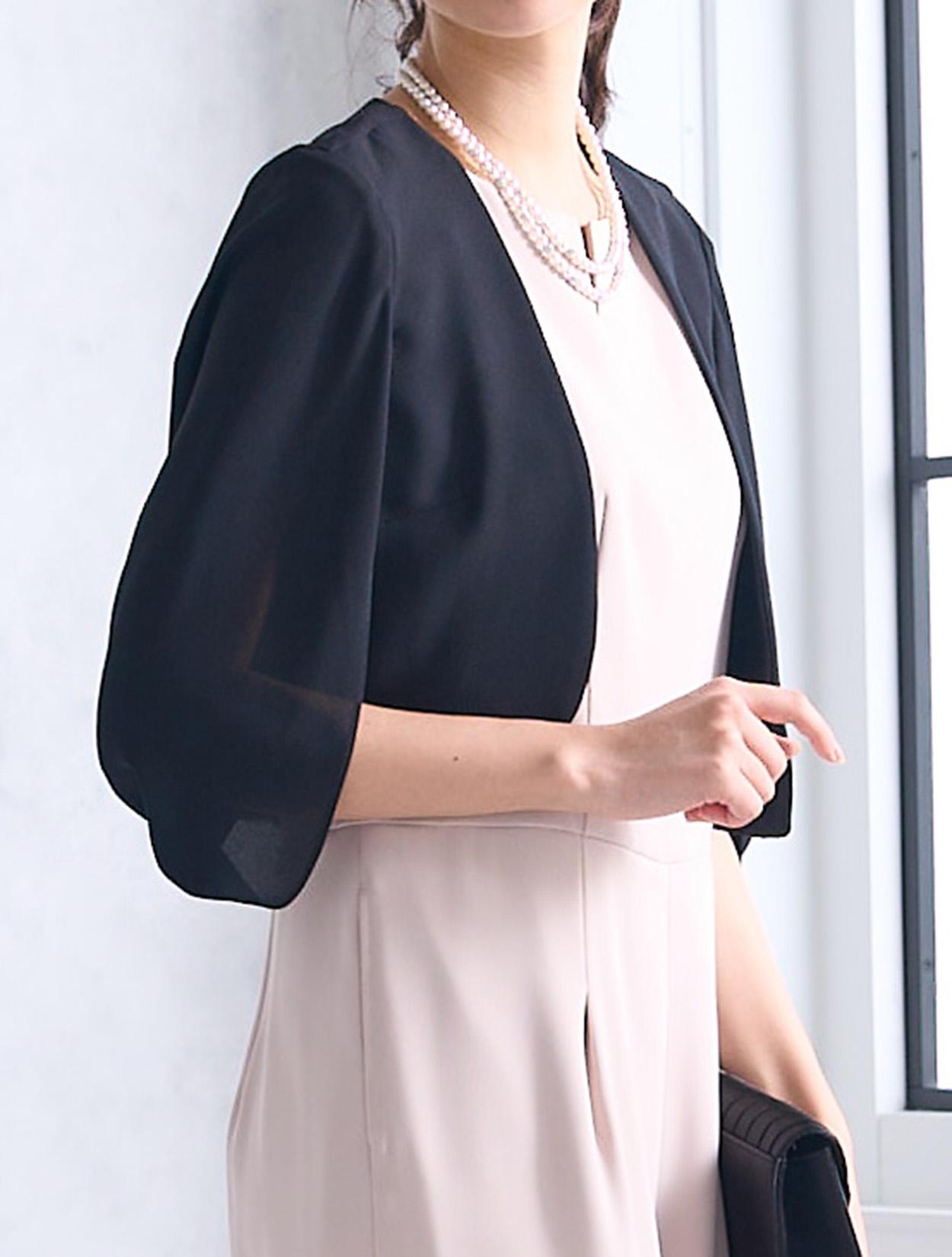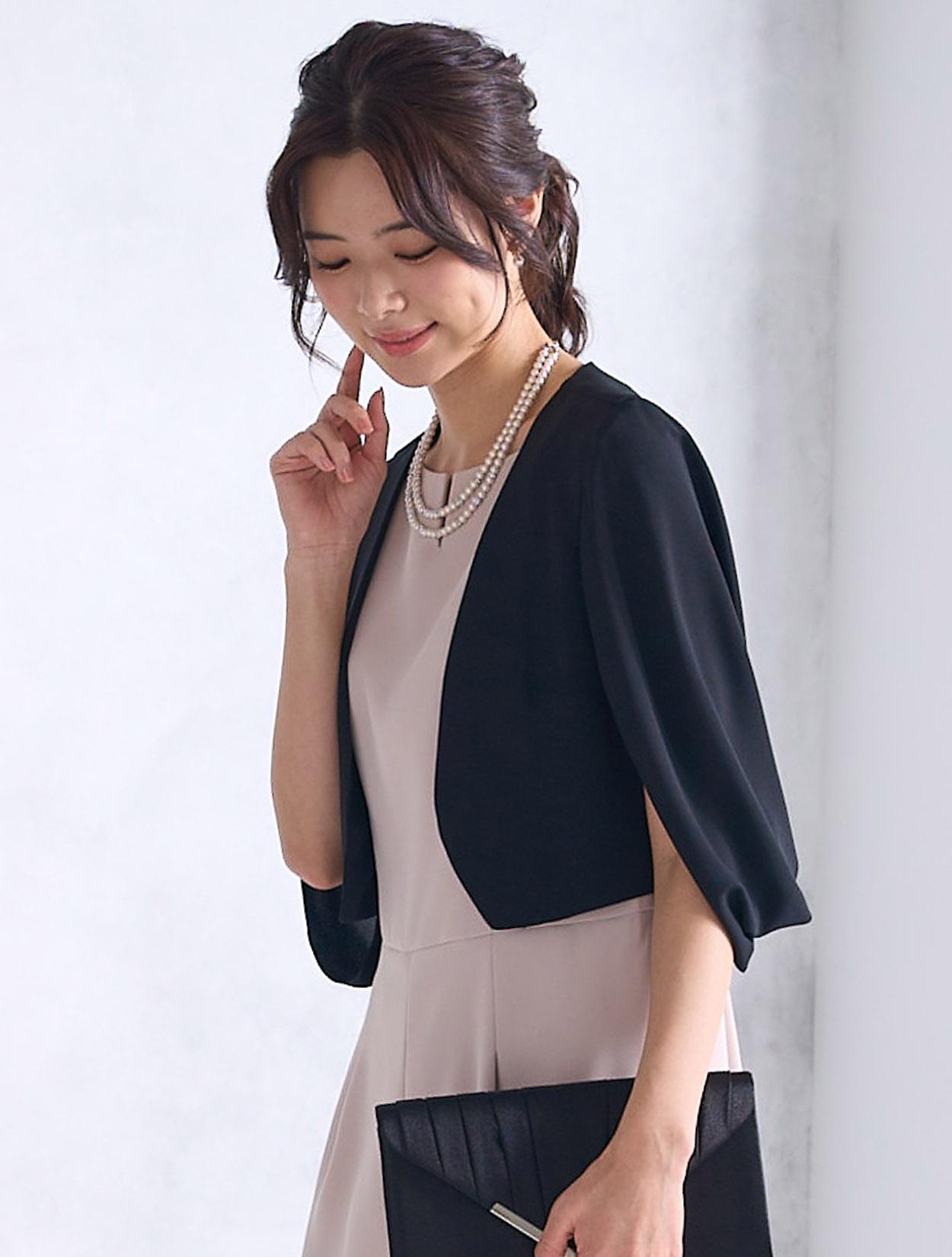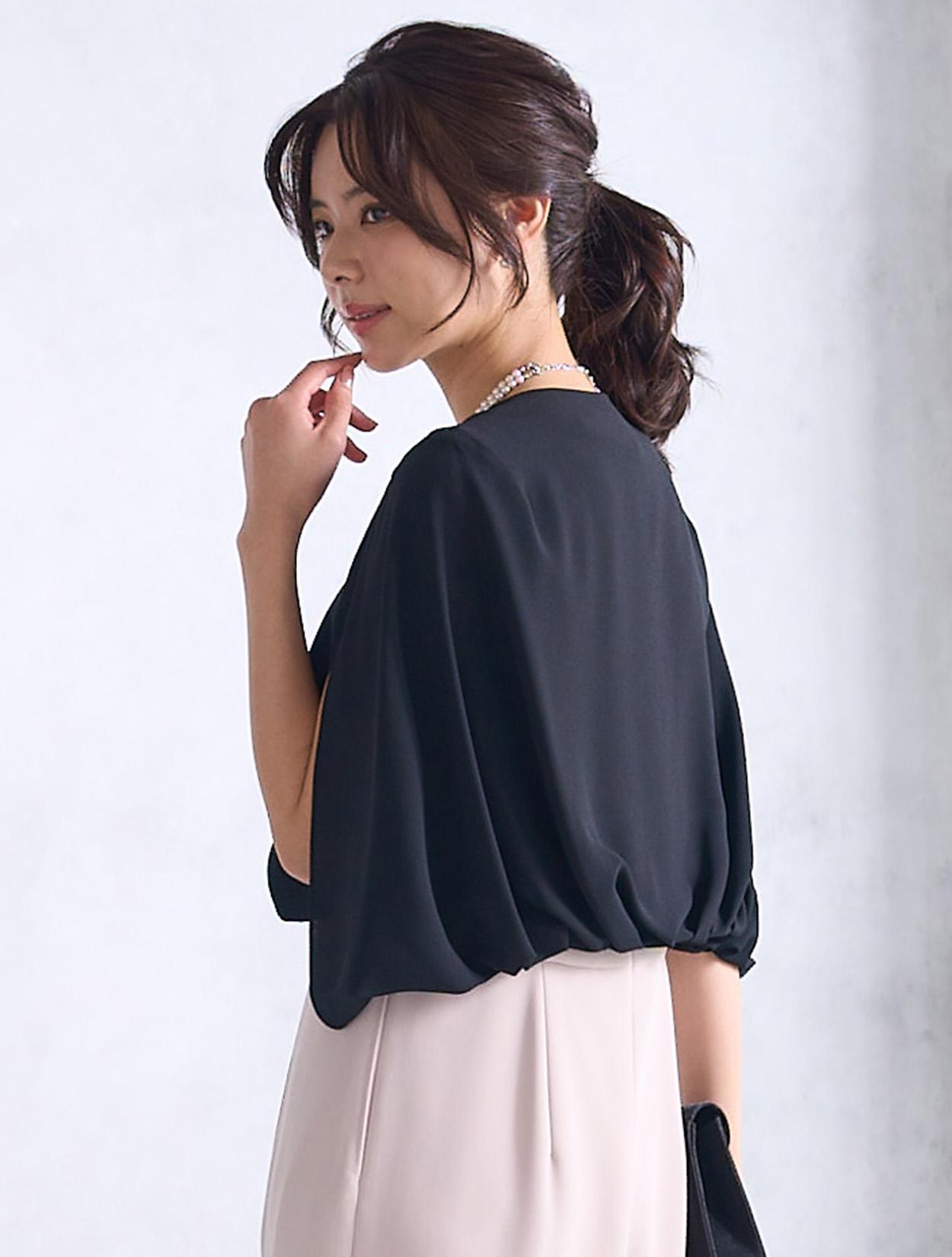 ケープ風のブラックジャケットを合わせたきちんと感のあるコーディネート。トレンドをおさえた30代以降に人気のコーデです。動きやすいので受付をされる方にもおすすめです。