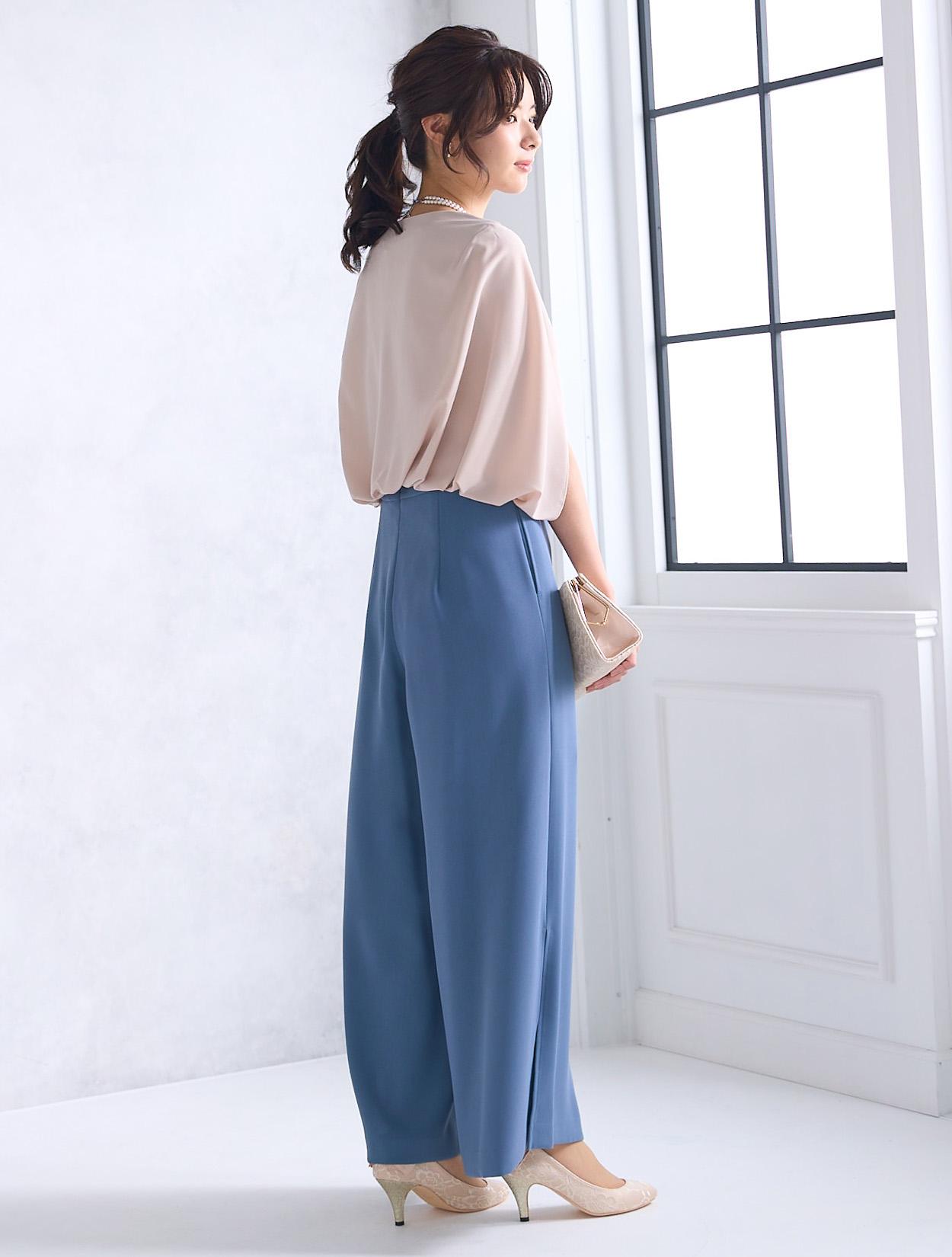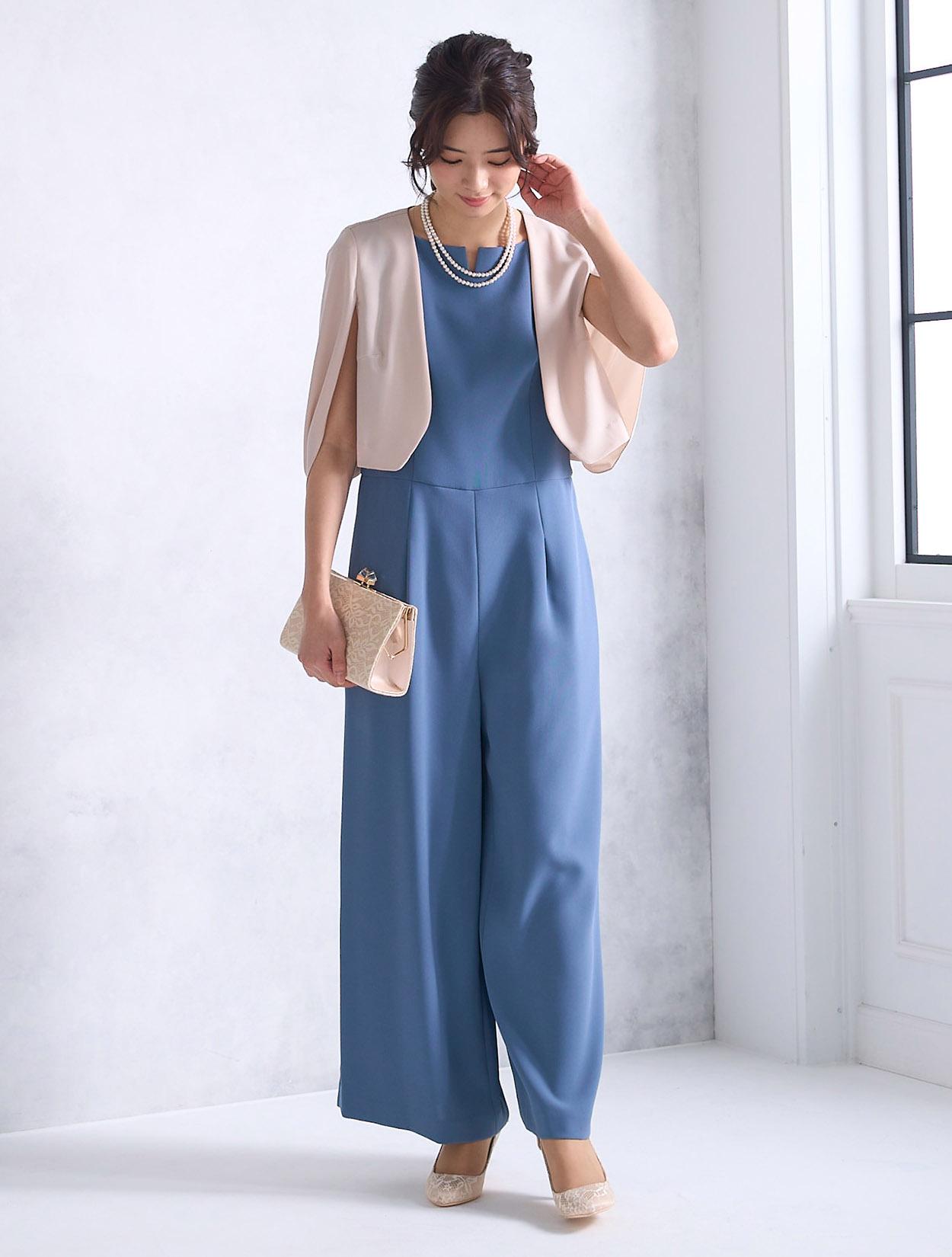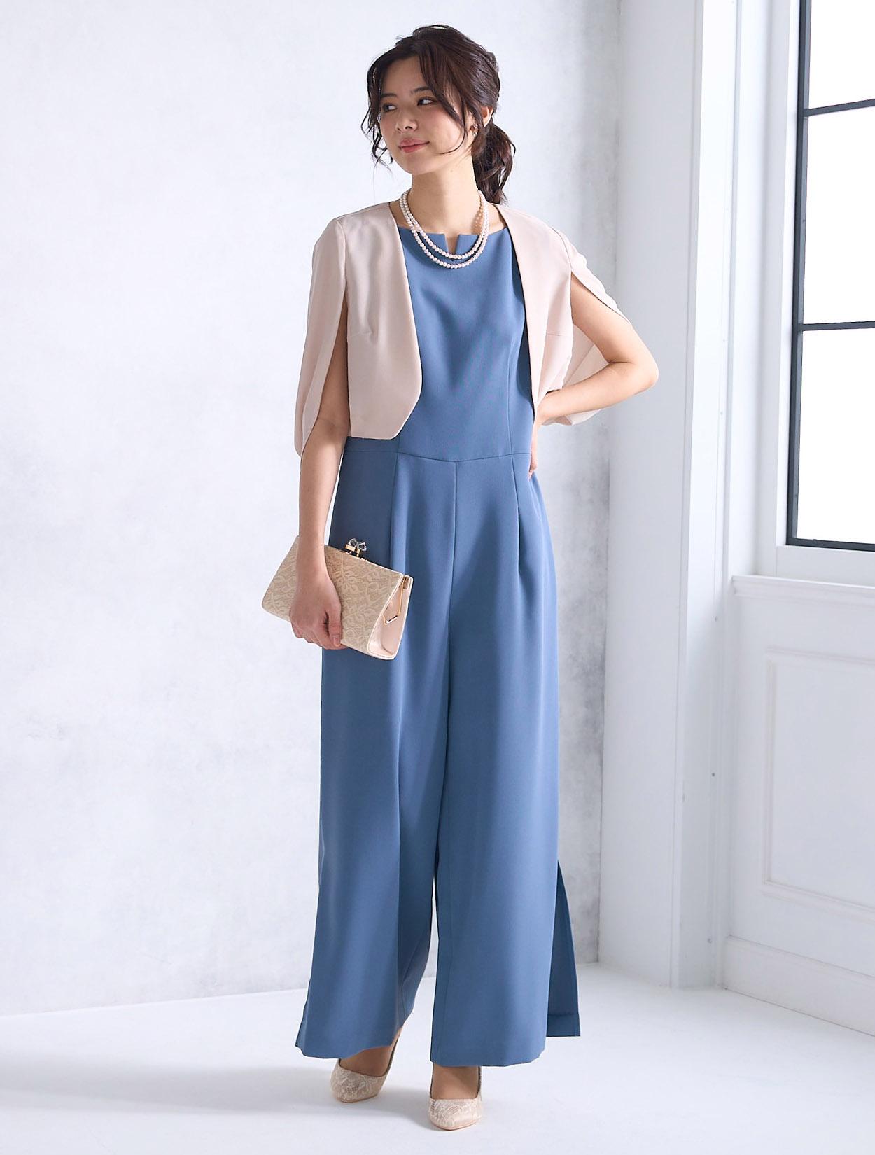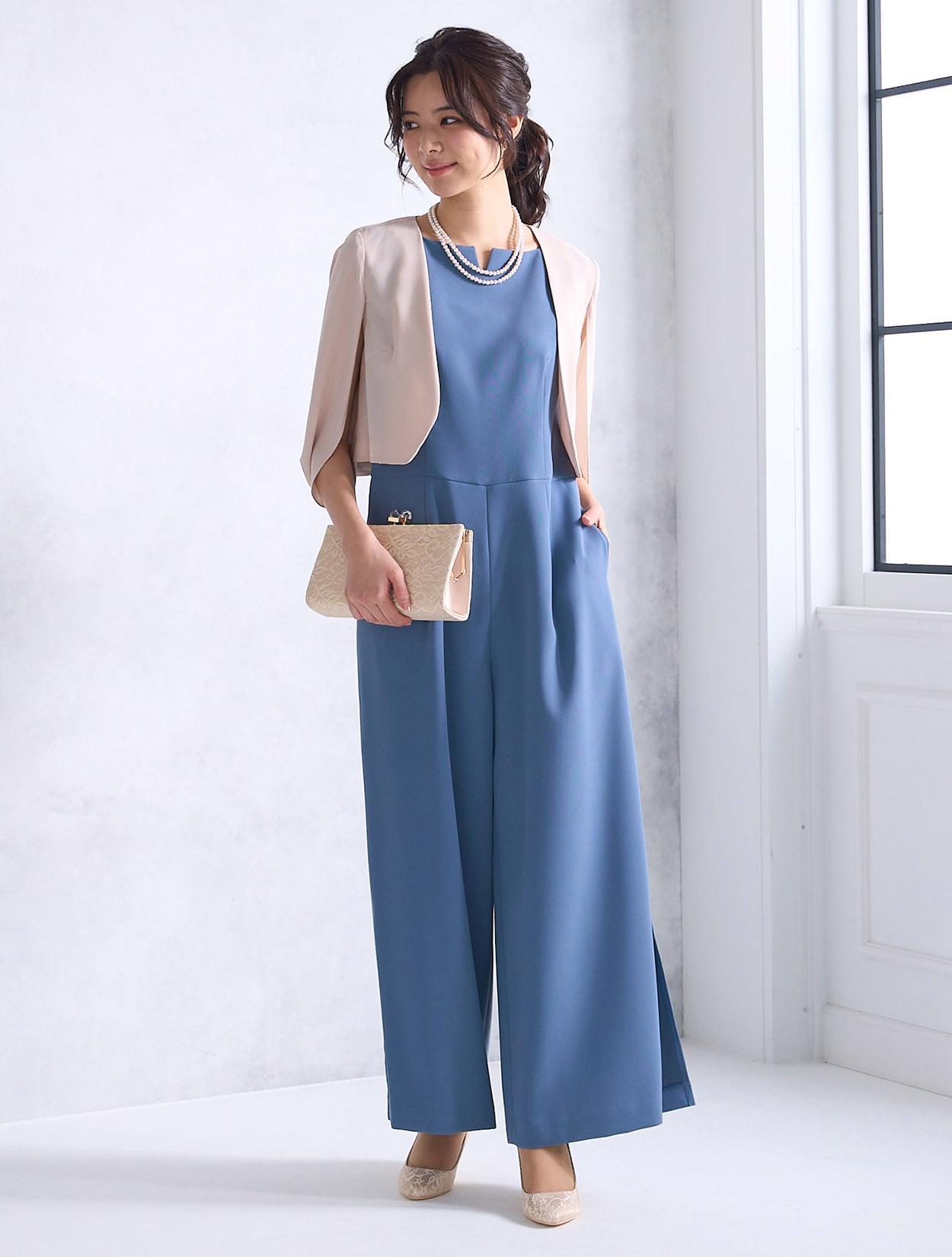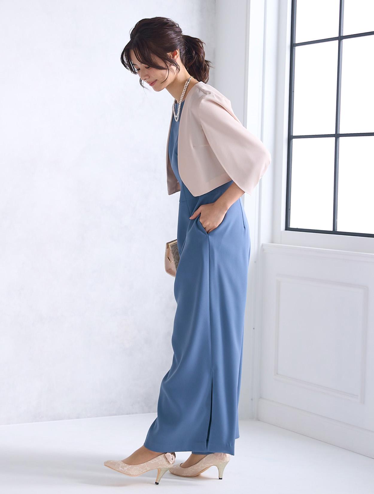 上質なツイル生地を使ったスタイリッシュなパンツドレス。パンツスタイルは最近のトレンドでもあります。パンツ裾にスリットが入っているので、程よく肌見せできる大人ドレスです。ワンドパンツのパンツドレスは、かっこよくも華やかな印象で特に30代に人気です。脚のラインを拾わないのも安心して着られるポイントです。ウエスト周りはストンとしているので楽な着心地ですが、ハイウエストに切り替えがあるので程よくスタイルアップしてくれます。首元はボートネック風のデザインにさりげないカットが入っています。横に広めの襟元は、首が短いのがお悩みの方でもキレイに着られます。