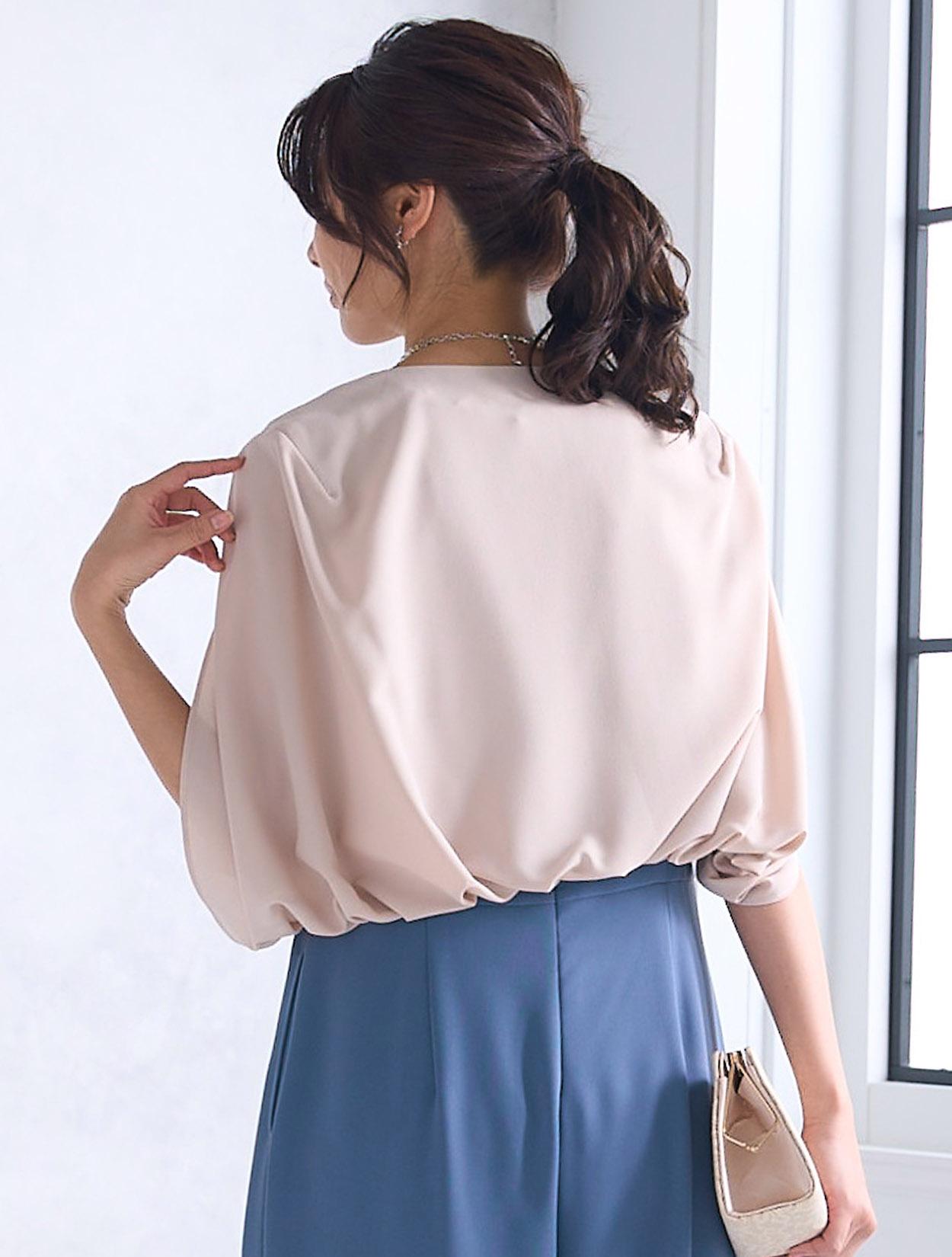 ケープ風のジャケットを合わせたきちんと感のあるコーディネート。ベージュの羽織とバッグで合わせて、パンツドレスでも柔らかい雰囲気に。動きやすいスタイルは受付をされる方にもおすすめです。