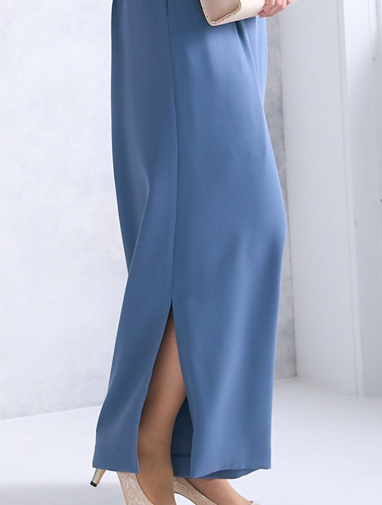若干グレーを混ぜたようなサックスブルーが目を引くドレス。爽やかなブルーと、落ち着きがあるニュアンスカラーのグレーを混ぜることでトレンド感をアップ。上品なブルーなので悪目立ちしないで着られるカラードレスです。