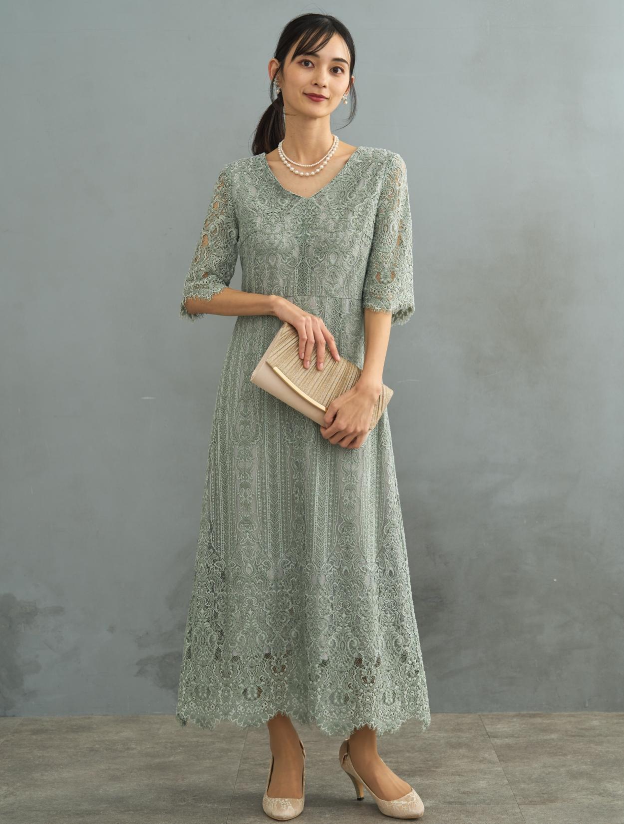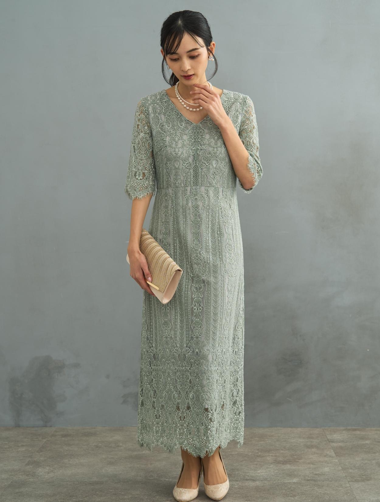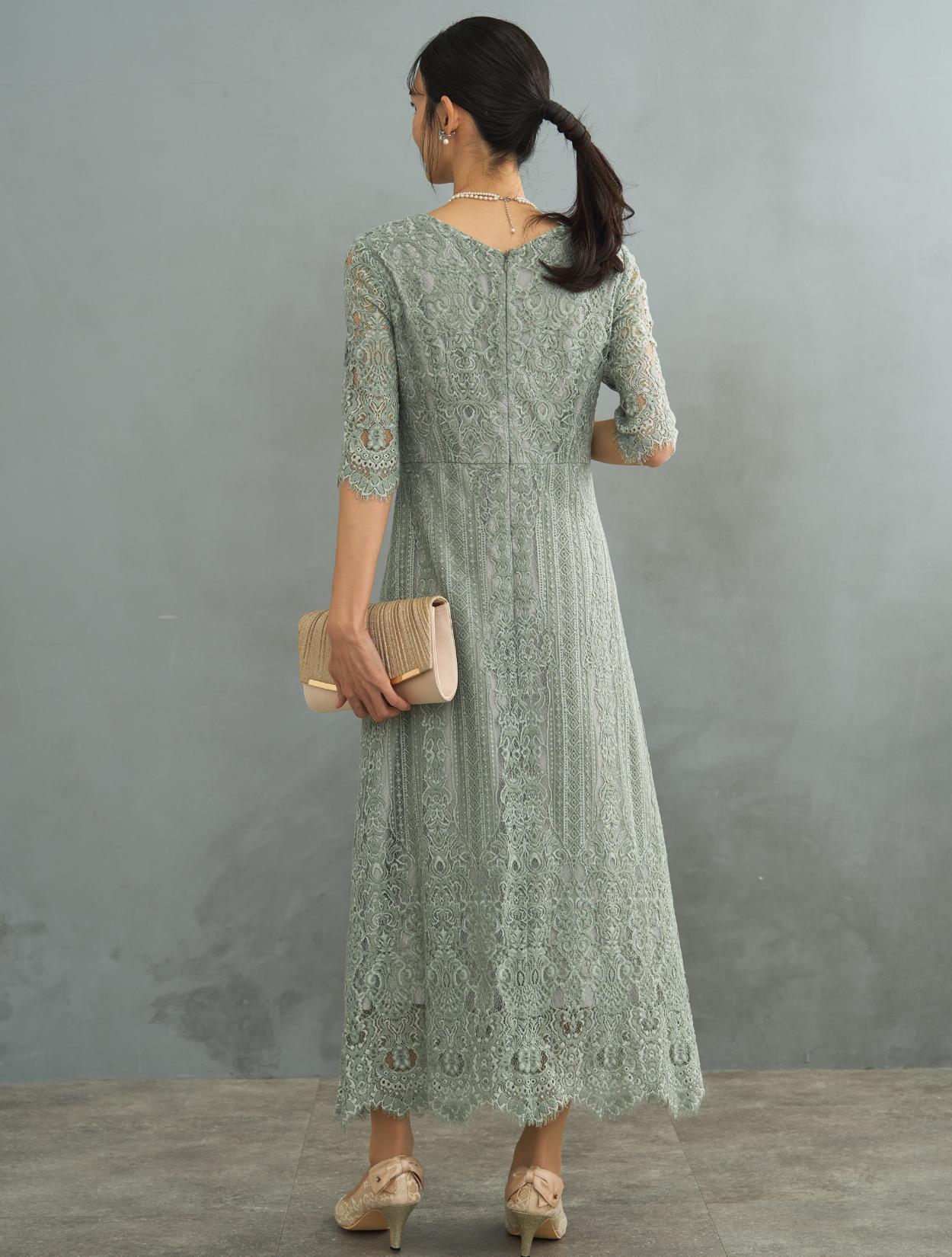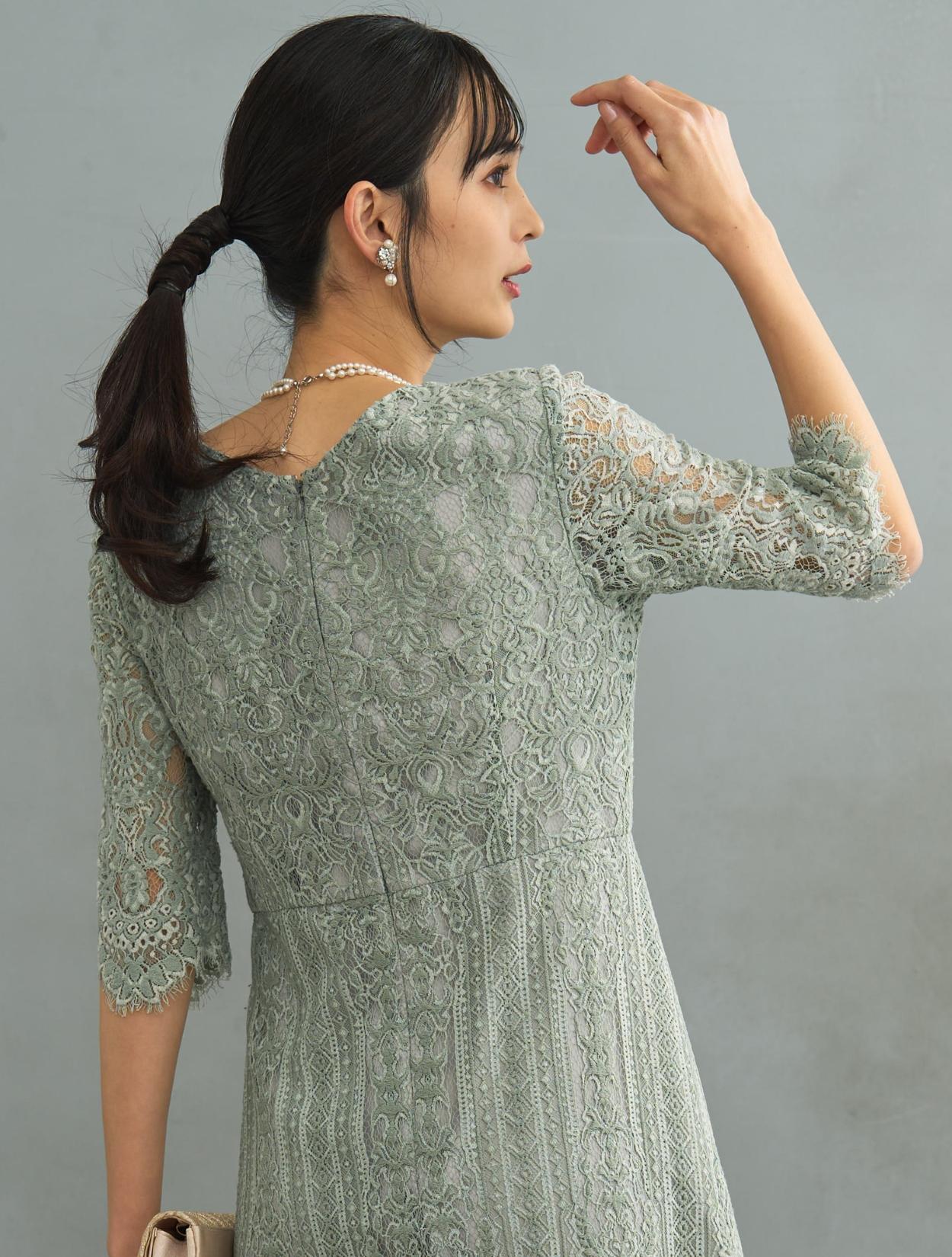 ストライプ調のレースがさりげなく縦のラインを強調してくれるので、スタイルアップ効果のあるドレス。レースは厚みがあって高級感もあります。ドレスでは珍しいVネックのデザインは、首元をさらにスッキリ見せてくれます。首が短いのがお悩みの方や、首元が詰まり過ぎているデザインが苦手な方にもおすすめです。お袖は肘下まで隠れる長めの五分袖。長すぎないのでスッキリ見えますし、手元がもたつかないので立食パーティーなどにも◎。トレンドの袖ありドレスは、結婚式でも羽織なしで一枚で着用可能です。スカートは広がりの少ないIライン。一気に大人っぽい印象で着こなせます。袖の裾やスカートの裾はスカラップレースなので、シンプルなIラインドレスでも華やかに見えるのがポイントです。総レースのデザインですが、透け感や露出は少ない上品なデザインなので大人女子にも人気です。
