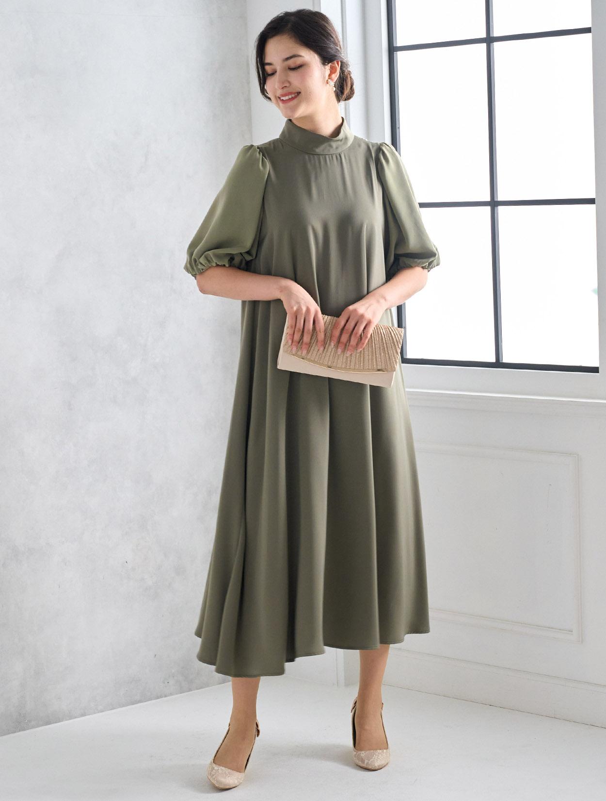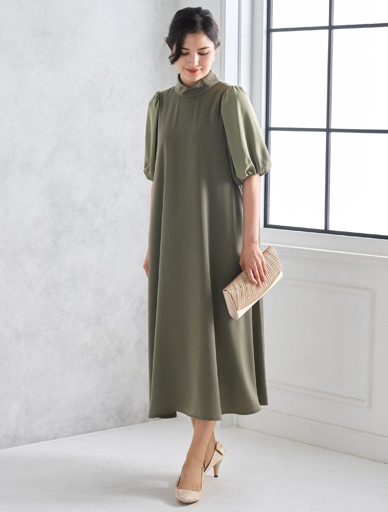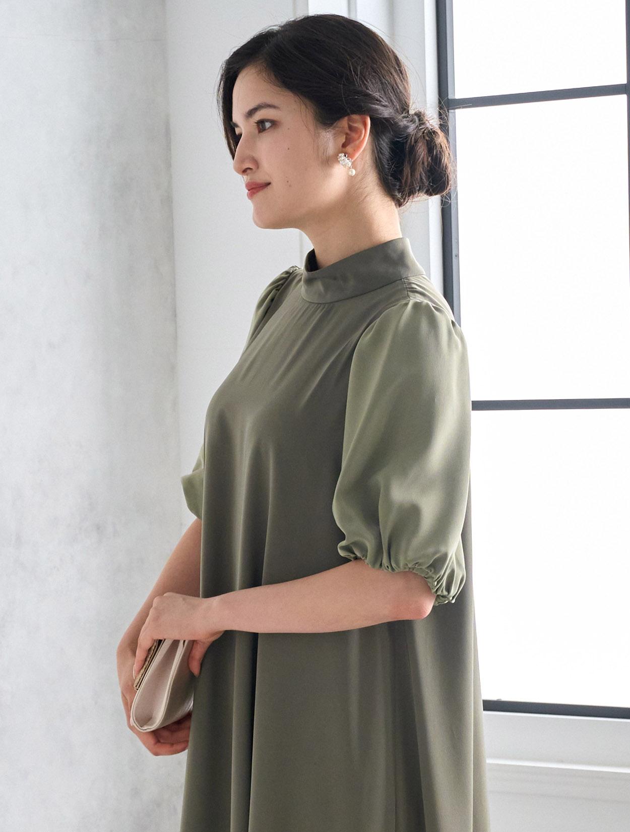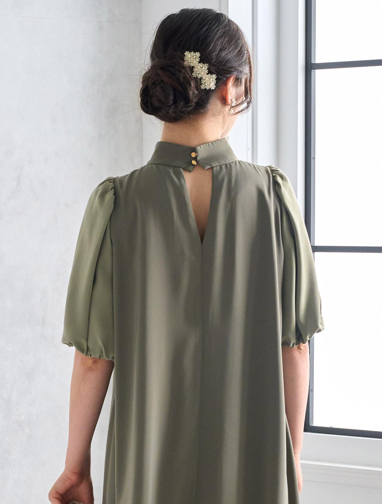 ゆったりとしたこなれ感のあるAラインがおしゃれなデザインのドレス。カラーだけでなくデザインも周りと被りずらい個性的なふんいきがポイント。生地にはかすかに光沢感があるので、動くとさらに立体感が出ます。ふんわりとしたバルーンスリーブは、気になる二の腕をカバーしてくれます。トレンドのスタンドネックの後ろ側には、3つのゴールドのボタンがアクセントに。ボタン下は三角に開いたデザインで、後姿もぬかりありません。たっぷりと生地を使ったドレスで高級感のあるドレスです。被りで着るタイプのドレスなので、背中ファスナーが心配な方でも安心して着用できます。