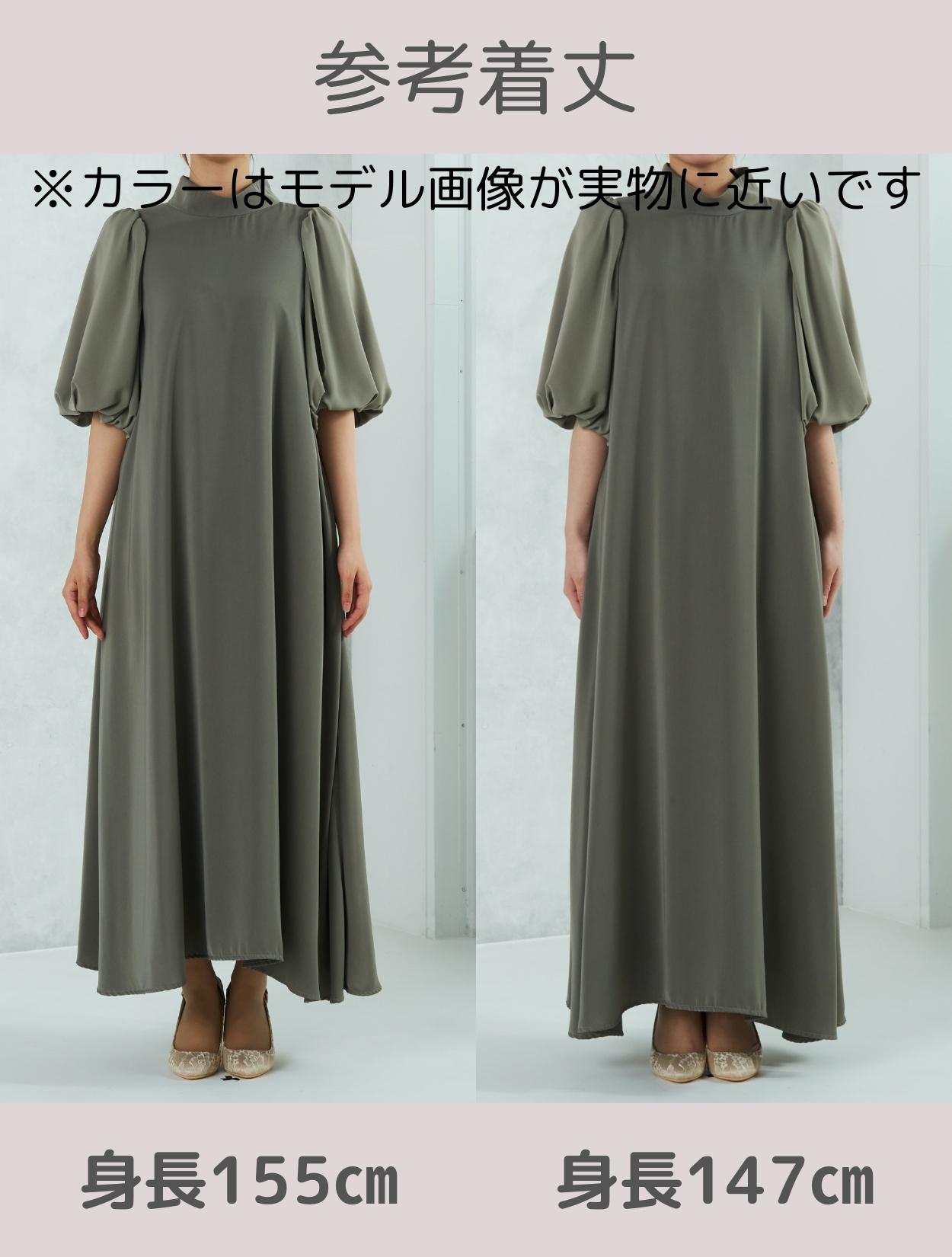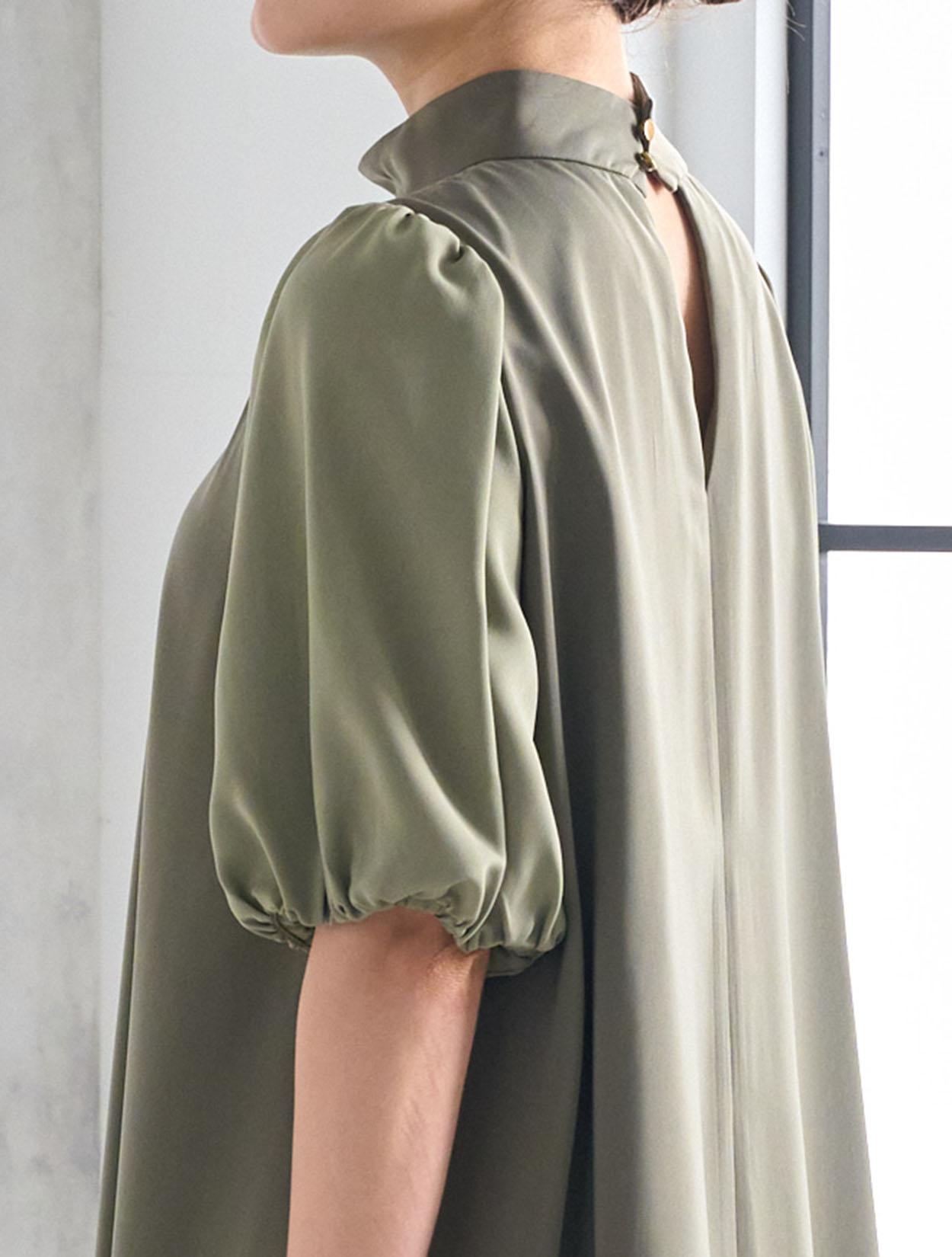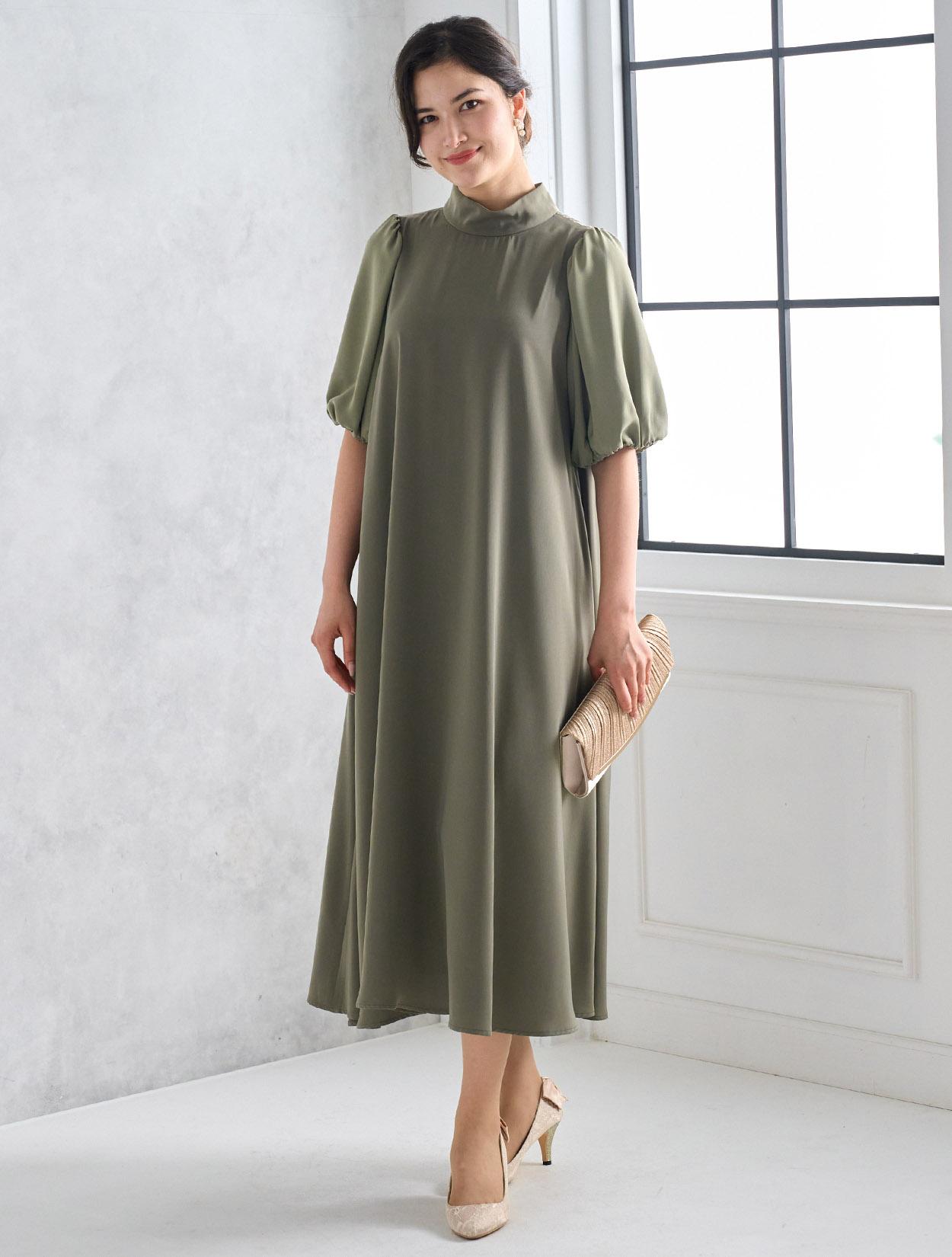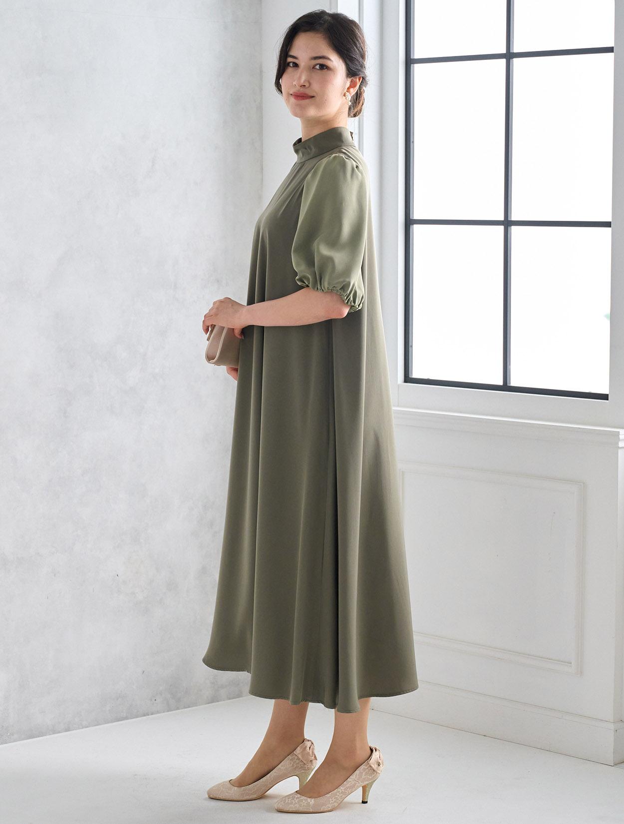 ゆったりとしたこなれ感のあるAラインがおしゃれなデザインのドレス。カラーだけでなくデザインも周りと被りずらい個性的なふんいきがポイント。生地にはかすかに光沢感があるので、動くとさらに立体感が出ます。ふんわりとしたバルーンスリーブは、気になる二の腕をカバーしてくれます。トレンドのスタンドネックの後ろ側には、3つのゴールドのボタンがアクセントに。ボタン下は三角に開いたデザインで、後姿もぬかりありません。たっぷりと生地を使ったドレスで高級感のあるドレスです。被りで着るタイプのドレスなので、背中ファスナーが心配な方でも安心して着用できます。