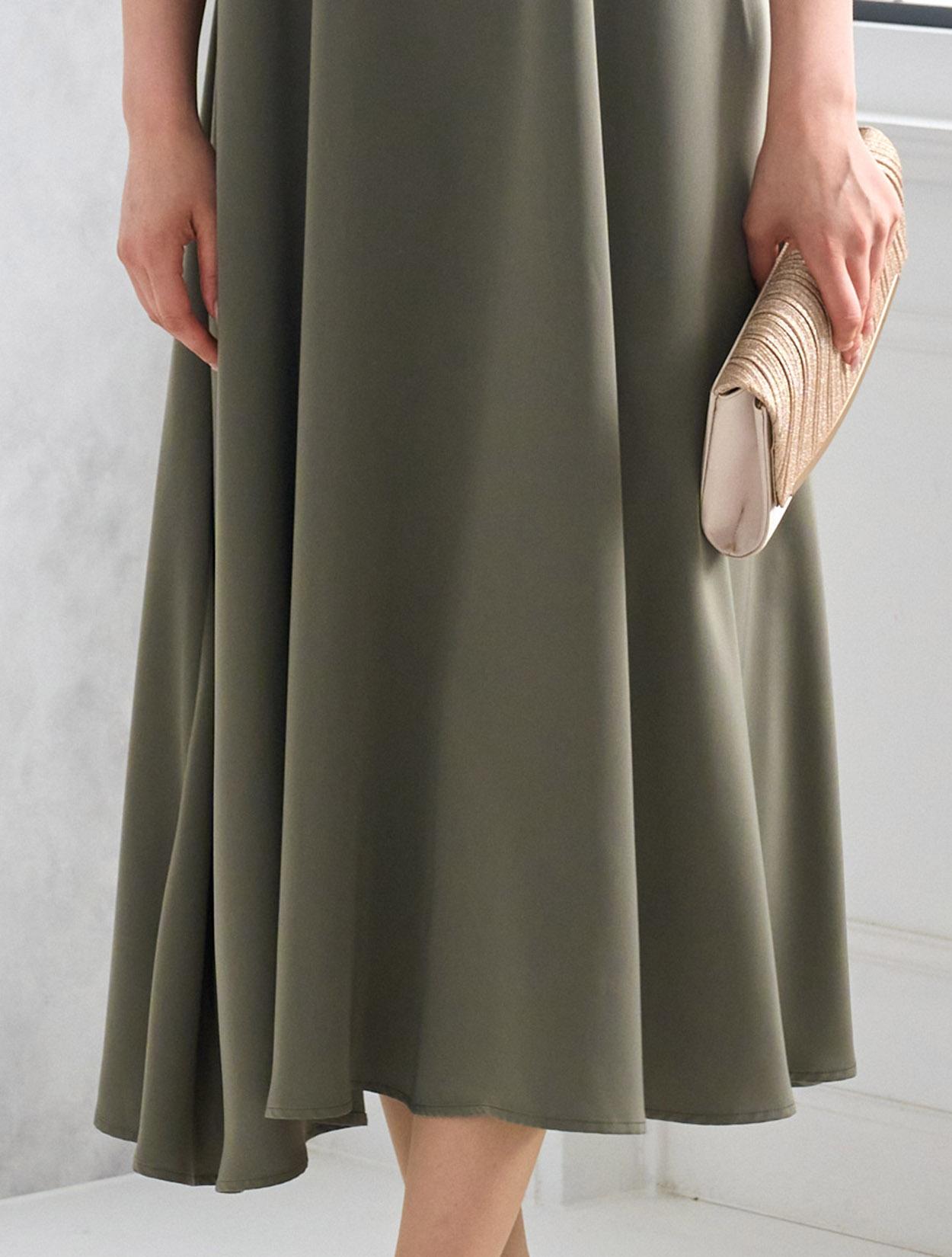 カーキカラーのワンピースドレスは、周りと被りにくいのがポイント。グレーがかったようなニュアンス感のあるカーキは、トレンドらしさもアップ。2種類のカーキの配色は、ドレス全体にメリハリをだしてくれます。
