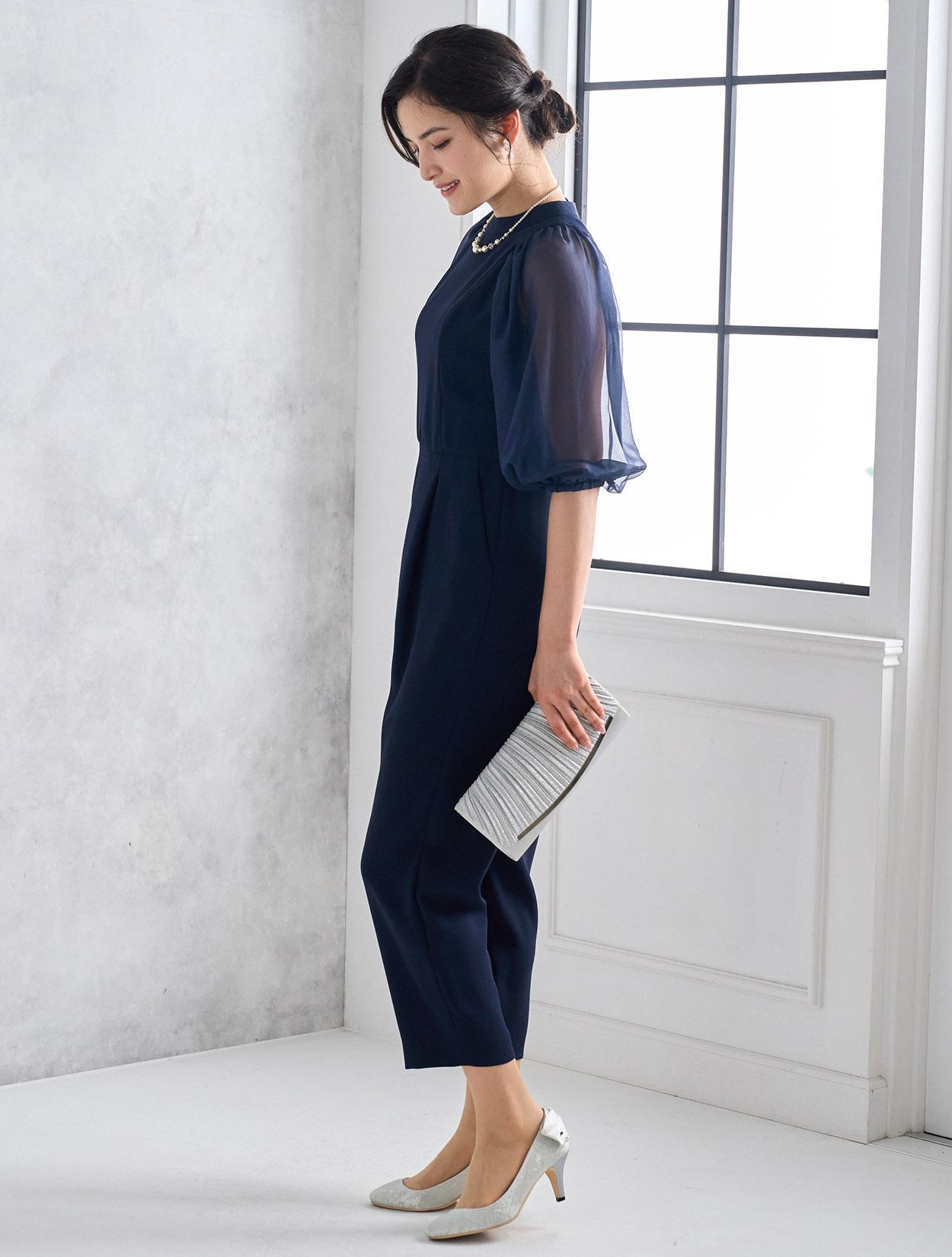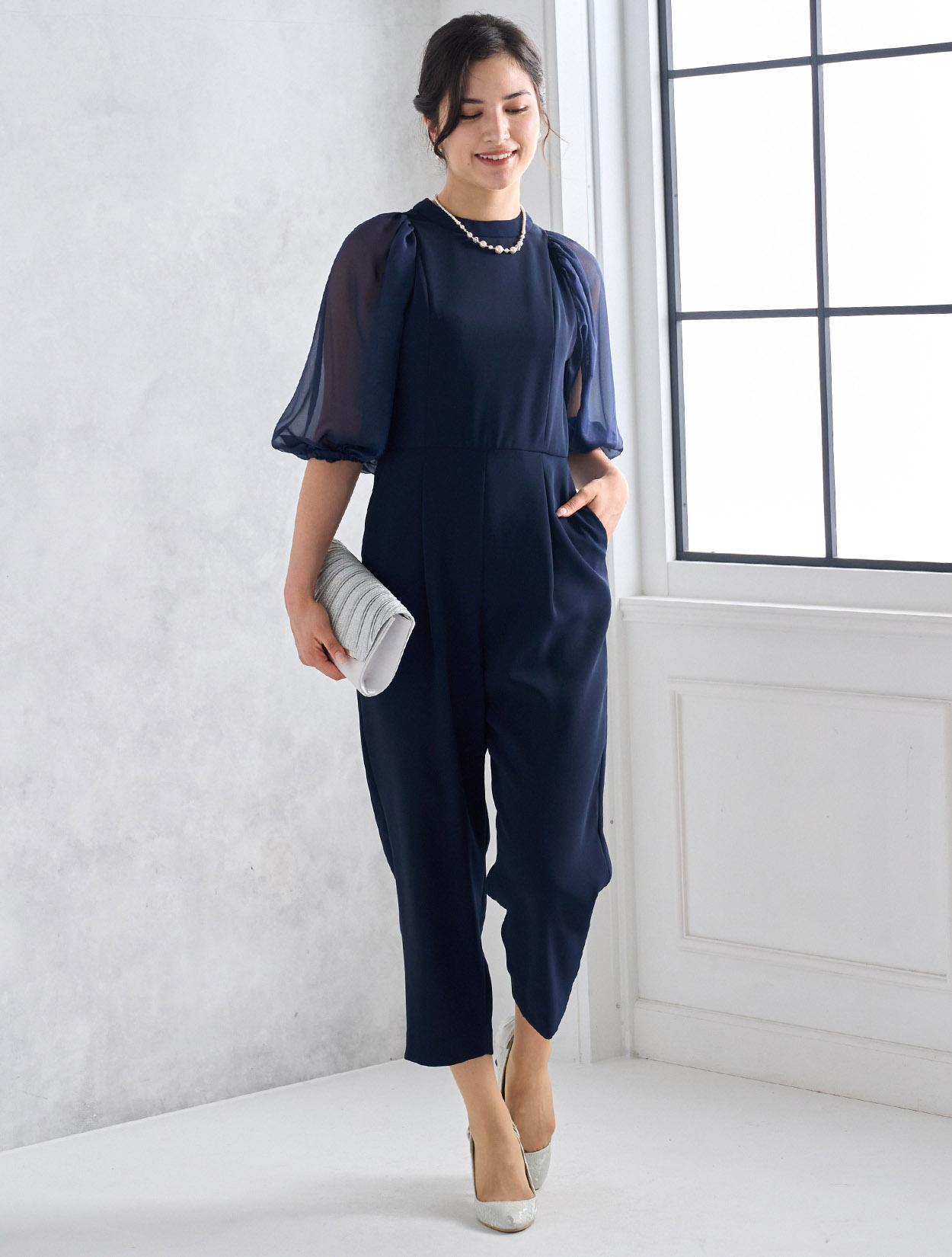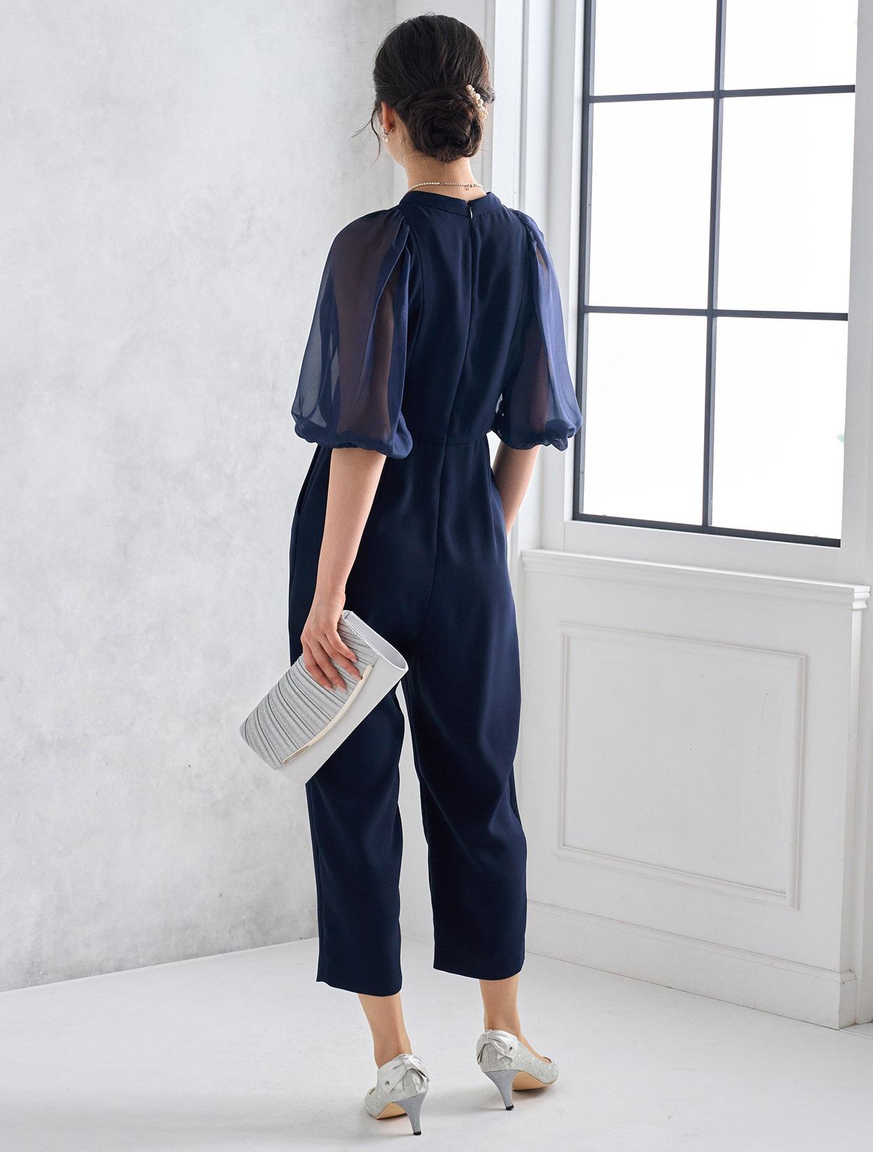 お袖の切り替えが内側にあるセミ・ラグランスリーブのデザインが、特徴的でとてもおしゃれなパンツドレスです。シンプルながらも高級感のある素材で、細部はこだわって作られています。大きくとったオーガンジーのバルーン袖は、シアー感が大人っぽく女性らしい印象をプラス。程よい透け感と詰まった首元は、上品なバランス感を感じます。上半身にはダーツが入っているので、きれいな立体感が出ます。ハイウエストの切り替えは、スタイルアップ効果抜群で脚がすっきり長く見えるのも嬉しいポイント。ウエストからヒップにはタックが入っているので、程よくゆとりがあり着心地も良いです。パンツは細過ぎず太過ぎない、絶妙にナチュラルな大人のライン。長時間着ていても疲れにくいです。