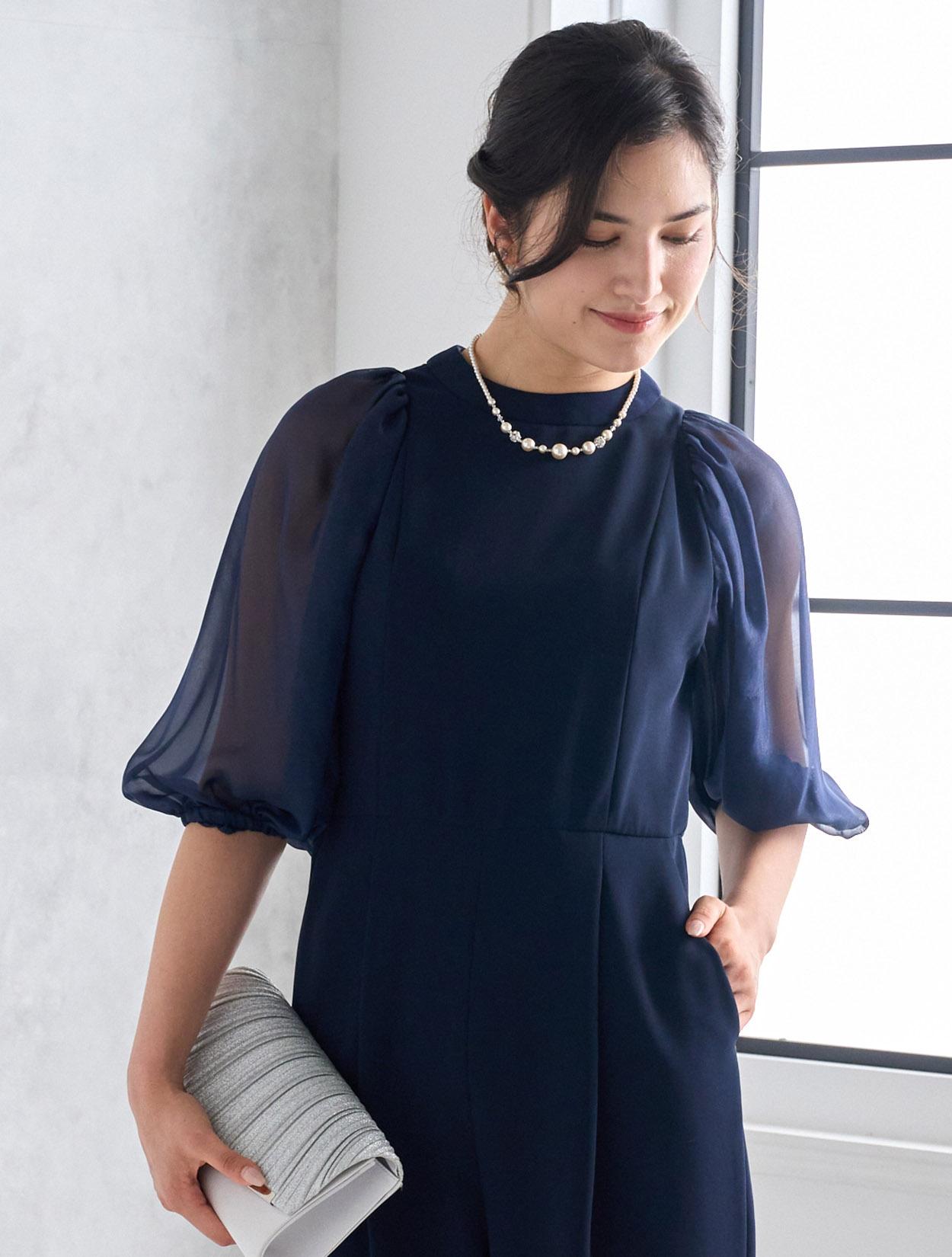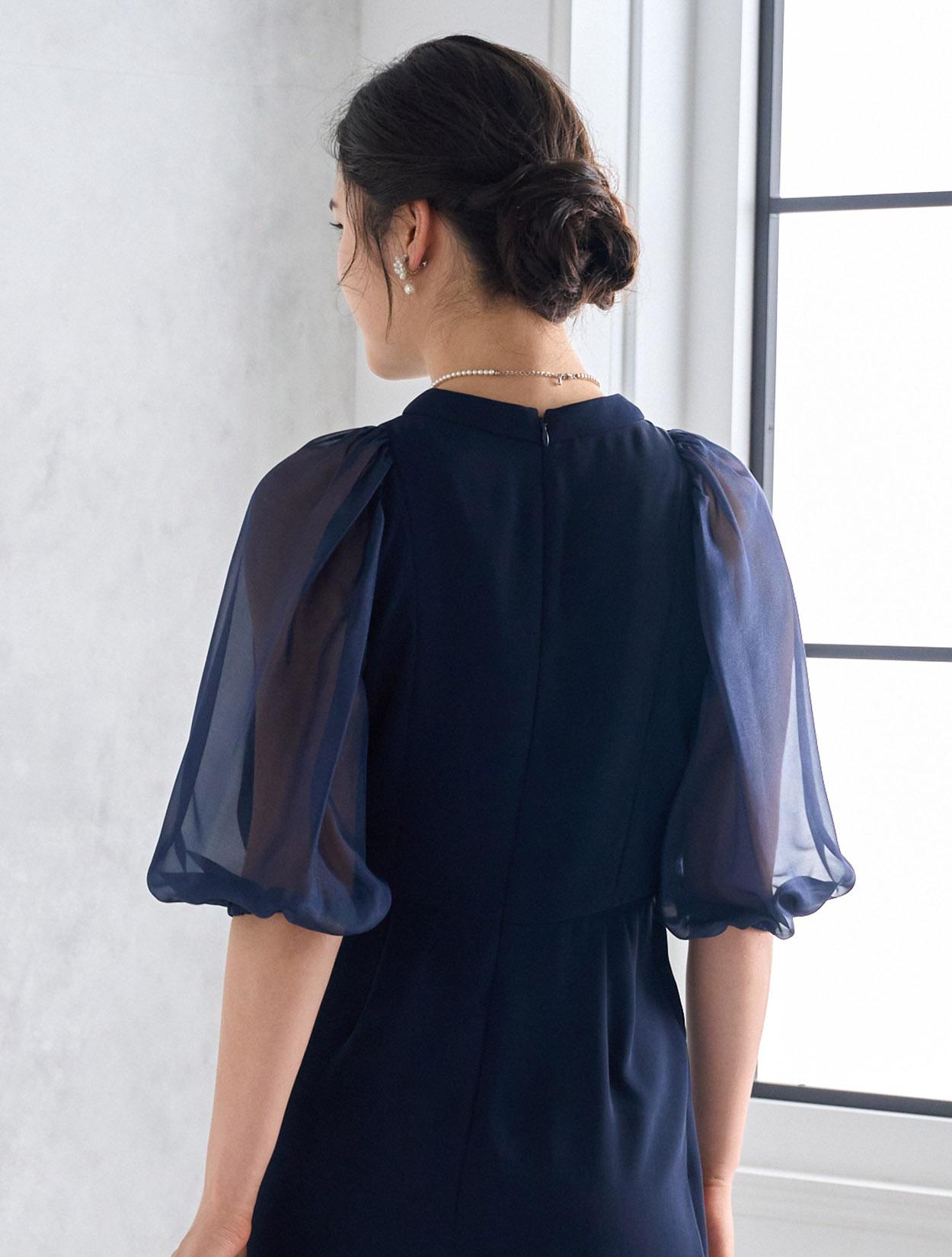 しっかり発色した明るいネイビーカラーです。ダークカラーの中でも、肌とのコントラストがキレイに出るカラーなのでとても華やかに着こなせます。お袖部分のオーガンジーには光沢があり、よりパーティー感がアップします。