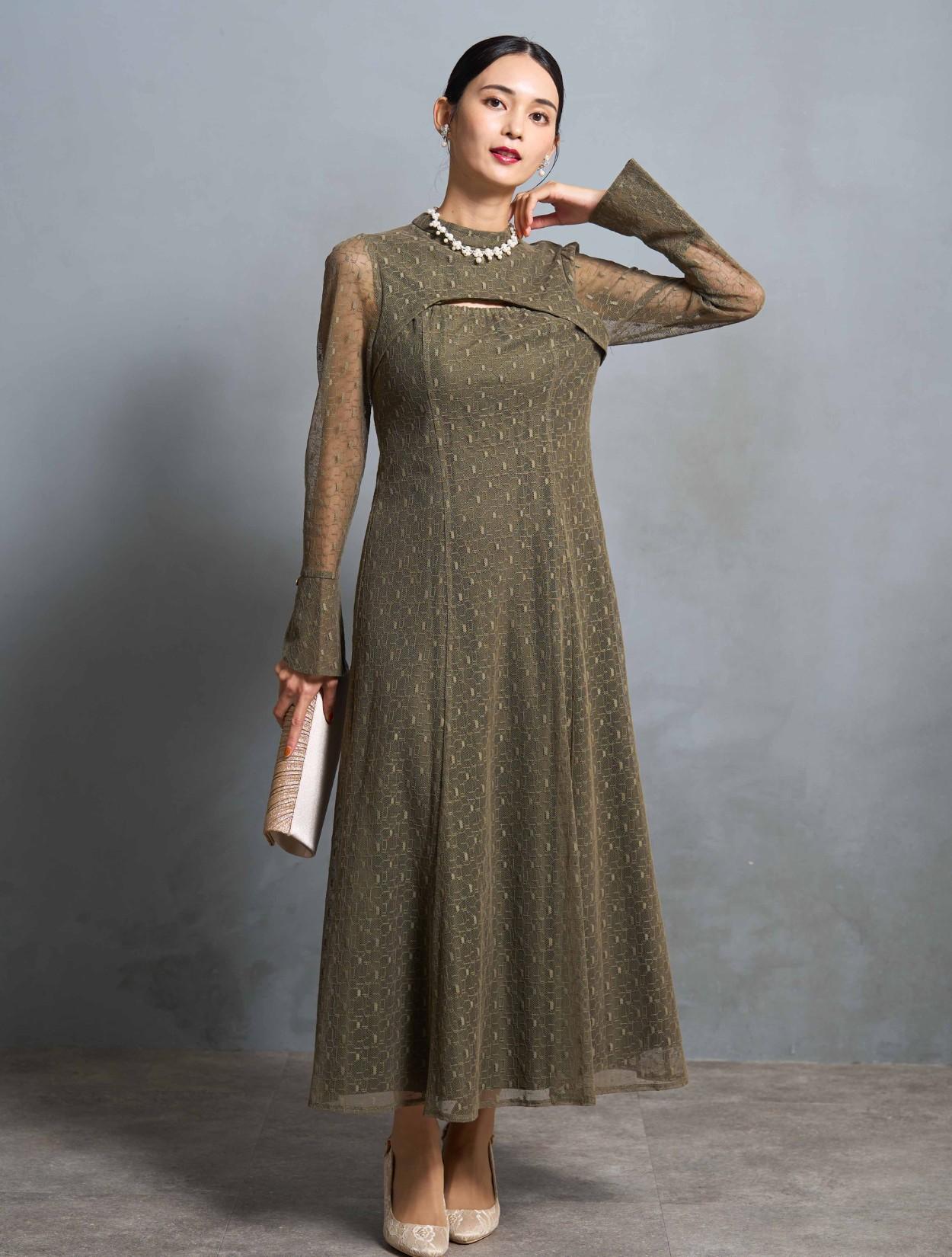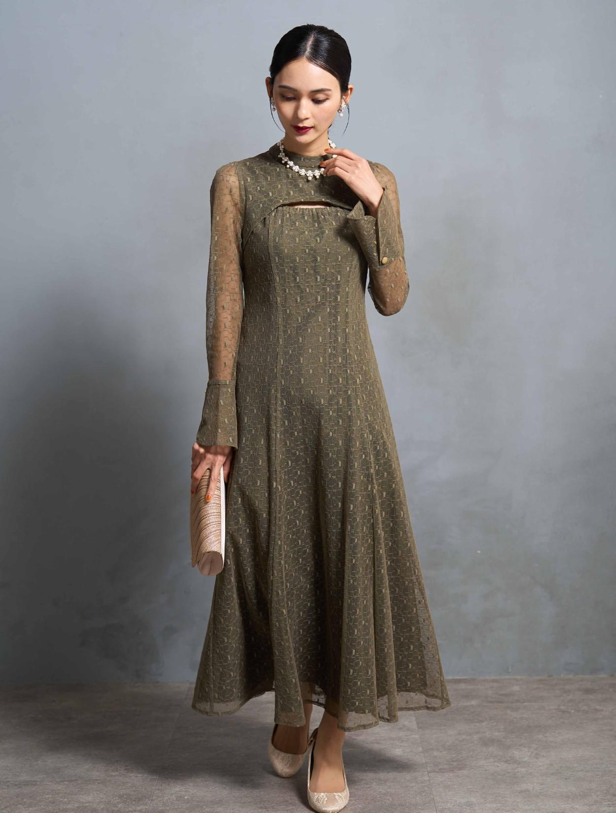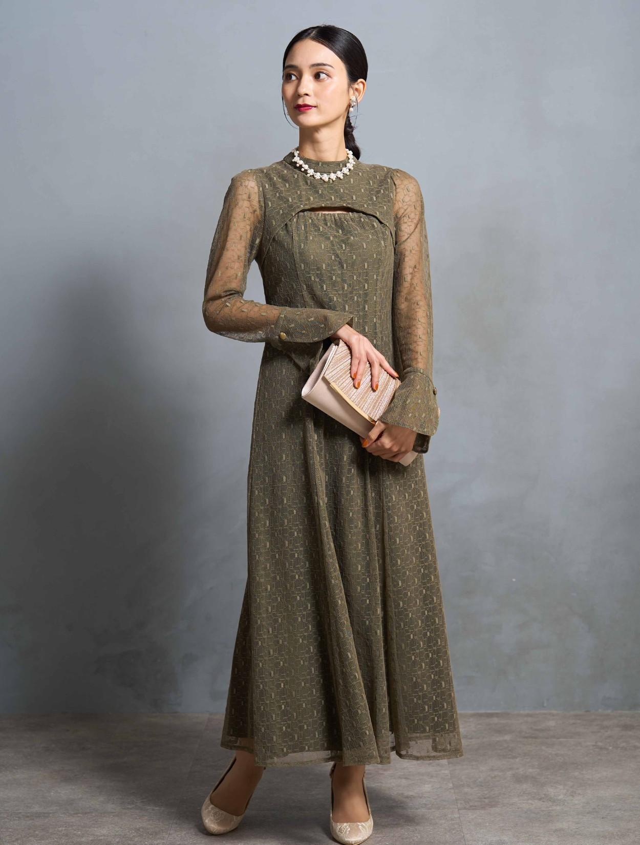 スタンドネックとロングスリーブのデザインは、トレンド感もありながら露出を抑えてクラシカルで上品に着こなせます。特徴的な胸元やバックスタイルのデザインと、ゴールドのボタンが個性を楽しむ20代・30代に人気。トレンドのレースもジオメトリック柄になるだけでグッと大人っぽい印象に。周りと一味違ったお呼ばれドレスやパーティードレスを探している方に特におすすめです。スカートの裏地も長さがしっかりあるので、身長が高い方でも脚が透けにくいデザインのドレスです。