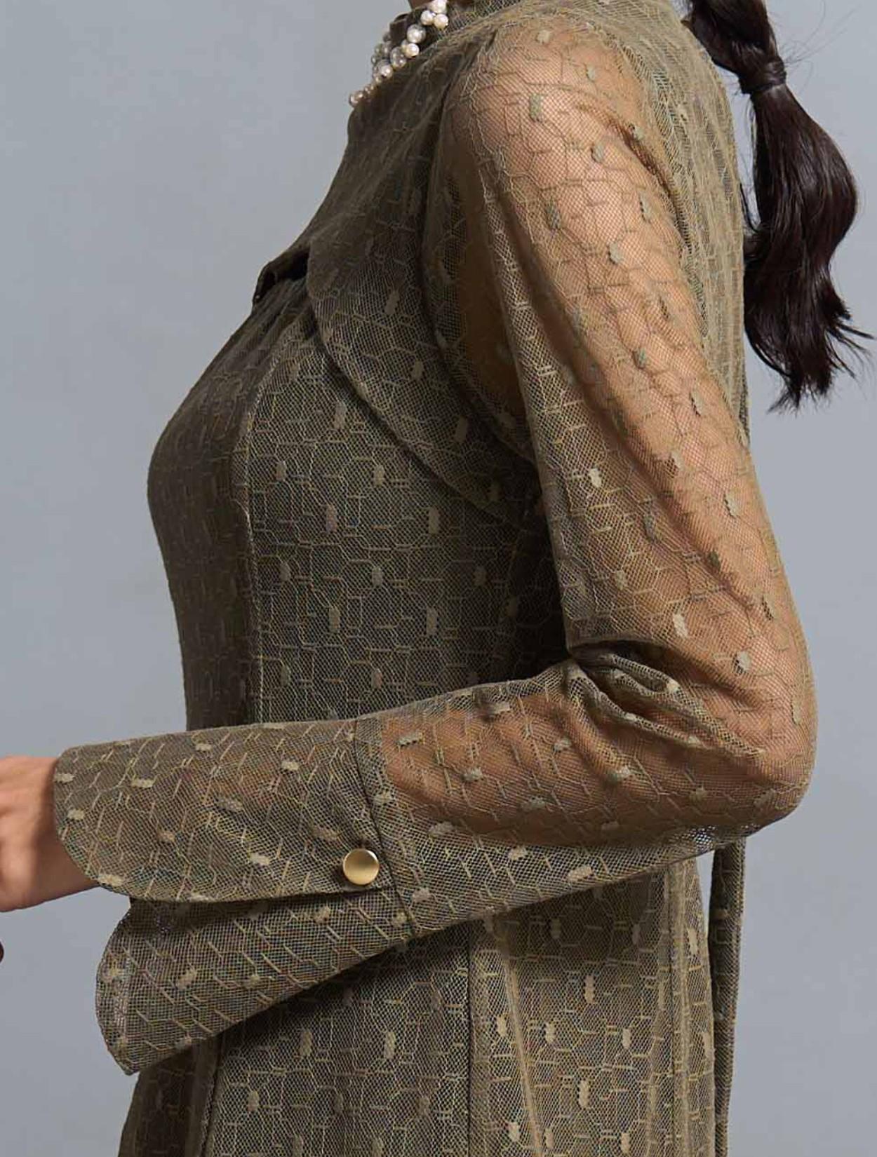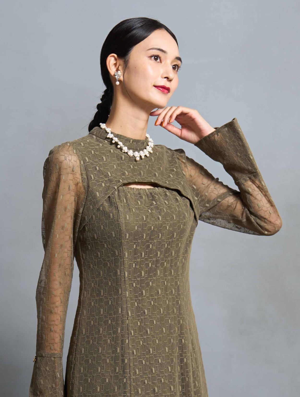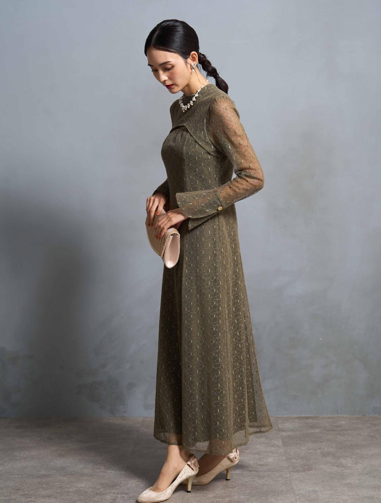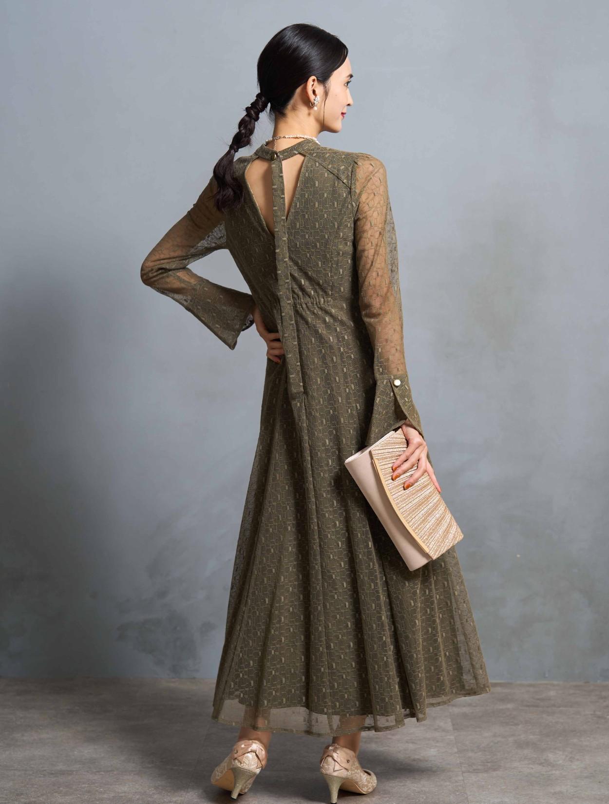 スタンドネックとロングスリーブのデザインは、トレンド感もありながら露出を抑えてクラシカルで上品に着こなせます。特徴的な胸元やバックスタイルのデザインと、ゴールドのボタンが個性を楽しむ20代・30代に人気。トレンドのレースもジオメトリック柄になるだけでグッと大人っぽい印象に。周りと一味違ったお呼ばれドレスやパーティードレスを探している方に特におすすめです。スカートの裏地も長さがしっかりあるので、身長が高い方でも脚が透けにくいデザインのドレスです。