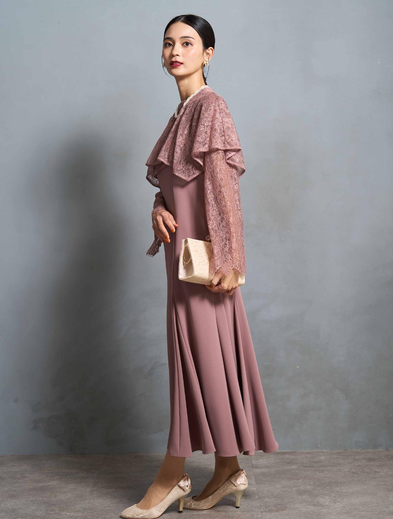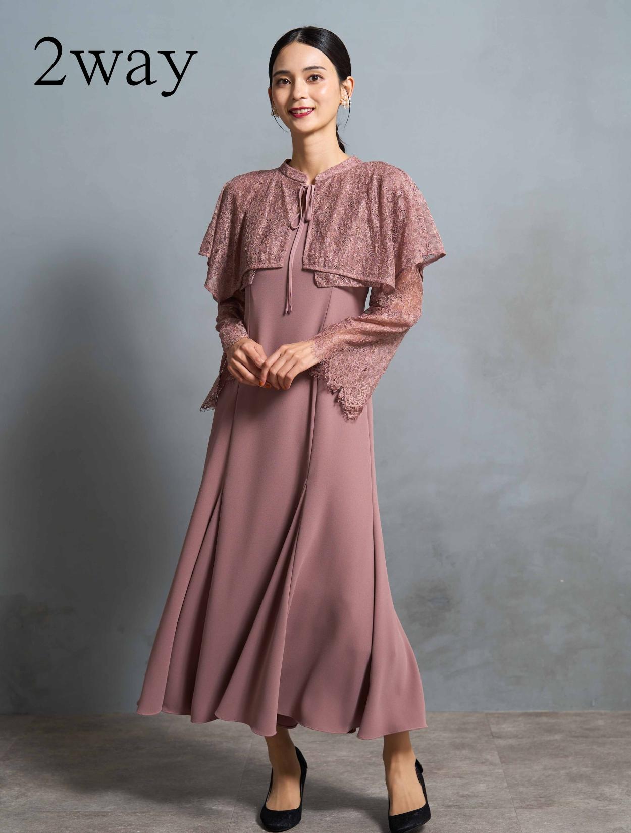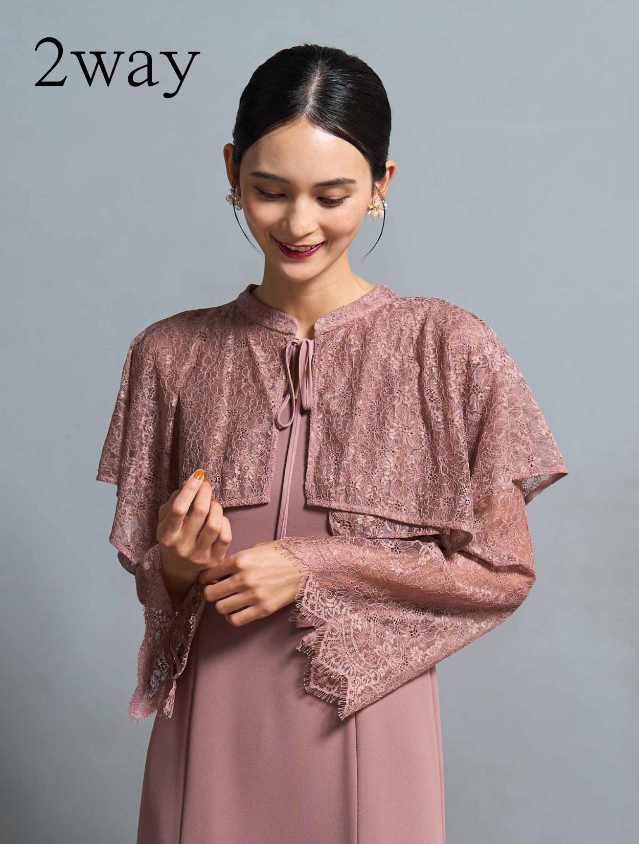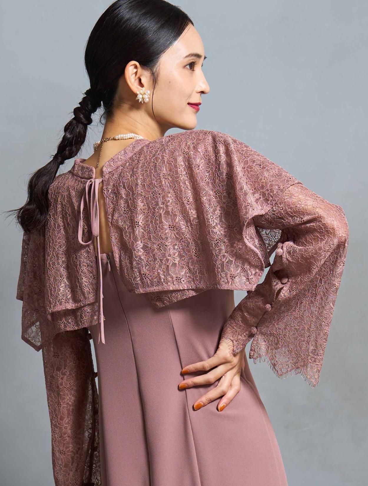 前後どちらを前にしても着られる2way仕様のケープ風レースボレロがポイントのドレス。リボンを後ろで結べば、露出を抑えたクラシカルで上品な着こなしに、リボンを前で結べば華やかでフェミニンな着こなしが楽しめます。結婚式の披露宴と二次会で雰囲気を変えて着られるのも2wayの良いところ。着丈の短いボレロは、脚長効果もあり後ろから見てもぬかりなくスタイル良く見えます。トレンドのマーメイドラインのスカートは足元を華やかに演出してくれるのも嬉しいポイント。肩紐で長さの調節が可能です。レースのお袖には肘までボタンが付いていて、ボタンを開けて着ると手首が見えて程よく抜け感も出せます。