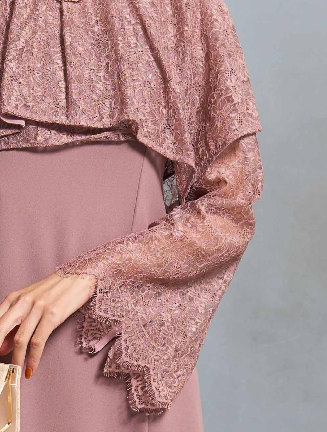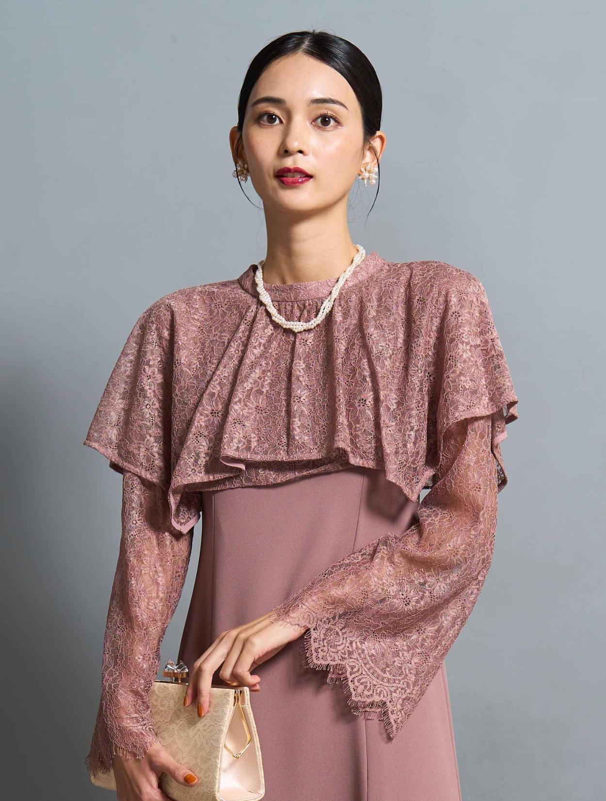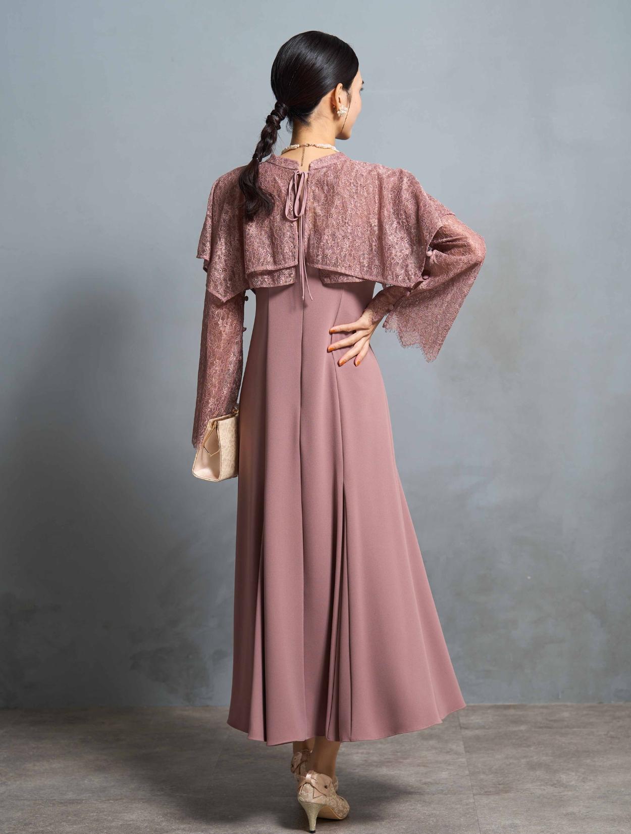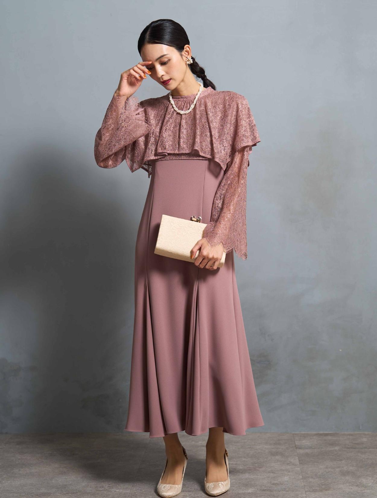 前後どちらを前にしても着られる2way仕様のケープ風レースボレロがポイントのドレス。リボンを後ろで結べば、露出を抑えたクラシカルで上品な着こなしに、リボンを前で結べば華やかでフェミニンな着こなしが楽しめます。結婚式の披露宴と二次会で雰囲気を変えて着られるのも2wayの良いところ。着丈の短いボレロは、脚長効果もあり後ろから見てもぬかりなくスタイル良く見えます。トレンドのマーメイドラインのスカートは足元を華やかに演出してくれるのも嬉しいポイント。肩紐で長さの調節が可能です。レースのお袖には肘までボタンが付いていて、ボタンを開けて着ると手首が見えて程よく抜け感も出せます。