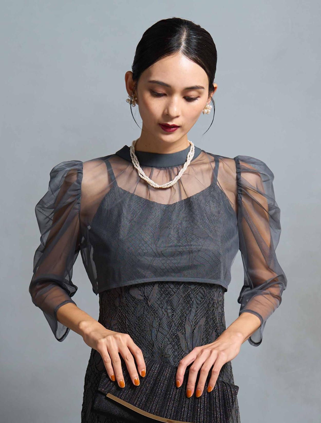 繊細なシアー感のあるボレロがおしゃれなトレンドドレス。人気のパワーショルダーのデザインは、柔らかい透け感でフェミニンな雰囲気が楽しめます。前後どちらを前にしても着られる2way仕様のボレロは、リボンを後ろで結べばスッキリした大人っぽい印象で着こなせて、リボンを前で結べば可愛らしい印象に。結婚式と二次会で雰囲気を変えて着てみるのもおすすめです。大ぶりな柄のコードレースのワンピーススカートは、どこかモード感がありクラシカルなボレロとのバランスは絶妙です。トレンドのマーメードラインのスカートは、女性らしいラインで足元を華やかに演出してくれます。肩紐で長さの調節が可能です。