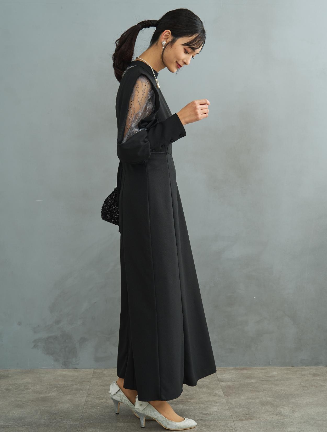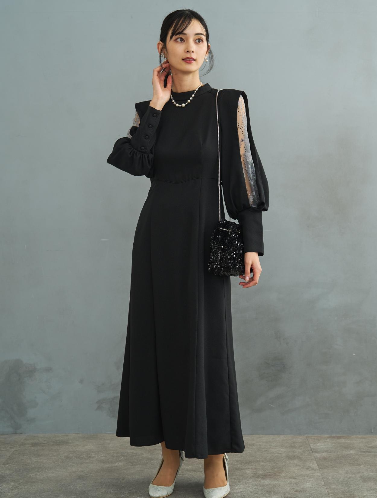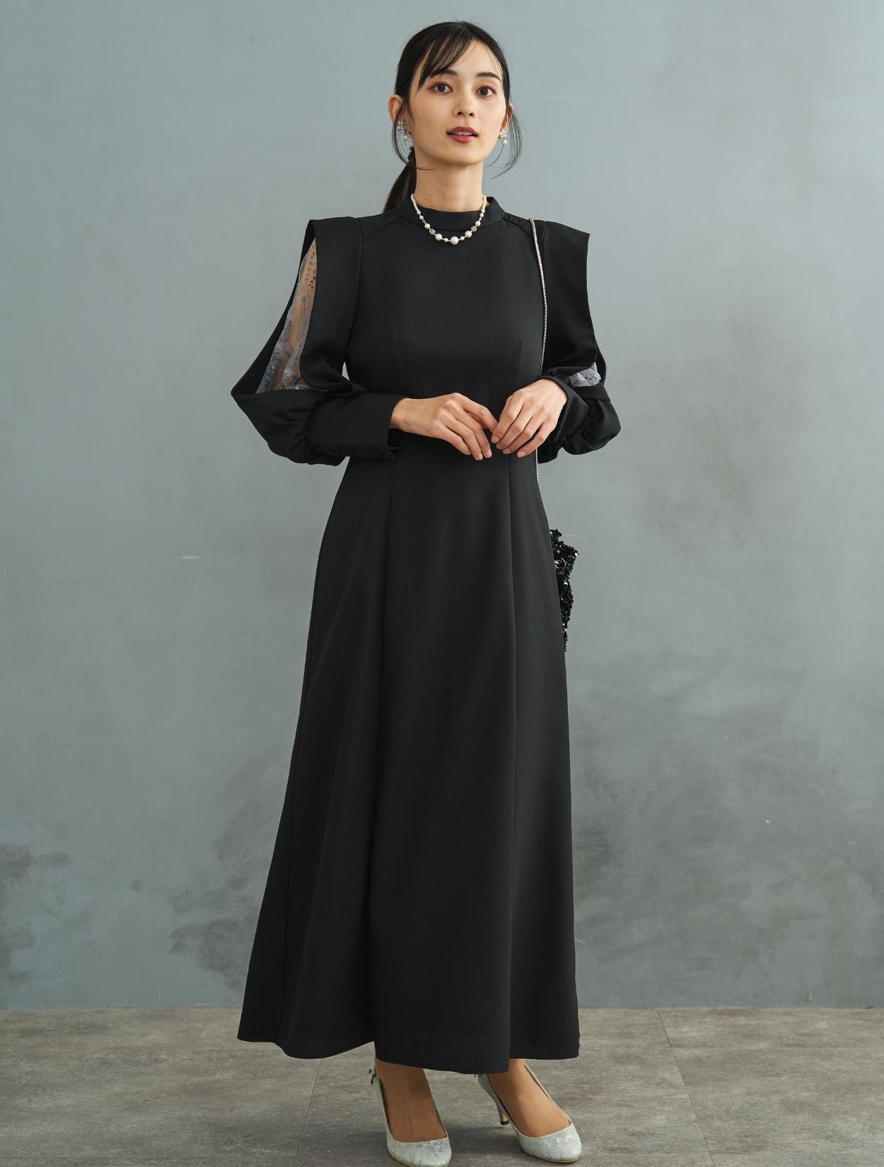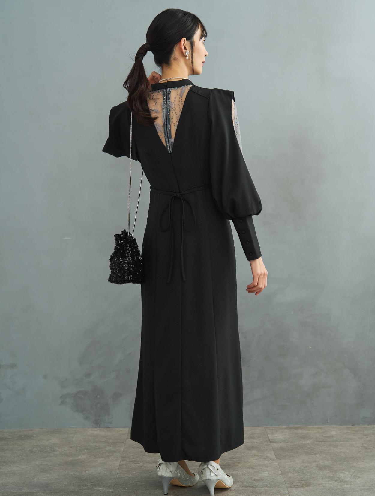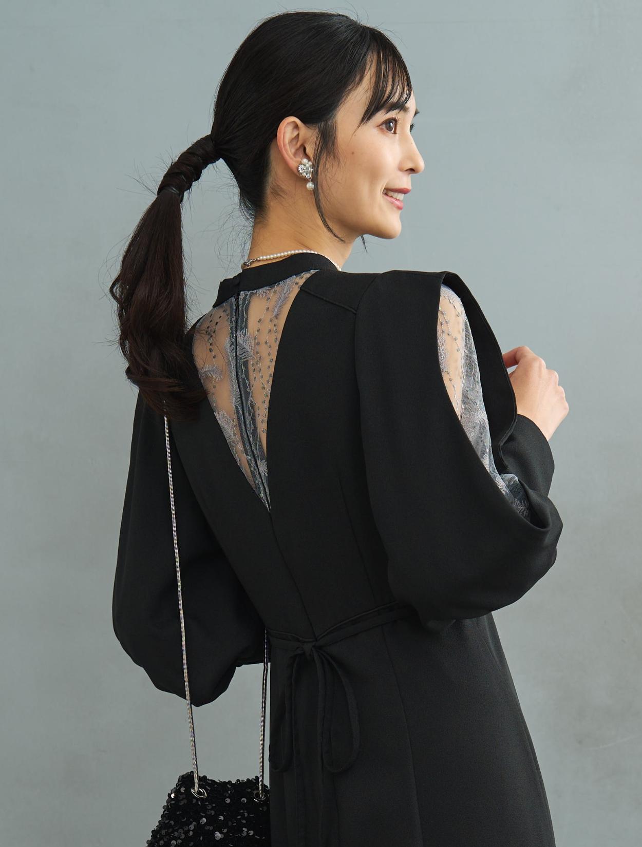 デザイン性がありトレンド感のあるワンピースドレス。しっかりしたジョーゼット生地は露出が少なく上品に着こなせるので特に30代に人気です。肩からお袖にかけてポイントのあるドレスで、スリットが入ったお袖から覗く刺繍のレースがポイント。ラメドットにリーフ柄の刺繍レースは、フラワーレースより大人っぽくおしゃれに着こなせます。同じレースが背中にも使われています。バックスタイルも抜かりなく、露出が少ないデザインに女性らしい抜け感を演出してくれます。ウエストには共布の紐がついていて、背中でしばれますのでお好きなウエストラインに絞って着ることができます。