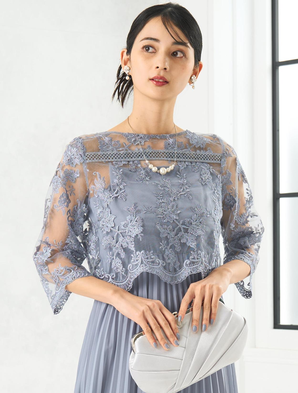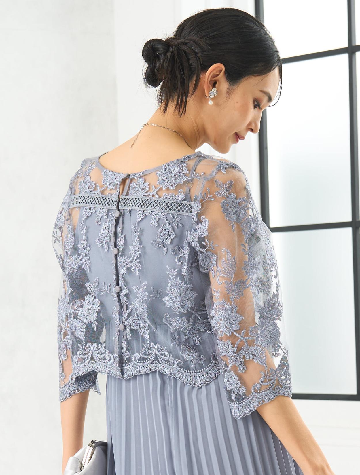 たっぷり生地を使ったプリーツスカートが高級感のあるドレス。動くたびに優雅に揺れるスカートは、それだけで華やかな雰囲気を演出してくれます。また、プリーツの縦のラインは、全体をスッキリ見せてスタイルアップ効果も◎。ハリのあるオーガンジーレースのブラウスは、立体感がありプリーツスカートとの相性も抜群。華やかなレースの柄はお顔周りを明るく見せてくれます。ブラウスは、前後どちらを前にしても着られる2wayタイプです。ボタンダウンのデザインはカジュアルに見える場合もあるので、フォーマルな場面ではボタンは後ろに持ってくるのがおすすめです。程よく開いたネックラインは、デコルテをキレイに見せてくれます。