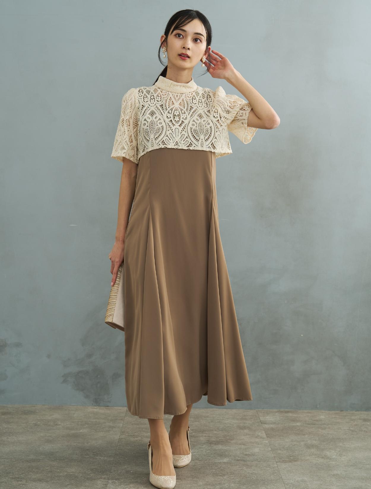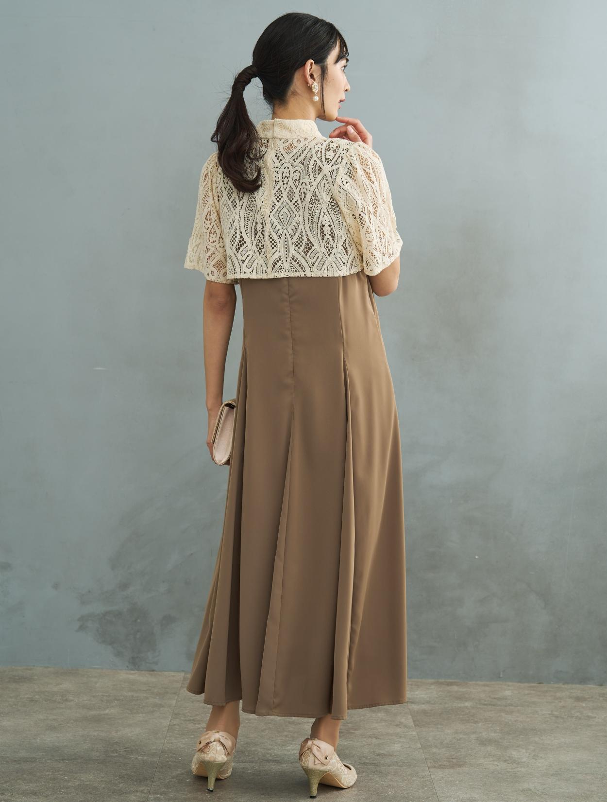 ショート丈のオーバーブラウスがセットになった、トレンド感のあるデザインのドレス。ロング丈ドレスでも、全体のポイントを上に持ってきているので、足長効果やスタイルアップ効果も抜群です。人気のマーメイドスカートのインナーワンピースには、微光沢があるのでお呼ばれにもぴったりなきちんと感もあります。ウエストからヒップにかけての、女性らしいキレイなラインも嬉しいポイント。オーバーブラウスのレースには程よい厚みがあり、透け感も気にならず上品に着こなせます。ハイネック風の首元ですが、ゆとりがあり締め付けは気になりずらいデザインです。デコルテ部分の露出は抑えて、ハーフスリーブからは肘下を大胆に出すバランスが◎。着崩れしないドレスなので、受付や代表スピーチなどを任されている方にもおすすめ。