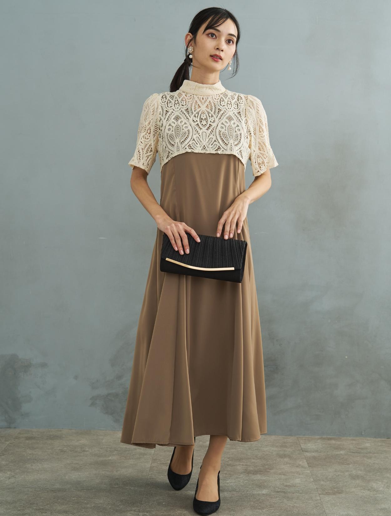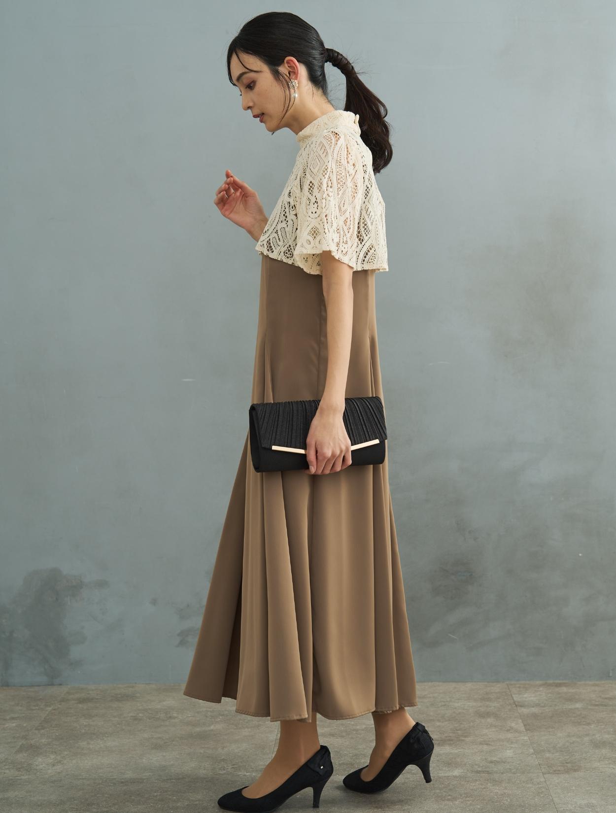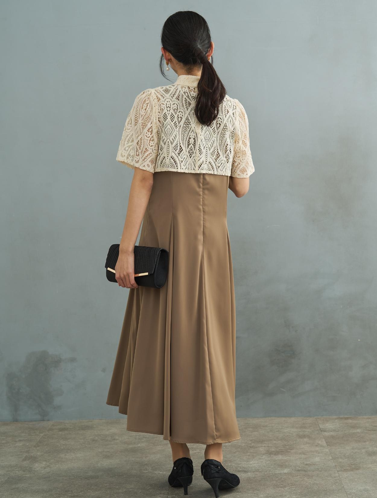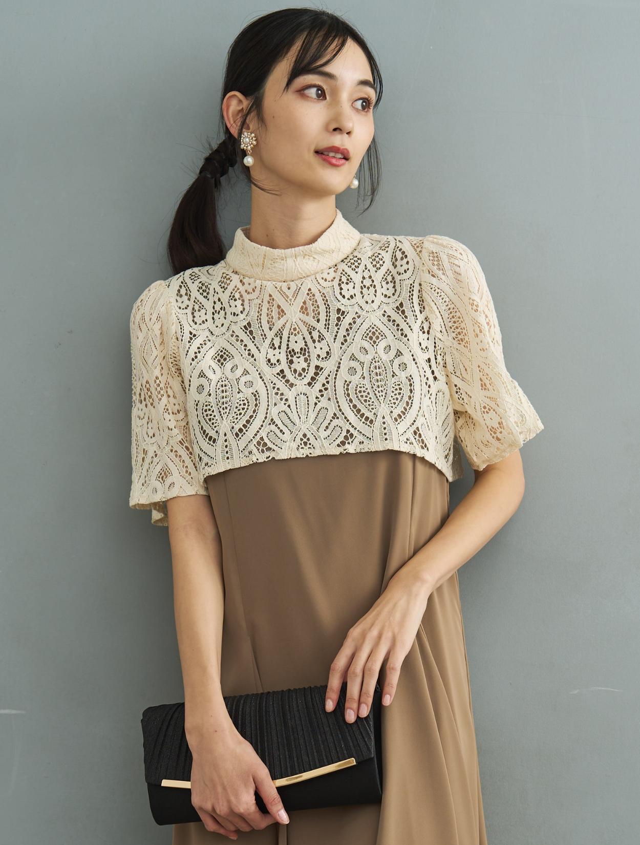 ショート丈のオーバーブラウスがセットになった、トレンド感のあるデザインのドレス。ロング丈ドレスでも、全体のポイントを上に持ってきているので、足長効果やスタイルアップ効果も抜群です。人気のマーメイドスカートのインナーワンピースには、微光沢があるのでお呼ばれにもぴったりなきちんと感もあります。ウエストからヒップにかけての、女性らしいキレイなラインも嬉しいポイント。オーバーブラウスのレースには程よい厚みがあり、透け感も気にならず上品に着こなせます。ハイネック風の首元ですが、ゆとりがあり締め付けは気になりずらいデザインです。デコルテ部分の露出は抑えて、ハーフスリーブからは肘下を大胆に出すバランスが◎。着崩れしないドレスなので、受付や代表スピーチなどを任されている方にもおすすめ。