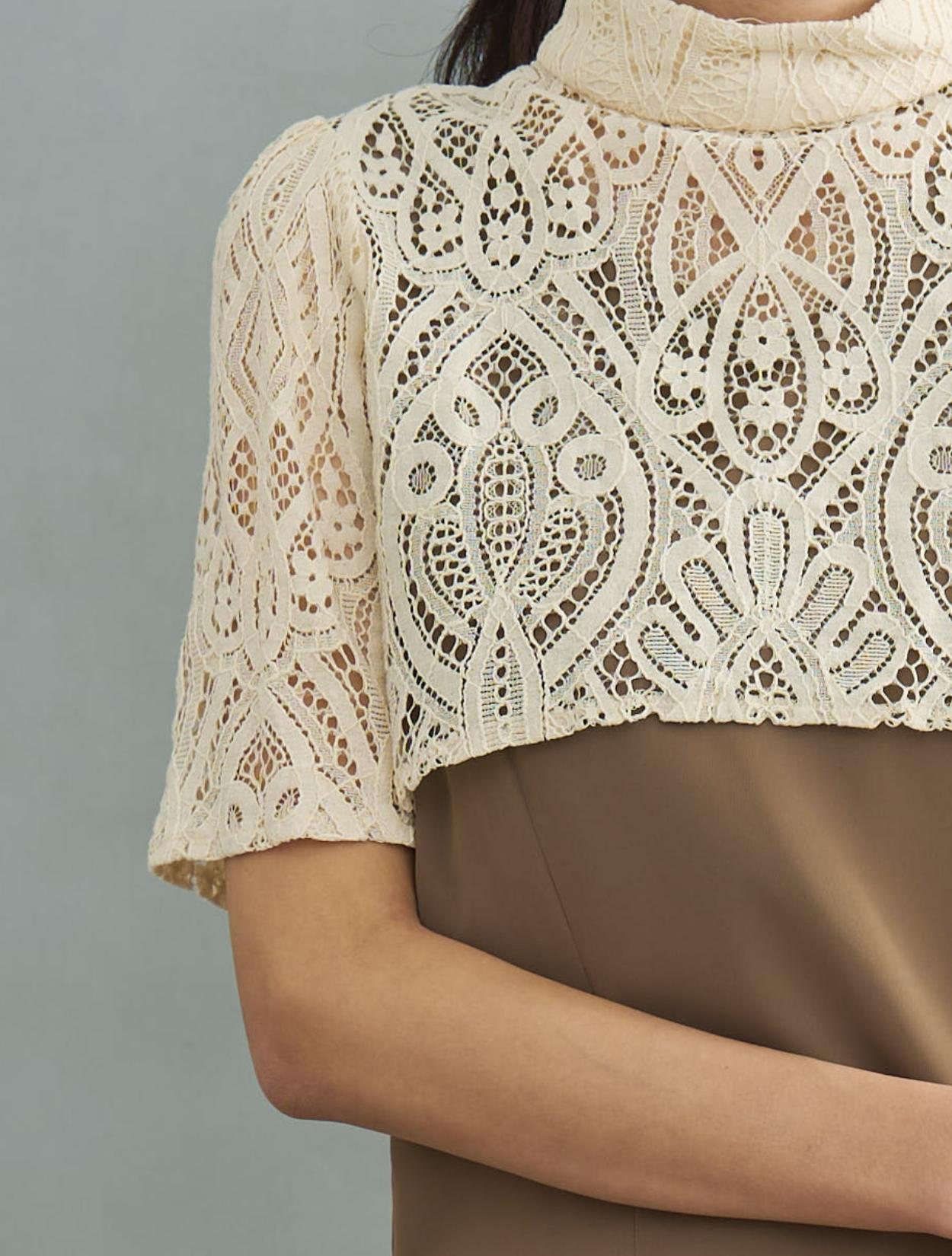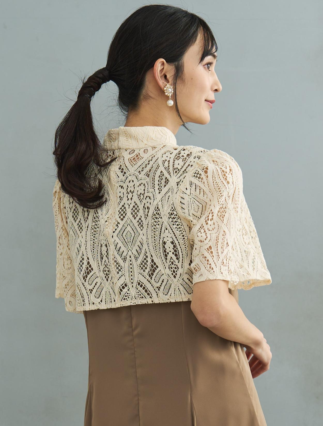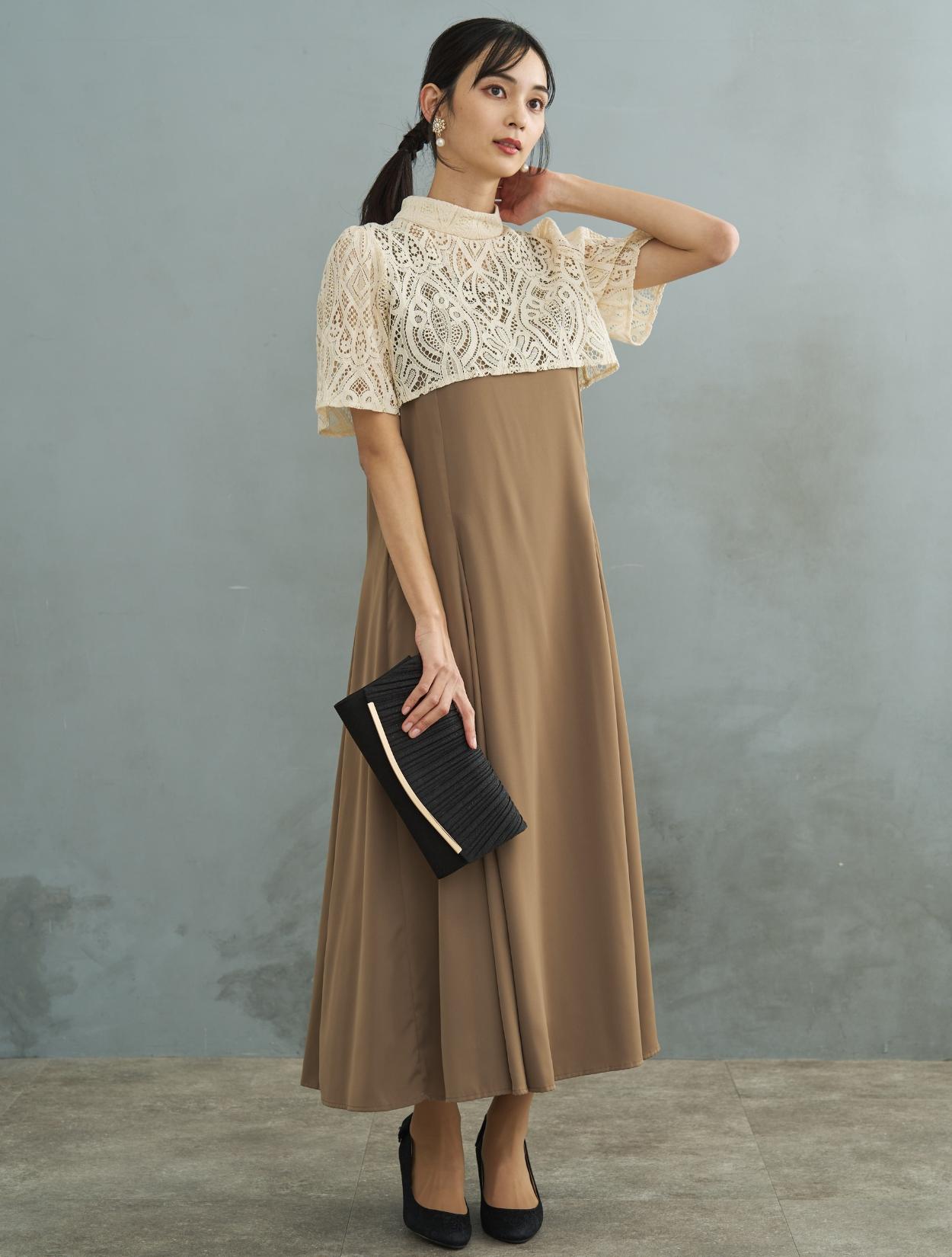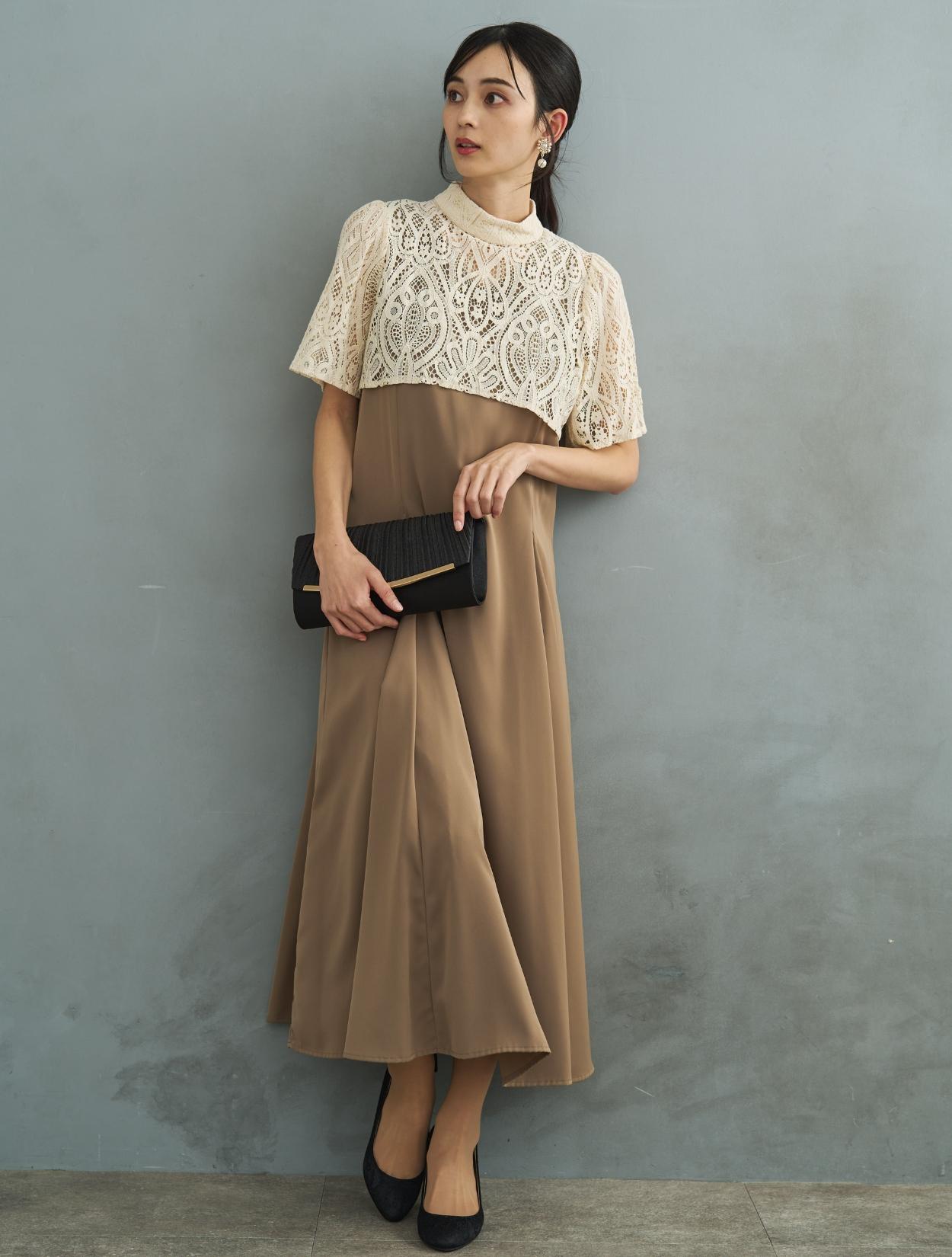 ショート丈のオーバーブラウスがセットになった、トレンド感のあるデザインのドレス。ロング丈ドレスでも、全体のポイントを上に持ってきているので、足長効果やスタイルアップ効果も抜群です。人気のマーメイドスカートのインナーワンピースには、微光沢があるのでお呼ばれにもぴったりなきちんと感もあります。ウエストからヒップにかけての、女性らしいキレイなラインも嬉しいポイント。オーバーブラウスのレースには程よい厚みがあり、透け感も気にならず上品に着こなせます。ハイネック風の首元ですが、ゆとりがあり締め付けは気になりずらいデザインです。デコルテ部分の露出は抑えて、ハーフスリーブからは肘下を大胆に出すバランスが◎。着崩れしないドレスなので、受付や代表スピーチなどを任されている方にもおすすめ。