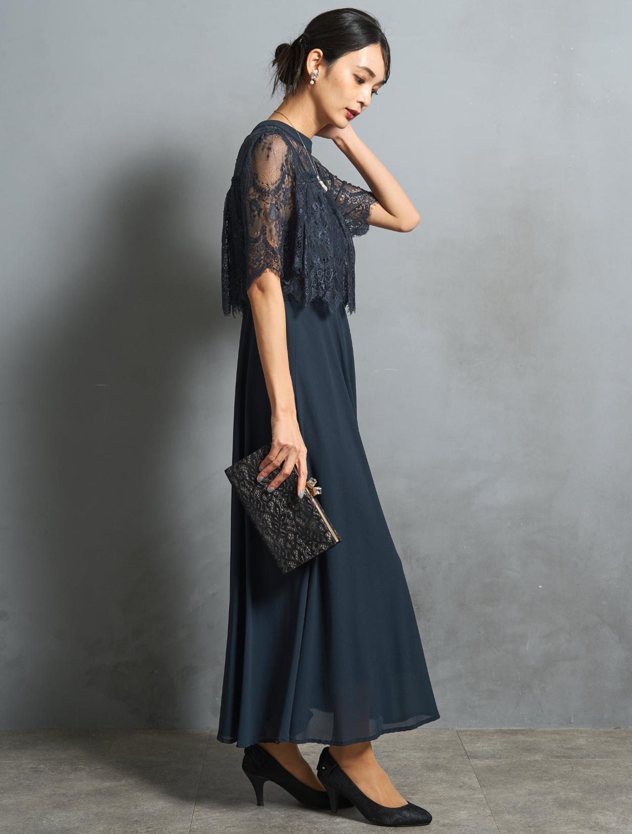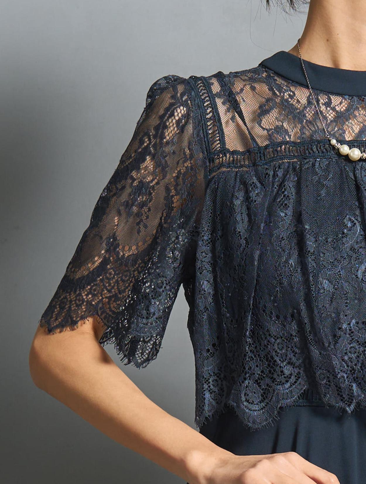 オーバーブラウス風のレースが華やかな印象のドレス。ふんわりとしたラインは、バストをきれいにカバーしてくれます。レースのお袖は長すぎないハーフスリーブ。肘下をしっかり出すことで抜け感が出て、ロング丈ドレスでも重たく見えません。レース部分の着丈は短めにデザインされているので、足長効果もありスタイルアップが叶います。ミニマルなスタンドネックは、露出を抑えてクラシカルで上品な印象に。