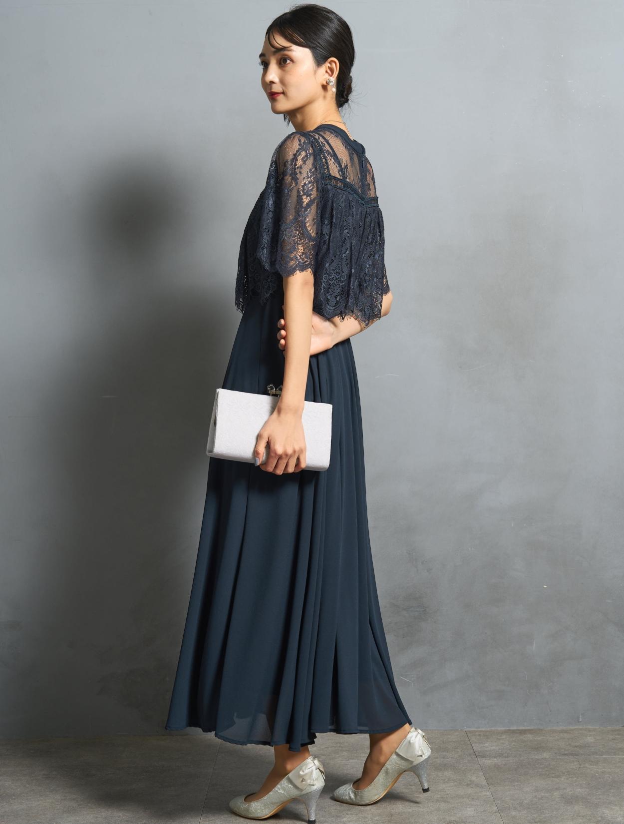 オーバーブラウス風のレースが華やかな印象のドレス。ふんわりとしたラインは、バストをきれいにカバーしてくれます。レースのお袖は長すぎないハーフスリーブ。肘下をしっかり出すことで抜け感が出て、ロング丈ドレスでも重たく見えません。レース部分の着丈は短めにデザインされているので、足長効果もありスタイルアップが叶います。ミニマルなスタンドネックは、露出を抑えてクラシカルで上品な印象に。
