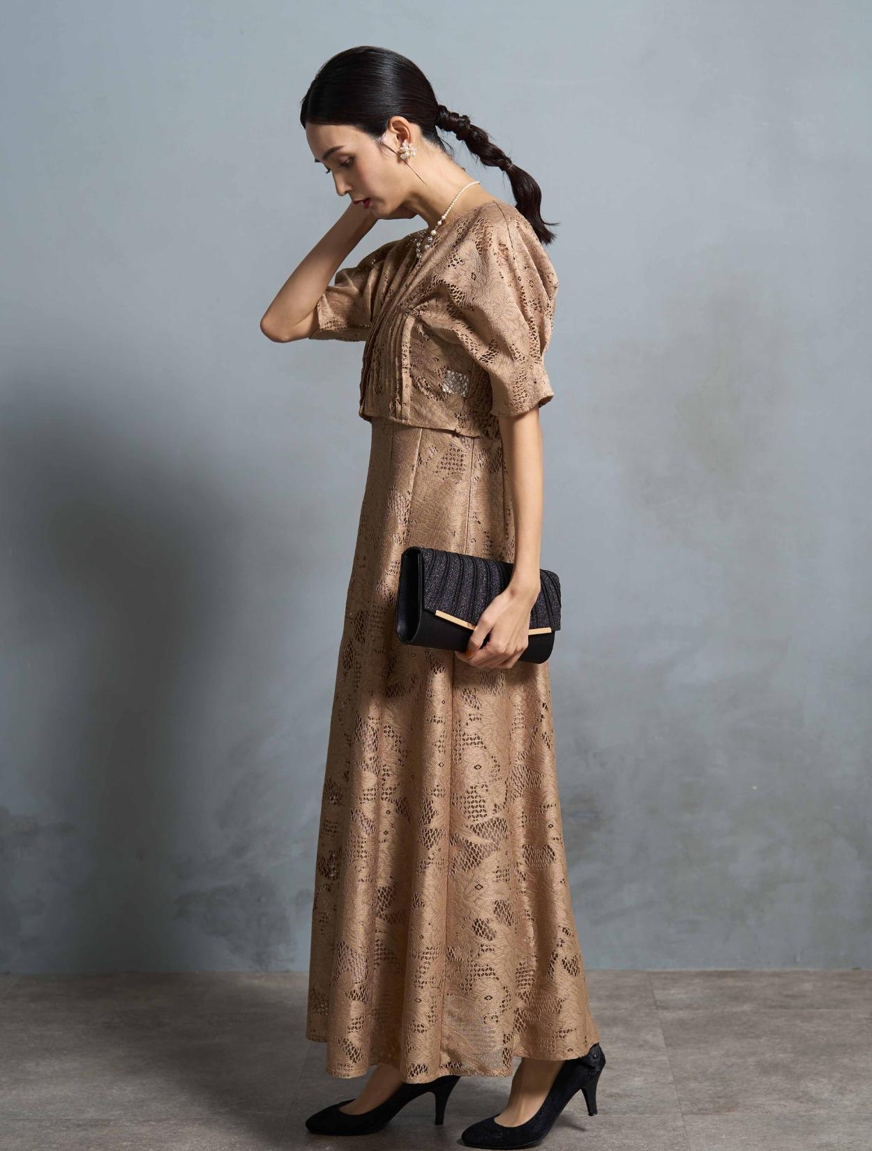 高級感のあるジャガード生地が目を惹くドレス。程よくハリのある生地のAラインフレアスカートは、すっきりとしたウエストからフワッと広がり、腰回りが気になる方でもキレイにカバーしてくれます。透け感が少ないドレスなので、ぜひ上品で清楚な着こなしを楽しんで下さい。共布のジャガードボレロが付いているので、露出やコーディネートの心配が不要なのも嬉しいポイント。アンサンブルの羽織付きドレスは、最近のドレスのトレンドでもあります。ボレロは前後どちらを前にしても着られる2wayタイプ。すっきり見えるVネック仕様は、ジャガード生地を軽やかに見せてくれます。立体感のあるパフスリーブに、キュッと細見えしてくれるシャーリング。女性らしい柔らかさとスタイルアップの両方を叶えてくれます。