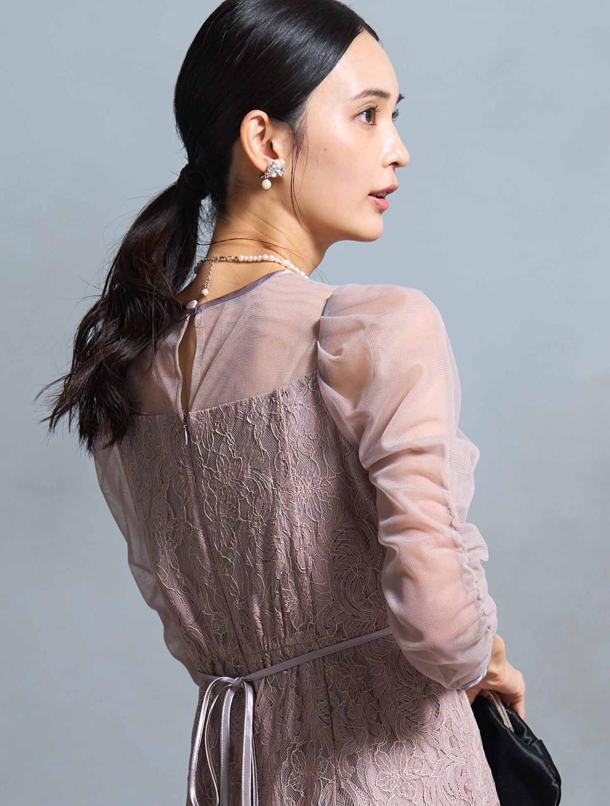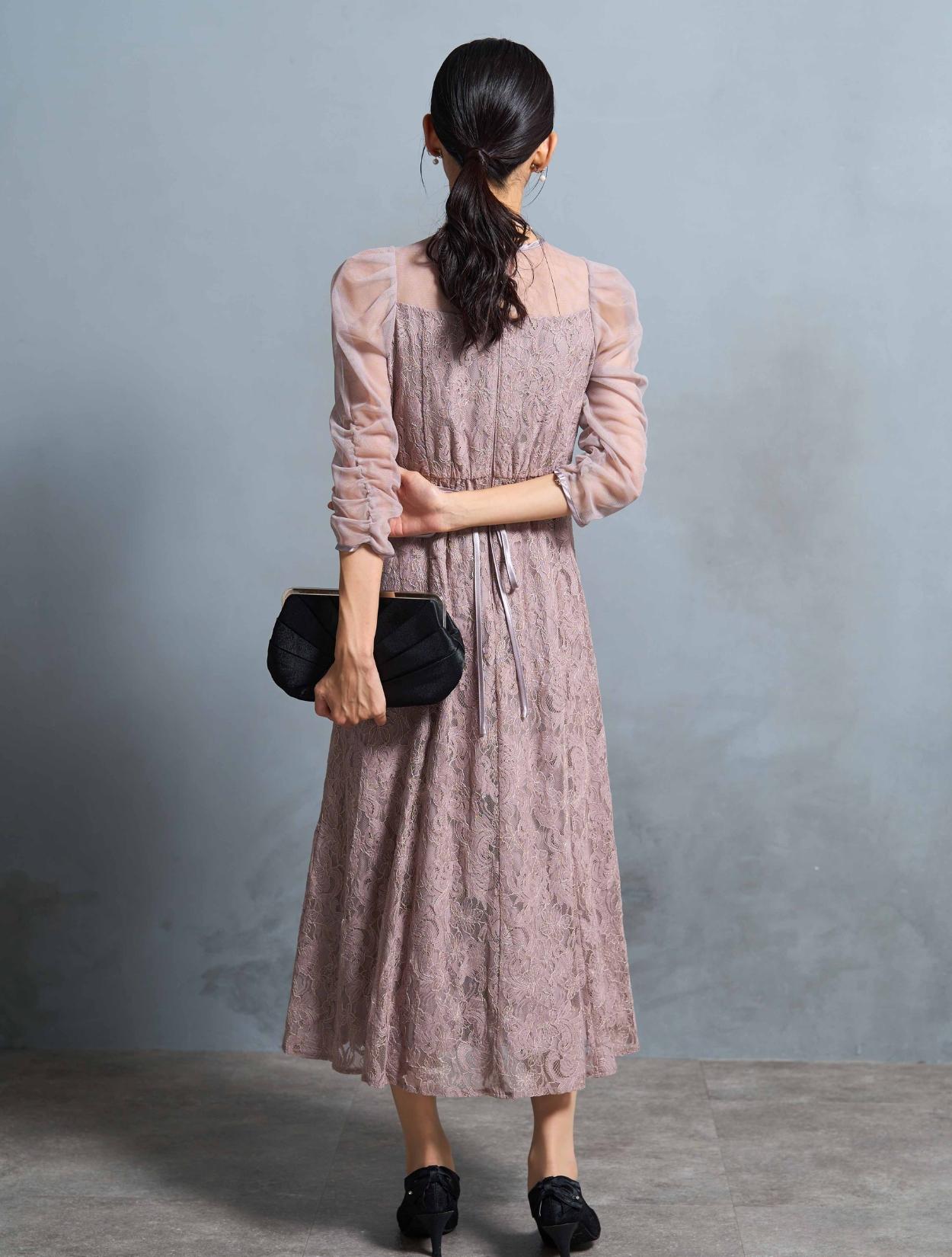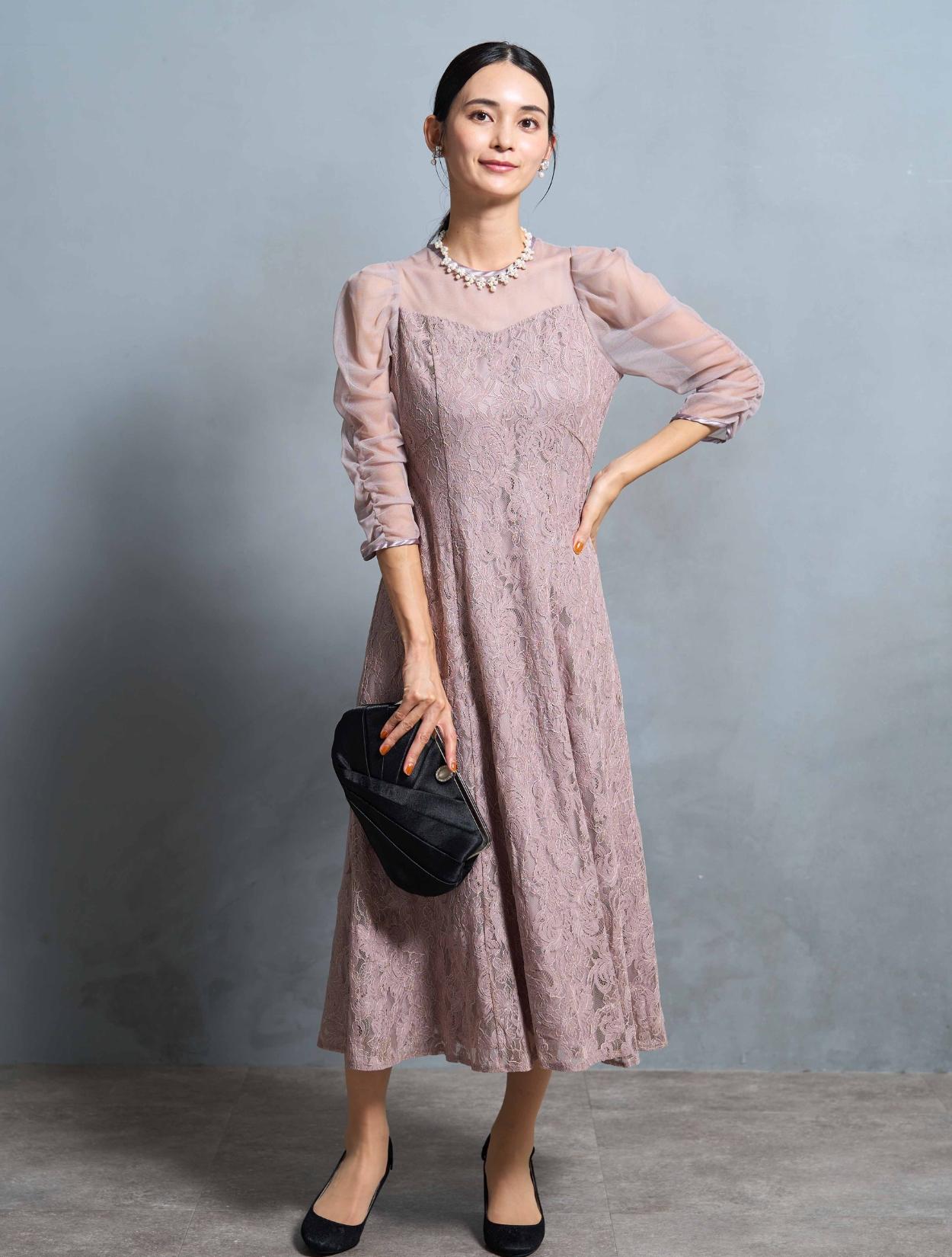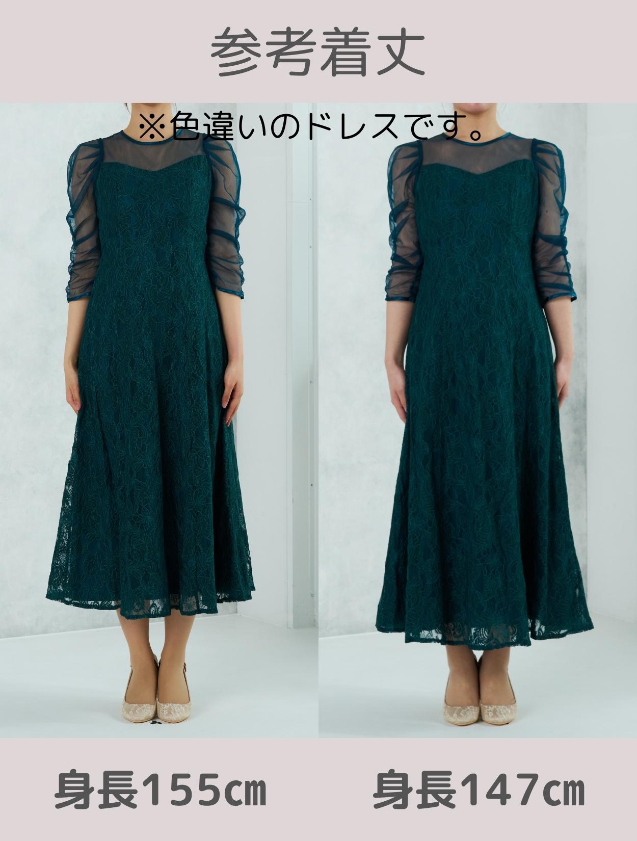 高級感のある上品なレースが目を惹くドレス。デコルテからお袖にかけてはシンプルなシアーチュールが使われているので、レースドレスでも甘くなり過ぎず幅広い年代におすすめです。ギャザーを寄せたお袖のデザインはお顔周りを華やかに見せてくれて、写真写りも良くSNS映えします◎。肩幅が気になる方でも着こなしやすい、控えめなボリューム感なのも嬉しいポイントです。ウエストには華奢なリボン紐が付いているので、キュッと絞って細身の方でもキレイに着こなせます。さりげなくウエストマークできるのでスタイルアップ効果もあり。首元も開きすぎないデザインなので、Sサイズや低身長の方でも着こなしやすいドレスです。ボリュームを落としたフレアスカートは、全体のバランスをすっきり大人っぽく見せてくれます。